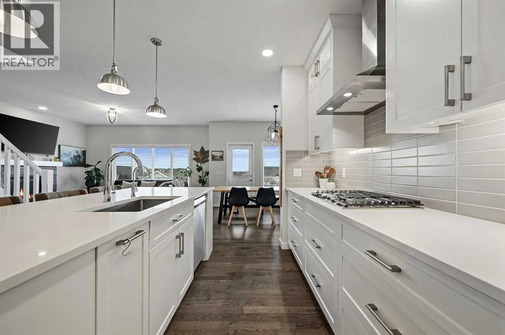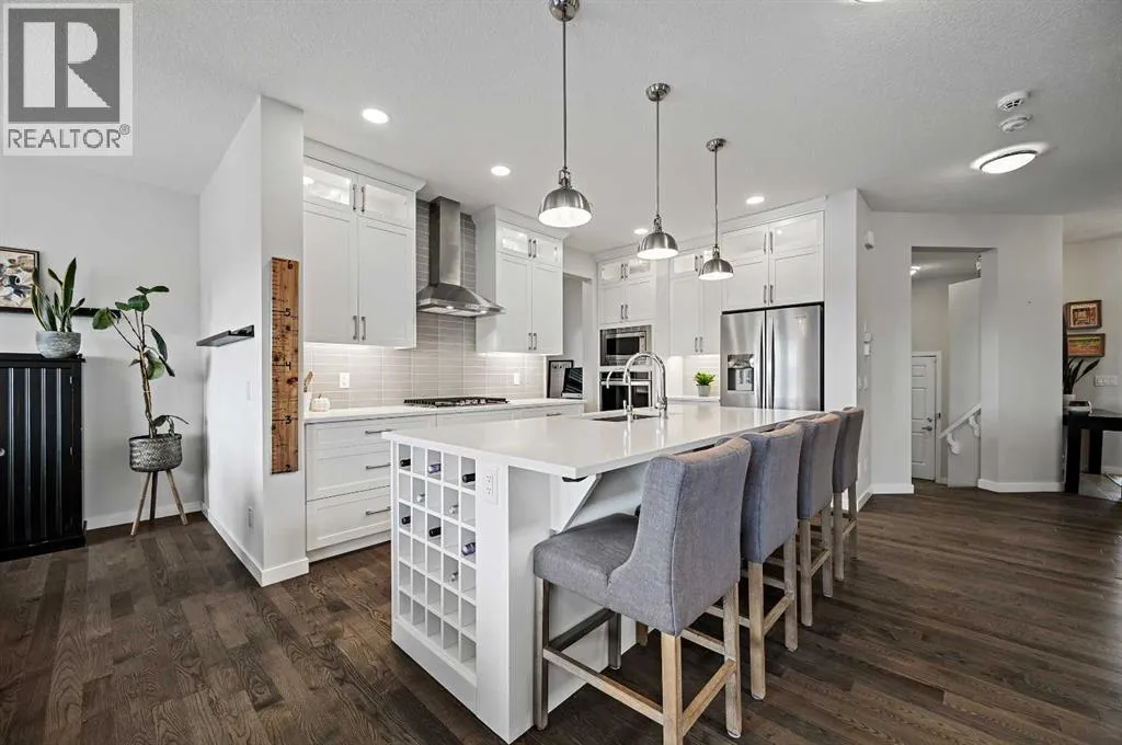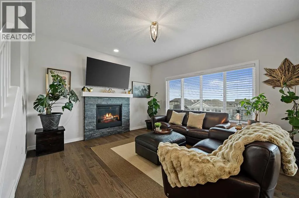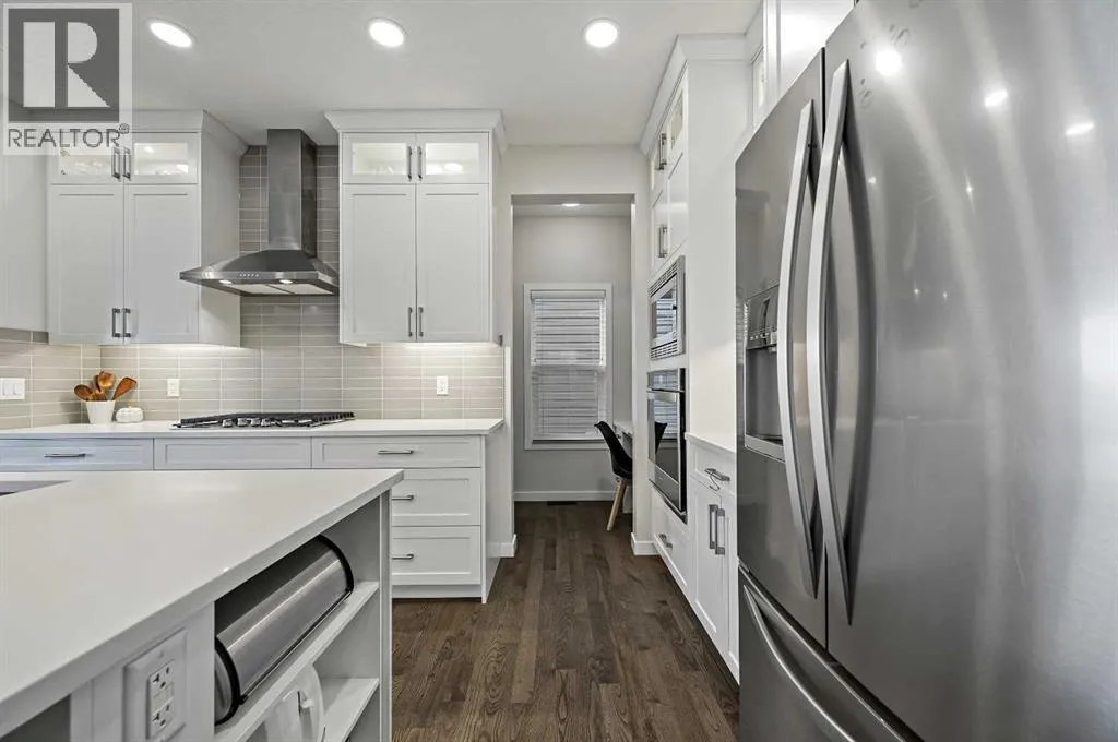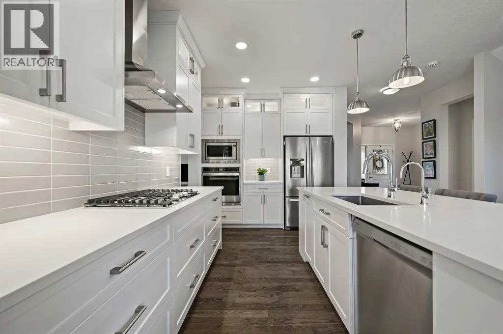 Luxury living meets everyday functionality in this extensively upgraded 5-bedroom, 4-bathroom modern two-storey WALK-OUT, TRIPLE GARAGE home backing directly onto pathways, no "fish bowl" here! You even get some beautiful MOUNTAIN views!Offering 3,384 sqft of total developed living space on a 4,724 sqft WALK-OUT lot, this Hillcrest home combines thoughtful design with premium finishes throughout.The main floor features 9â ceilings, designer lighting, and a striking stone-surround gas fireplace. The chef-inspired kitchen is a showpiece with a massive flush quartz island with built-in wine storage and seating for four, full-height cabinetry with glass upper doors including accent lighting and under-cabinet lighting, farmhouse under-mount stainless steel sink, gas cooktop stove, built-in wall oven and microwave, chimney-style hood fan, tile backsplash, and a large pantry. A tucked-away tech space/drop zone behind the kitchen offers the perfect homework or work-from-home station. The sunk-in mudroom includes built-in lockers and bench seating for organized family living.Upstairs youâll find four bedrooms â ALL with WALK-IN CLOSETS â plus a large central bonus room with VAULTED ceilings, ideal for family movie nights or a kidsâ retreat. The spacious primary suite features a TRAY ceiling, separate recessed (dimmable) pot lights and large walk-in closet with built-ins. The luxurious 5-piece ensuite offers dual sinks with a raised vanity, standalone soaker tub, and a fully tiled shower with additional wand/control. A second 5-piece bathroom serves the additional bedrooms with a separate pocket door to the tub/shower and toilet for added convenience and functionality.The fully developed walk-out basement offers a large recreation area, fifth bedroom, 4pc bathroom, 2 storage rooms and direct access to the recently landscaped backyard that opens seamlessly to the pathway system leading to multiple parks, schools, shopping and more! The large upper deck finished in Dura dek gives the bottom stone patio coverage for those rainy spring days ahead.Enjoy the elevated glass-panel deck finished with duradek, has a BBQ gas line and unobstructed views overlooking the green space. The TRIPLE tandem garage provides exceptional parking, storage, and workspace flexibility.Additional upgrades include: Dual-zone high-efficiency furnace, high-efficiency water heater, reverse osmosis system, water softener and load management system to meet all current required codes.Located close to schools, parks, playgrounds, pathways, shopping, restaurants, and medical services â this exceptional Airdrie WALK-OUT home delivers space, storage, privacy, and refined comfort in one of the cityâs most desirable family communities. (id:27476)