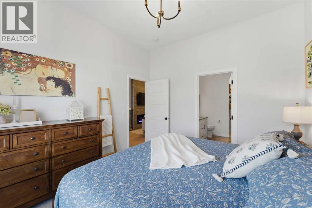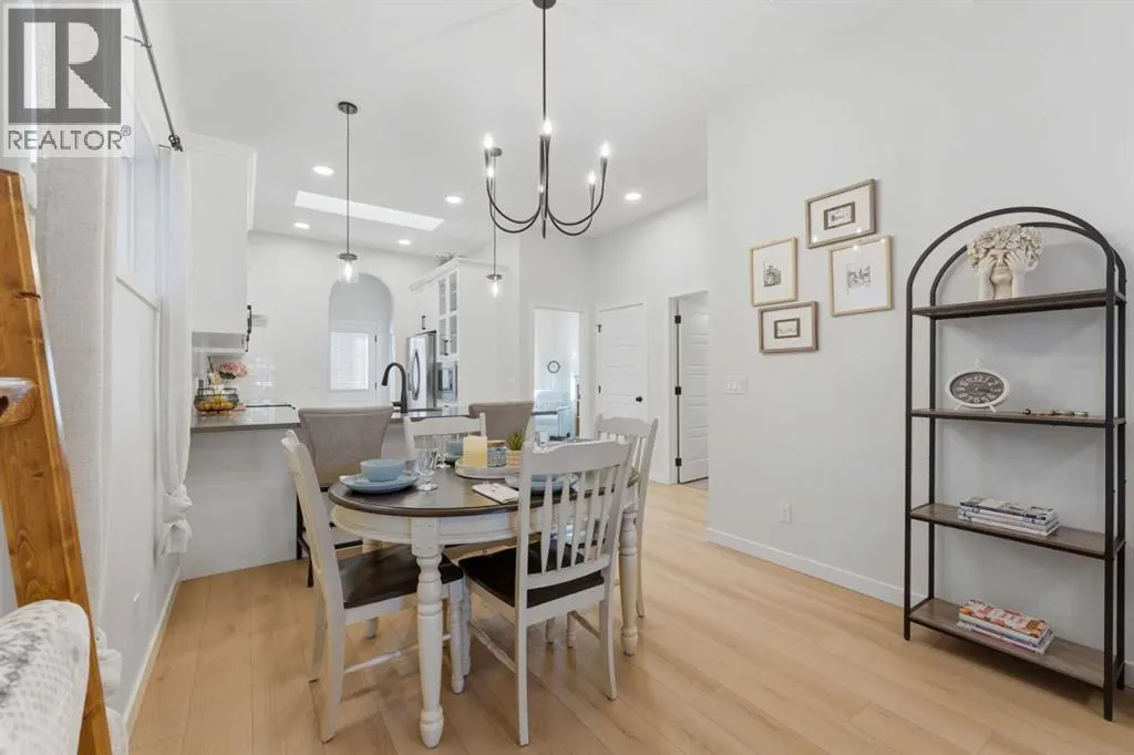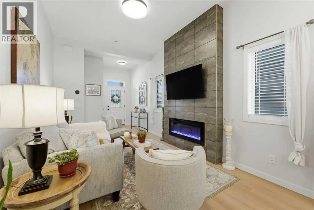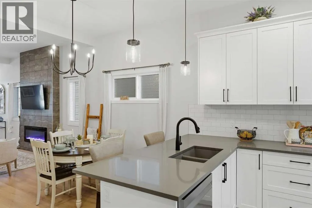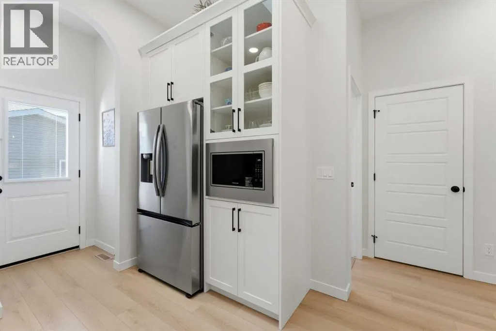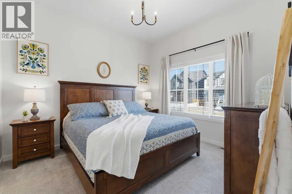 Welcome to an exceptional laned bungalow tucked into the award-winning community of Coopers Crossing in Airdrie where timeless design meets modern comfort in all the right ways.From the moment you arrive, this home makes a statement. Its charming laned configuration allows for a clean, welcoming front façade, while the rear double garage keeps the streetscape elegant and uncluttered. The low-maintenance landscaping frames the property beautifully, offering year-round curb appeal without demanding your weekends. Thoughtfully designed pathways and tidy greenery create a polished first impression that only gets better once you step inside.Open the front door and youâre greeted by soaring 10-foot ceilings on the main floorâan architectural feature that instantly enhances the sense of space and light. The expansive height amplifies every detail, from the modern lighting fixtures to the oversized windows that bathe the home in natural sunshine. The result is an airy, uplifting atmosphere that feels both luxurious and inviting.A Kitchen Designed to Impress. At the heart of the home lies a custom kitchen crafted for both everyday living and memorable entertaining. Beautiful cabinetry, sleek countertops, and thoughtful storage solutions combine style with functionality. A full set of appliances ensures youâre ready to host everything from intimate dinners to holiday gatherings. Whether youâre preparing a quiet morning coffee or a gourmet feast, this kitchen is as inspiring as it is practical.Above, a skylight draws in streams of natural light, adding warmth and brightness throughout the day. Itâs the kind of detail that subtly transforms the mood of the entire living spaceâsunshine by day, soft stargazing ambiance by night.Comfortable & Cozy Living SpacesThe living area is anchored by a striking electric fireplace, offering both visual charm and effortless warmth. Itâs the perfect focal pointâideal for cozy winter evenings or simply adding a touch of elegance to the ro om year-round.To ensure comfort in every season, the home is equipped with a central AC unit, keeping the interior refreshingly cool during Albertaâs warm summer months. Combined with the homeâs thoughtful design, this creates an environment that feels just right, no matter the weather outside.Thoughtful Bedroom & Bathroom LayoutThis bungalow features 2 spacious bedrooms and 2 full bathrooms, all conveniently located on the main level for easy living.The primary suite is a private retreatâgenerous in size and designed for relaxation. Large windows provide natural light, while the adjoining full ensuite offers a spa-like experience with quality finishes and ample space to unwind.The second bedroom is perfect for guests, family, or even a stylish home office. A second full bathroom ensures comfort and privacy for everyone.Outdoor Living at Its FinestStep outside to discover a large rear deckâan extension of your living space thatâs ideal for summer barbecues, morning coffee rituals, or quiet evenings (id:27476)
