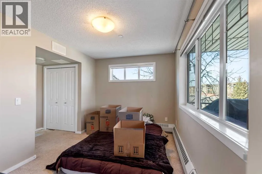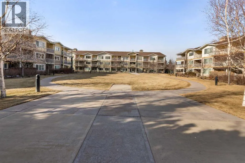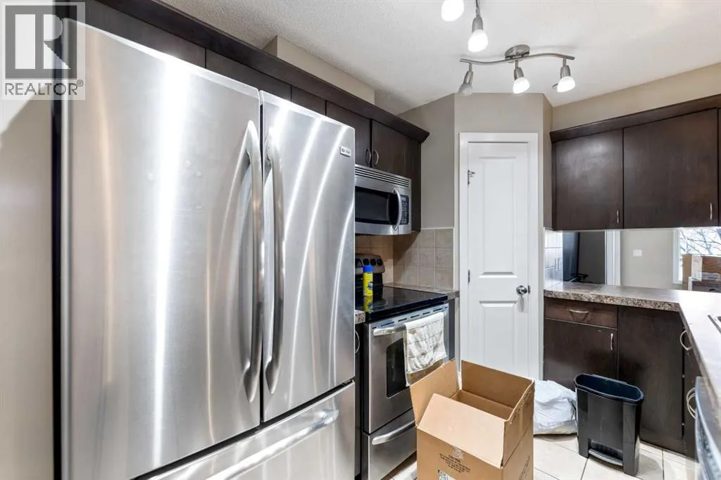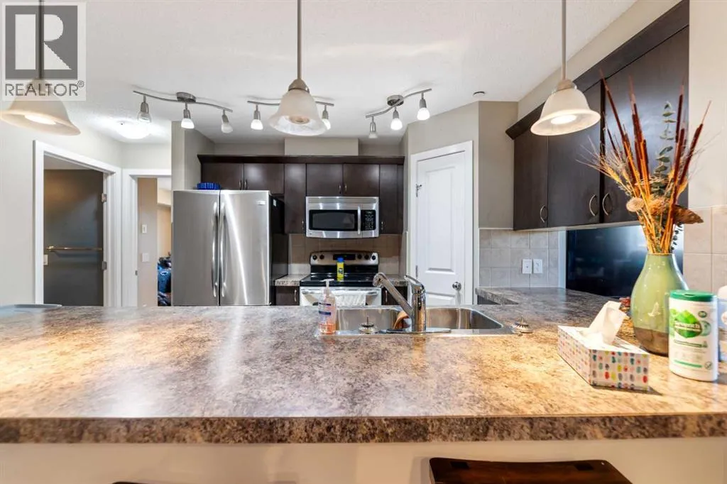 Welcome to this bright and well-designed apartment condo located in the desirable community of Kingâs Heights in Airdrie. This second-floor corner unit offers approximately 860 sq ft of comfortable living space, featuring 2 bedrooms and 2 full 4-piece bathrooms, including a private ensuite off the primary bedroom. The open-concept layout seamlessly connects the living room, dining area, and kitchen, creating an inviting space for everyday living and entertaining. The kitchen offers ample counter space, plenty of cabinetry, and a convenient sit-up breakfast bar. Large windows throughout the unit fill the home with natural light, while a patio door leads to the covered balcony, complete with a gas hookup for your BBQ. The thoughtfully designed floor plan places the bedrooms on opposite sides of the unit, providing added privacy, with the primary bedroom showcasing a walk-through closet. This unit also includes one titled parking stall and an assigned storage unit for added convenience. Ideally located close to schools, parks, playgrounds, shopping, restaurants, and with quick access to Highway 2 for easy north or south commuting, this property is perfect for first-time buyers, downsizers, or as a smart addition to your rental portfolio. (id:27476)