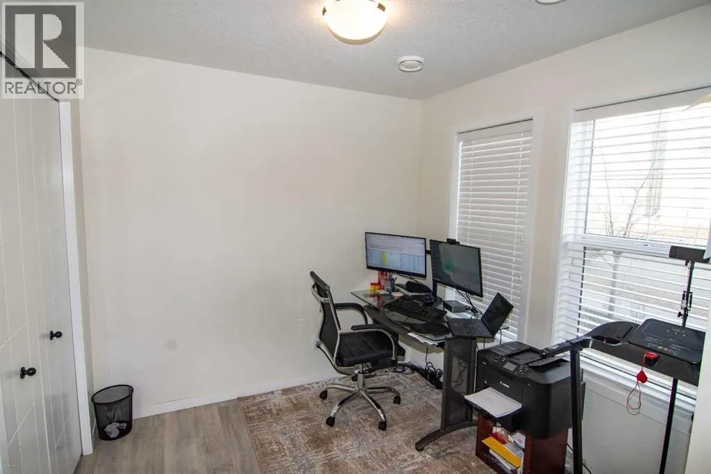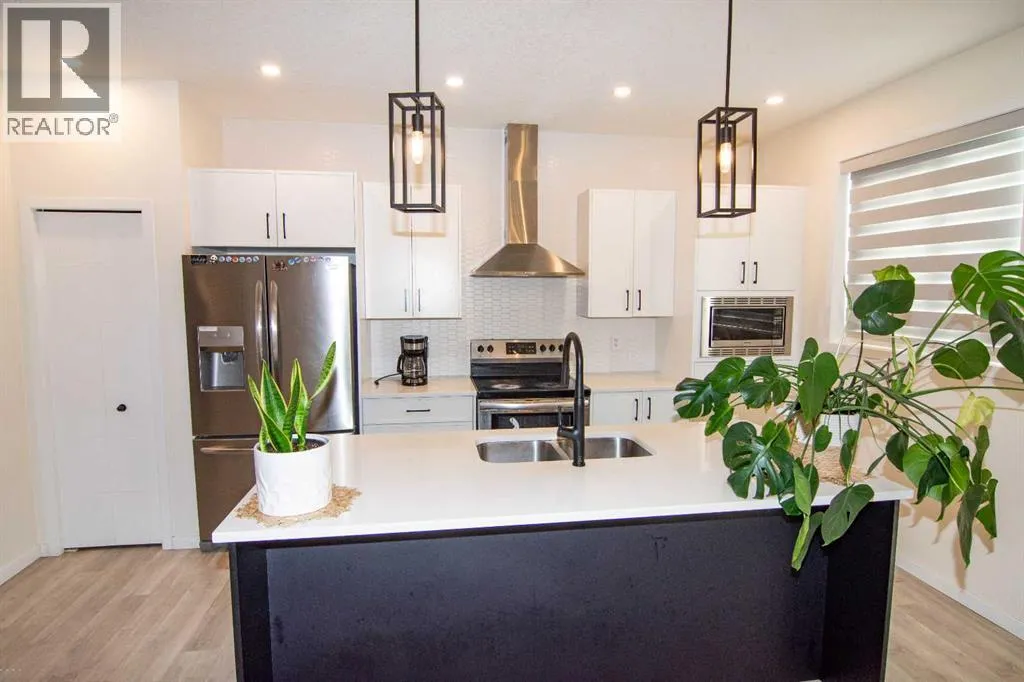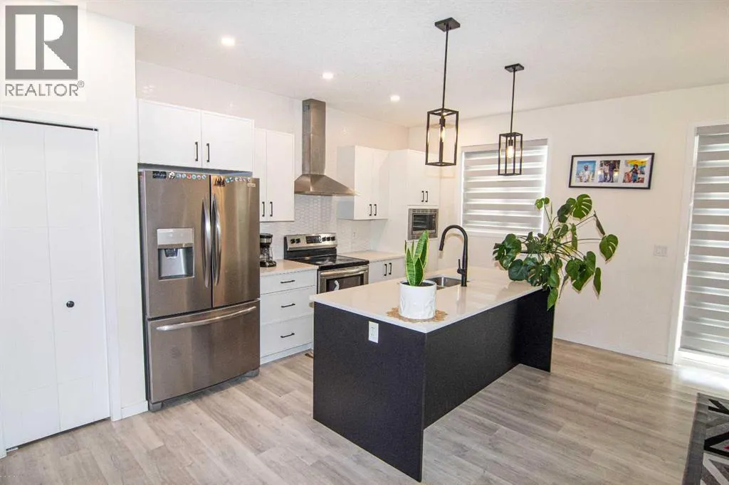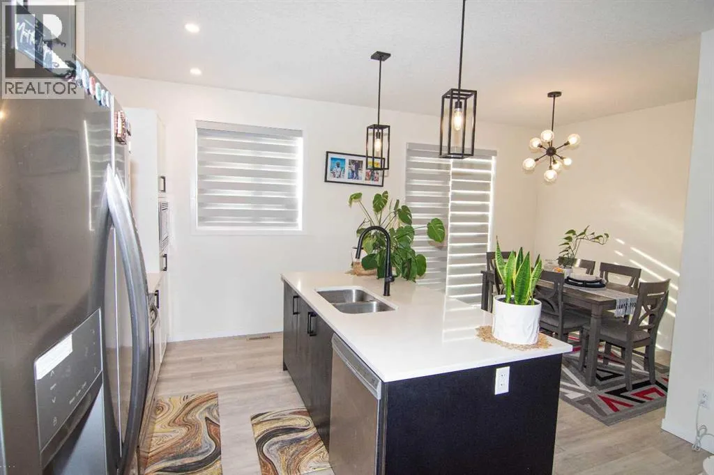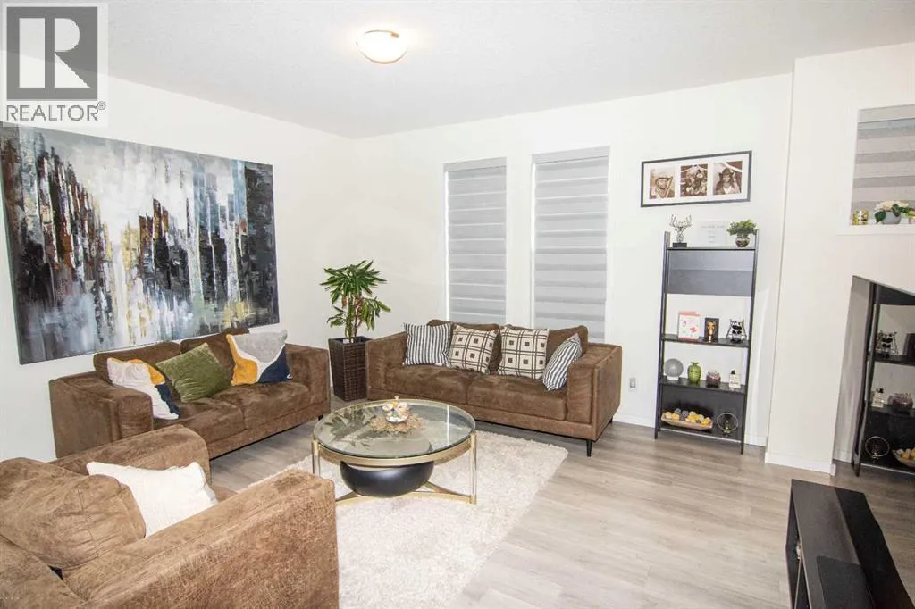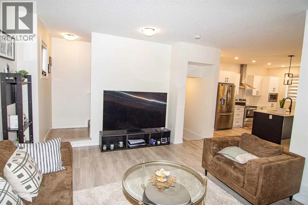 Welcome to this impeccably maintained townhouse in the highly sought-after SouthPoint Park community of SW Airdrie. Offering 3 bedrooms, 2.5 bathrooms, and a versatile lower-level flex space, this residence seamlessly blends modern style, thoughtful design, and everyday comfort.Step inside to a bright, open-concept layout designed for both functionality and elegance. The lower level features a spacious flex areaâideal for a home office, fitness studio, media room, or play spaceâproviding flexibility to suit your lifestyle needs.The main level showcases beautiful vinyl plank flooring throughout and an effortless flow between living spaces. At the heart of the home is a stunning white kitchen accented with striking black finishes. Designed with both form and function in mind, it features a generous centre island, sleek stainless steel appliances, quartz countertops, and a dramatic full-height tile backsplash. Ample cabinetry and counter space make this kitchen perfect for everyday living and hosting gatherings alike.Across from the kitchen is a spacious dining area with direct access to a private balconyâan inviting extension of your living space. Adjacent, the comfortable and well-proportioned living room offers the perfect setting to relax or entertain. A convenient powder room completes this level.On the upper level, the primary suite provides a private retreat, complete with a 3-piece ensuite. Two additional well-sized bedrooms, a full bathroom, and the convenience of upper-level laundry complete the upper floor.The attached double garage offers both practicality and additional storage, while the spacious balcony creates an ideal outdoor escape for morning coffee or evening relaxation.Ideally located just steps from schools, playgrounds, and everyday amenities, this home presents an exceptional opportunity for families and modern buyers alike. With its strategic location, thoughtful layout, and outstanding value, this turnkey residence delivers comfort , convenience, and lifestyle in one exceptional package.Donât miss your chance to make this property your own â schedule a private showing or connect for early access today!??? (id:27476)