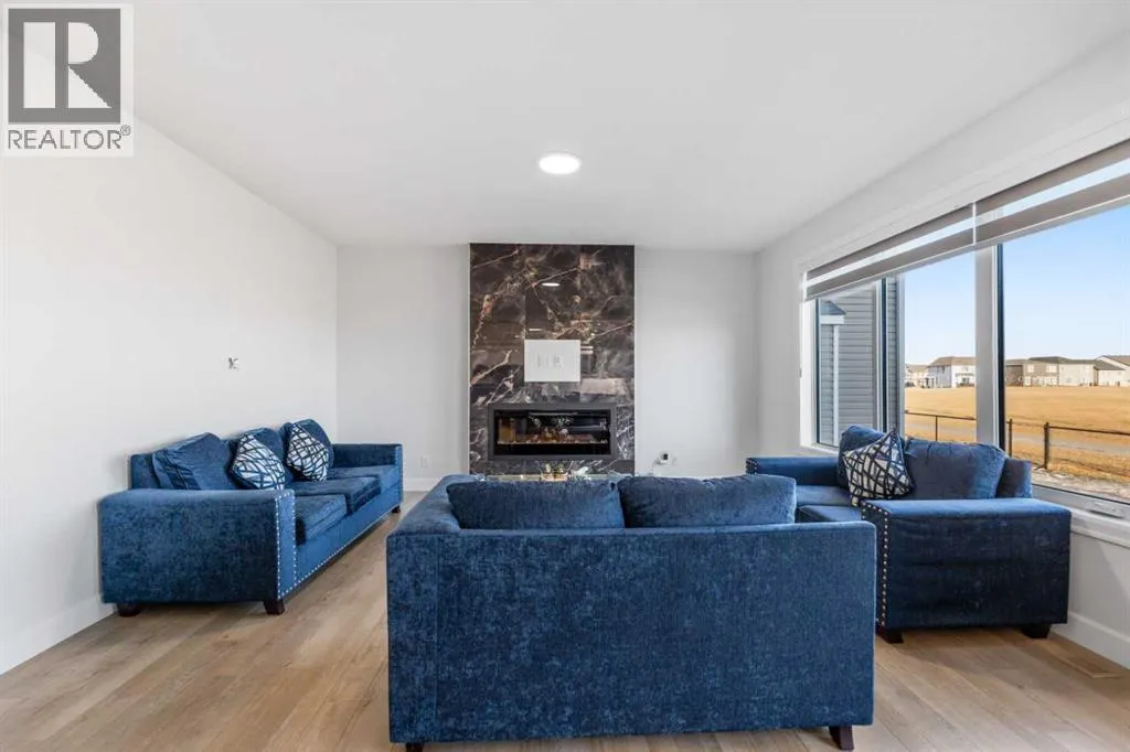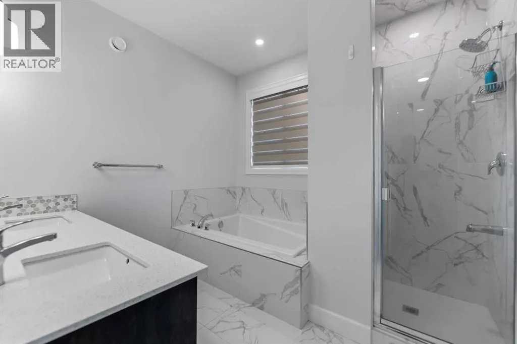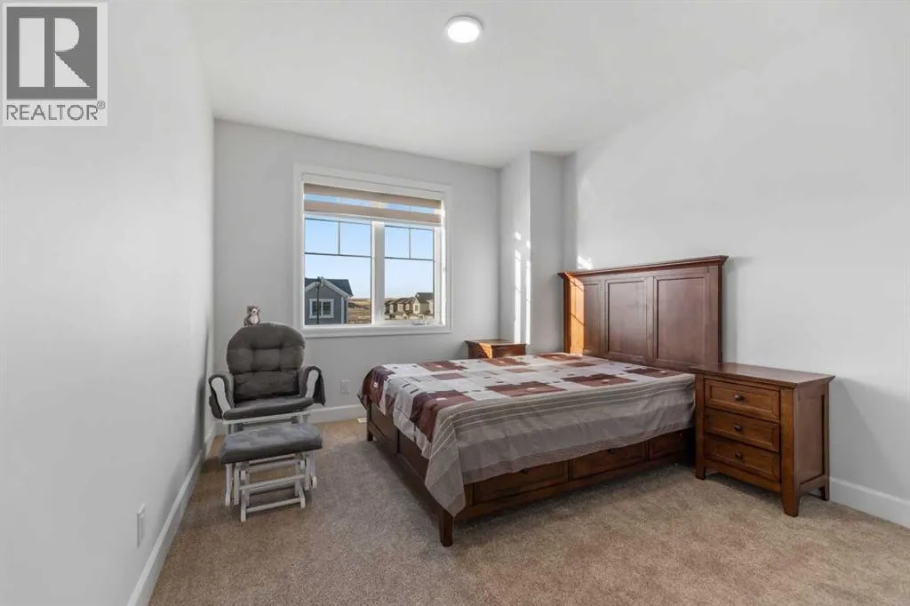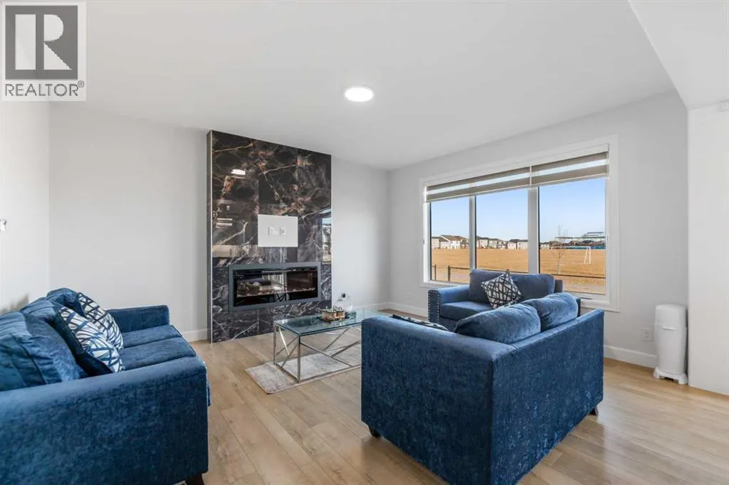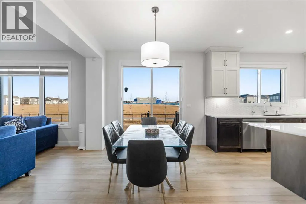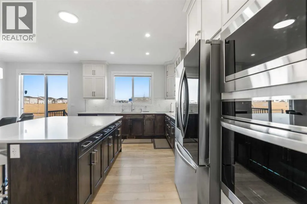 Welcome to 1116 Southwinds Green SW in Southwinds, Airdrie! Backing onto green space and a school, this upgraded 5-bedroom, 4 full-bathroom home offers approx. 2,800 sq. ft. above grade with over $200K in builder upgrades. Situated on a premium deep lot with an oversized backyard and separate basement entry. The main floor bedroom with full bathroom and two primary suites upstairs are thoughtfully designed. All three levels feature 9â ceilings and 8â doors. The open-concept main floor home includes upgraded luxury vinyl plank flooring, upgraded tile and carpet, triple-pane windows with motorized blinds, and a spacious living room with electric fireplace. The fully upgraded kitchen showcases two-tone cabinetry, built-in upgraded stainless steel appliances, electric cooktop, gas line rough-in, upgraded quartz countertops, large island, silgranit sink with soap dispenser, RO system, garburator, and walk-in pantry. Main-floor bedroom and full bath with standing shower ideal for guests or multi-generational living. Large mudroom adds functionality with ample storage space.Upstairs offers a huge bonus room, two primary suites each with walk-in closets and ensuites with dual sinks and large showers, plus two well sized additional bedrooms and full bath. Upper laundry with stackable washer/dryer and utility sink rough-in for future needs.Smart home with Wi-Fiâcontrolled appliances, lights, and garage door. Basement includes two legal-size windows and plumbing rough-in for future development.Premium green space location, front porch charm, and exceptional upgrades make this a rare opportunity in family-friendly Southwinds. (id:27476)