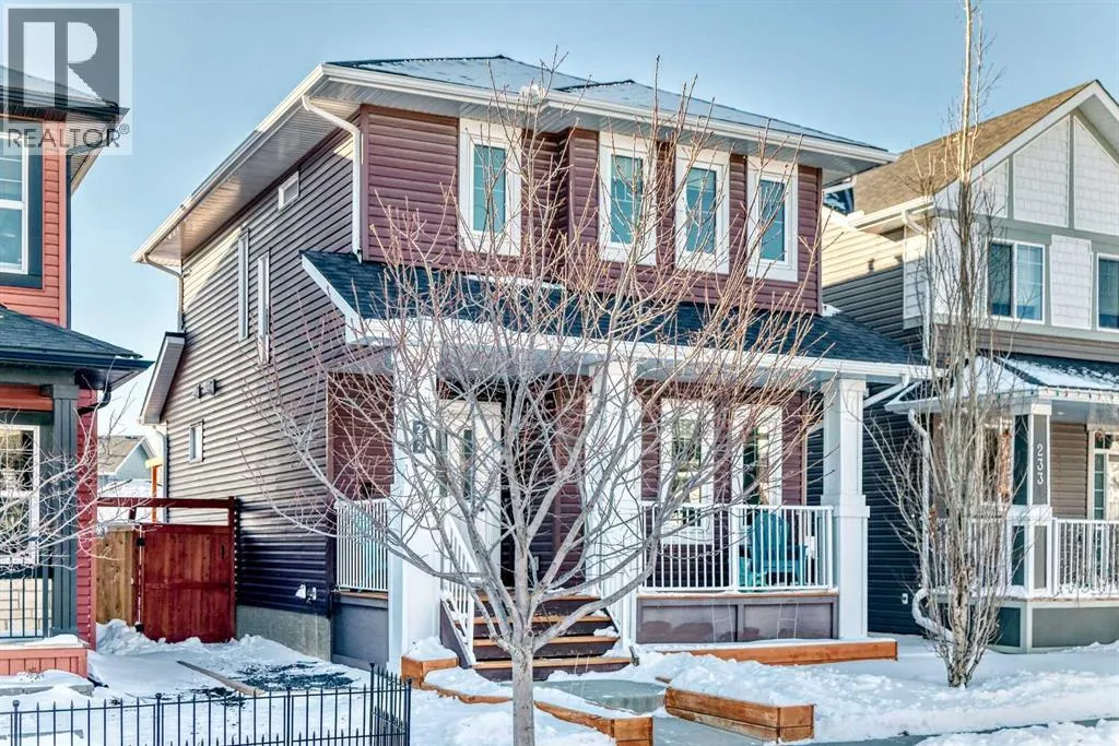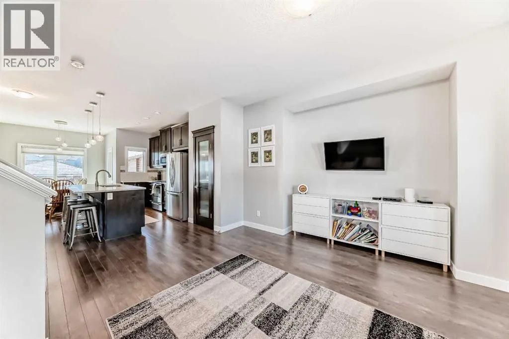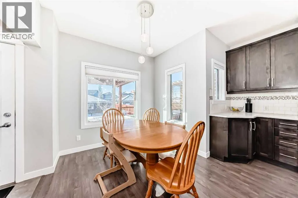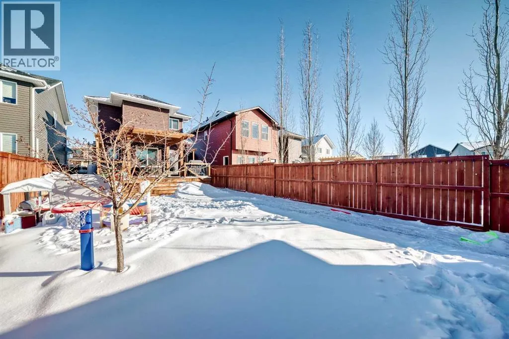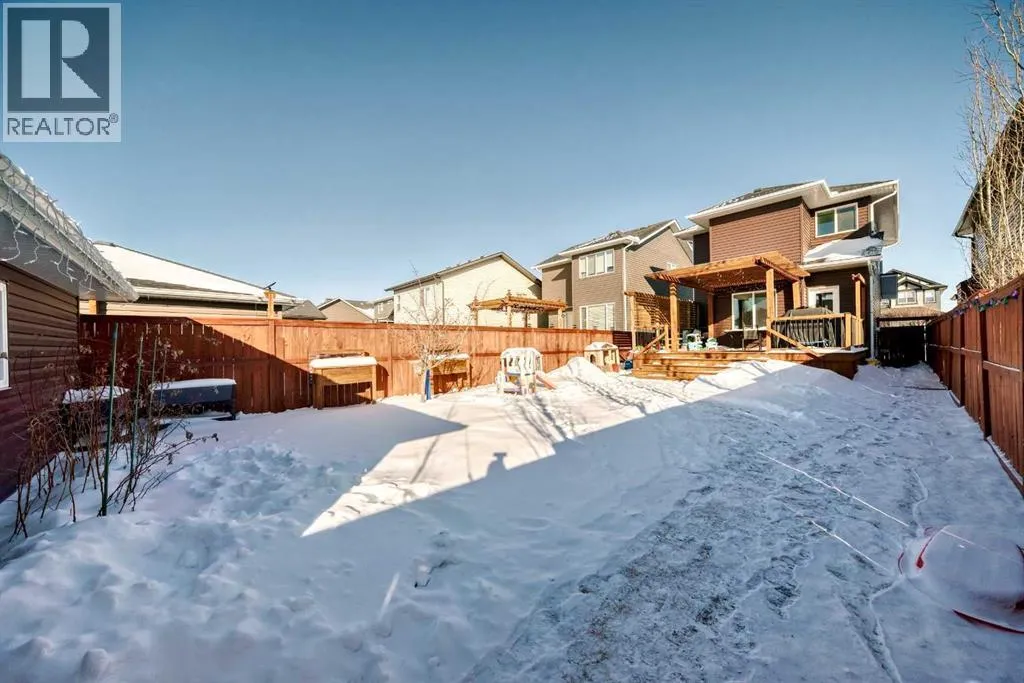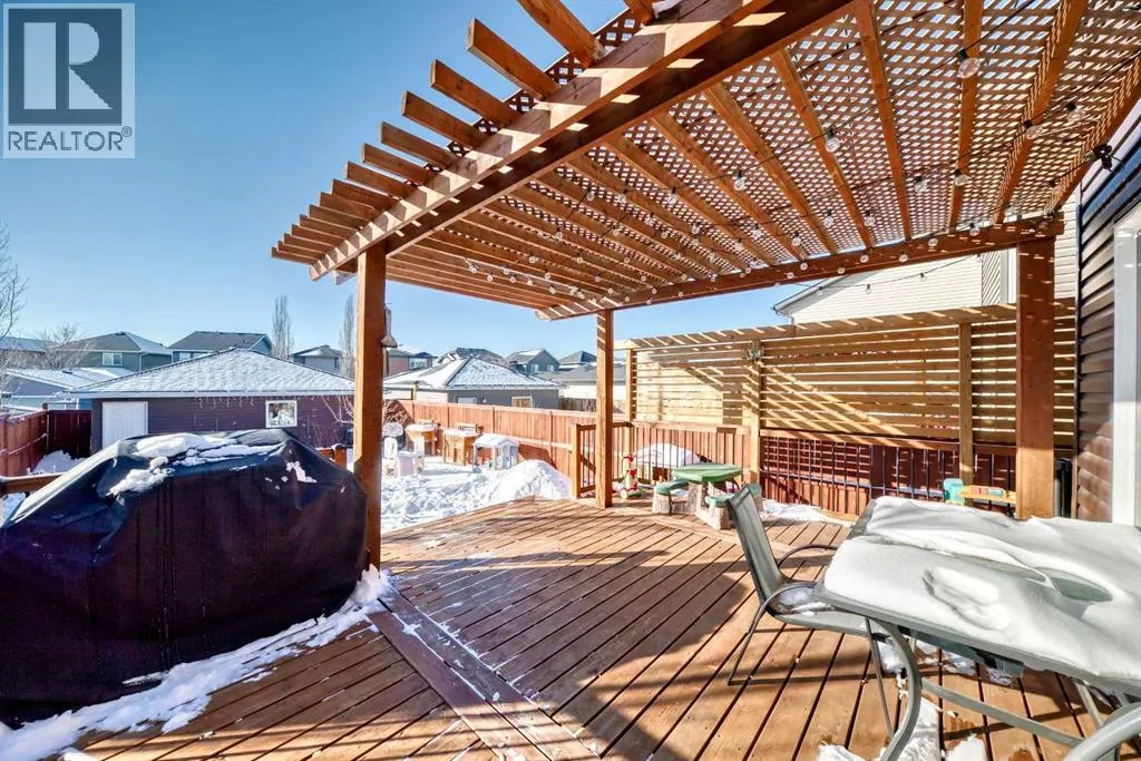 Perfect home for first time owners or a growing family, 2015 vintage 3+ bedroom 2 storey in Airdrie's district of Ravenswood. Lovely curb appeal with covered veranda. Upgraded wood laminate flooring on main floor with tiled front and rear entries. Large and spacious kitchen with 8 foot working island, separate pantry, 9 ft ceilings and tall cabinetry, dining room nook over looks rear yard, spacious great room expanding into flex space/dining area before kitchen area, main floor laundry room with storage space. 3 Bedroom upstairs, 4 pce ensuite plus 4 pce for other bedrooms, All bedrooms have walk-in closets. Huge lot (142 ft+ long lot with sunny western exposure). Rear yard b. house and garage is about 65 ft long and 30 ft wide., lots of room for children or adults to play. Huge 16 ft X 18 ft wood deck with pergola, small decorative rocked side yards for low maintenance or dog run. Completely fenced lot. Basement fully dev'd with 9 foot ceilings, raised floors with laminate flooring, an office/bedroom, large recreation room, large storage room. High efficient furnace, A/C, over sized water heater. Oversized double garage 24 ft wide and 22 ft deep. Large lots are rare without backing onto busy locations. (id:27476)
