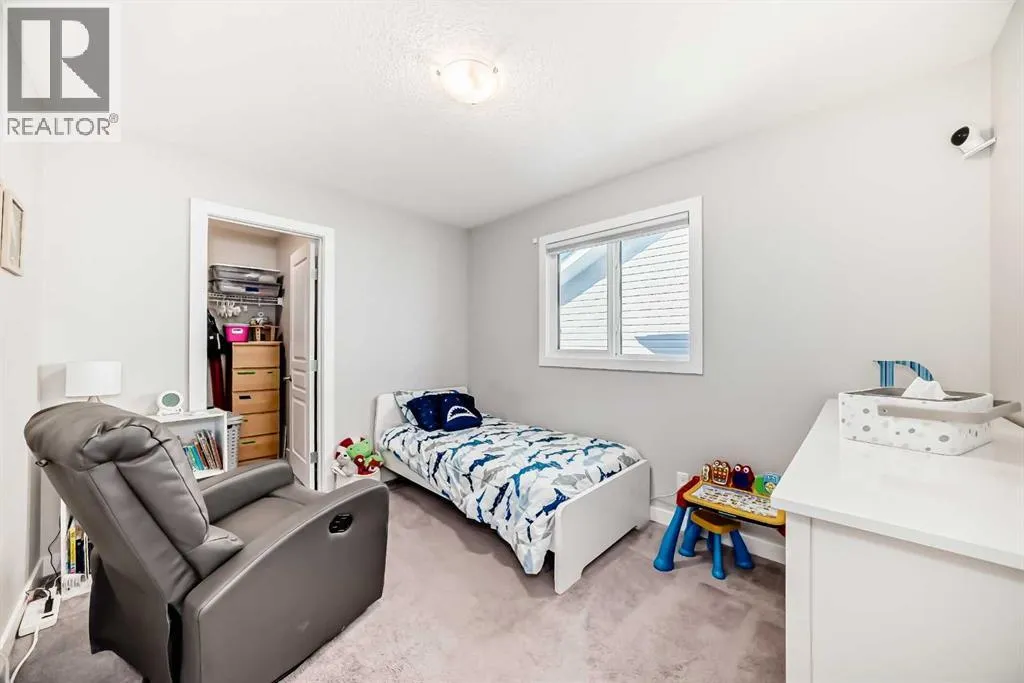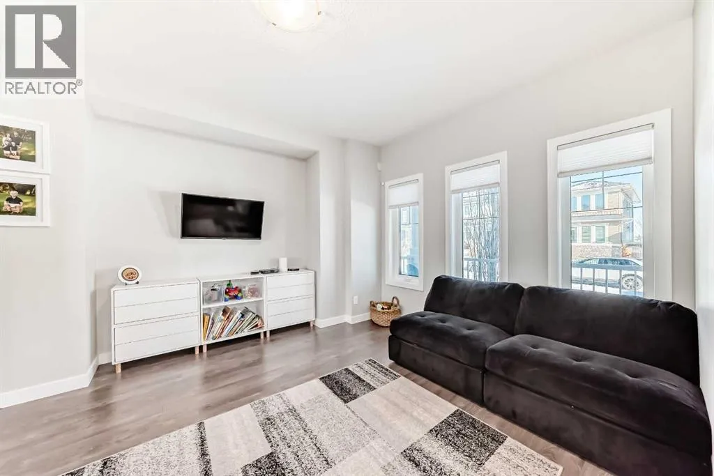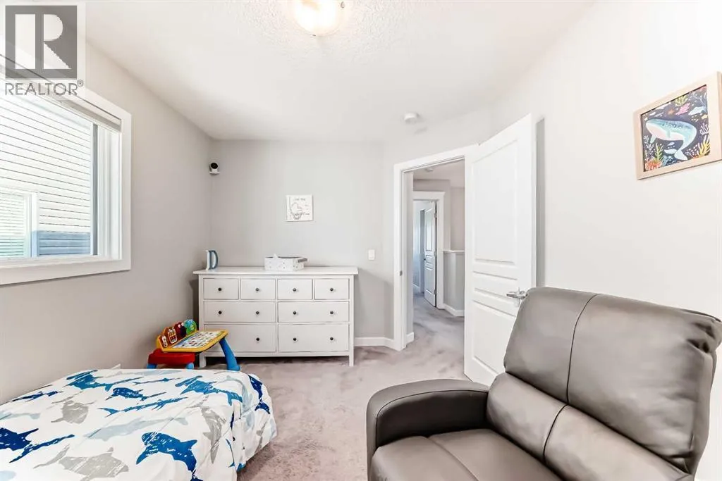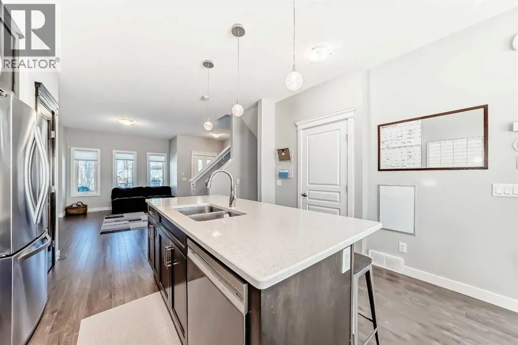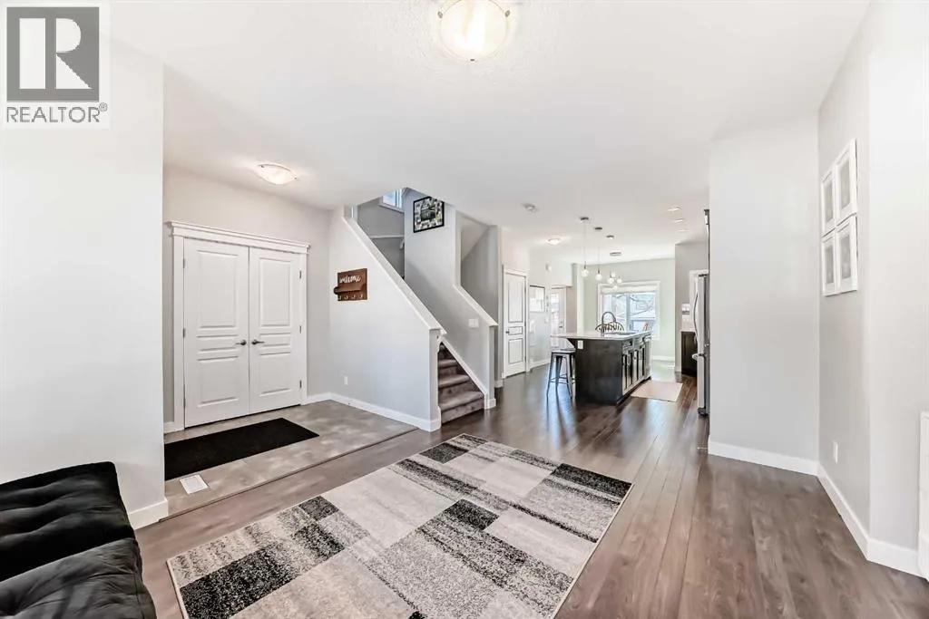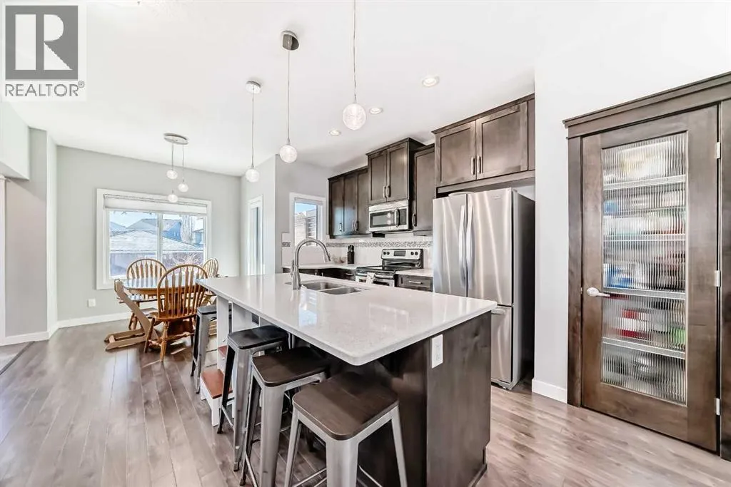Perfect home for first time owners or a growing family, 2015 vintage 3+ bedroom 2 storey in Airdrie's district of Ravenswood. Lovely curb appeal with covered veranda. Upgraded wood laminate flooring on main floor with tiled front and rear entries. Large and spacious kitchen with 8 foot working island, separate pantry, 9 ft ceilings and tall cabinetry, dining room nook over looks rear yard, spacious great room expanding into flex space/dining area before kitchen area, main floor laundry room with storage space. 3 Bedroom upstairs, 4 pce ensuite plus 4 pce for other bedrooms, All bedrooms have walk-in closets. Huge lot (142 ft+ long lot with sunny western exposure). Rear yard b. house and garage is about 65 ft long and 30 ft wide., lots of room for children or adults to play. Huge 16 ft X 18 ft wood deck with pergola, small decorative rocked side yards for low maintenance or dog run. Completely fenced lot. Basement fully dev'd with 9 foot ceilings, raised floors with laminate flooring, an office/bedroom, large recreation room, large storage room. High efficient furnace, A/C, over sized water heater. Oversized double garage 24 ft wide and 22 ft deep. Large lots are rare without backing onto busy locations. (id:27476)