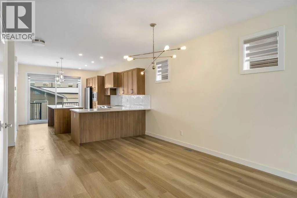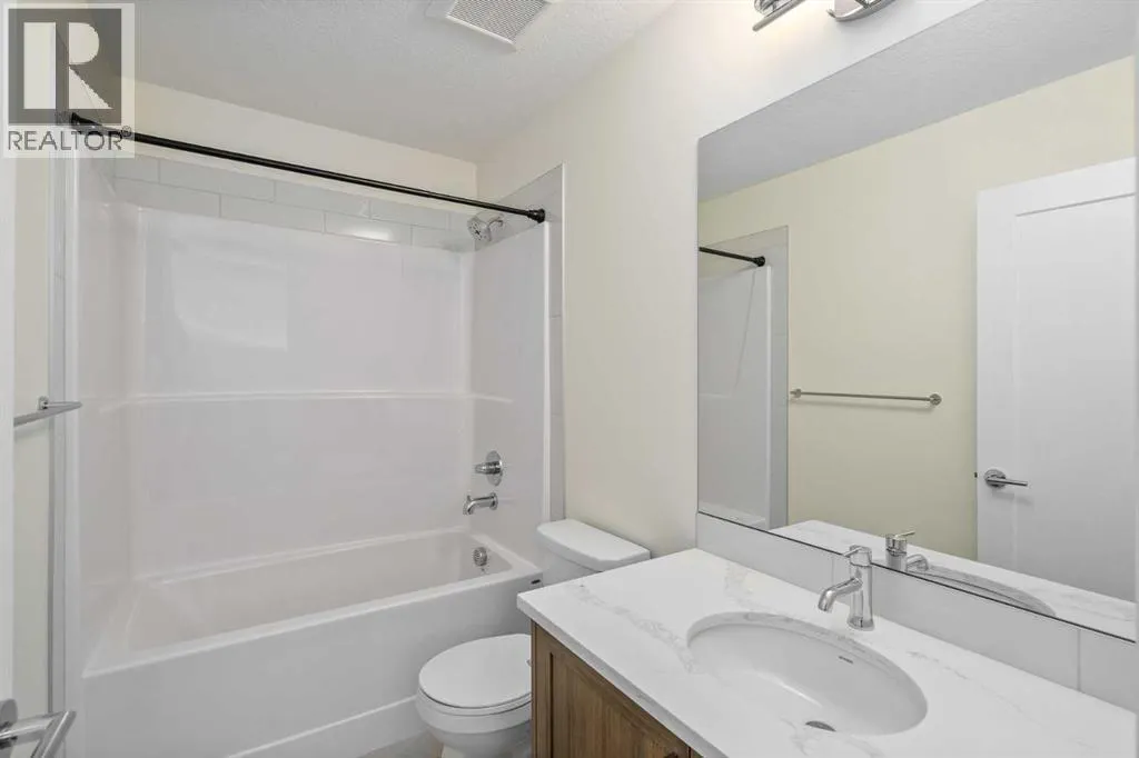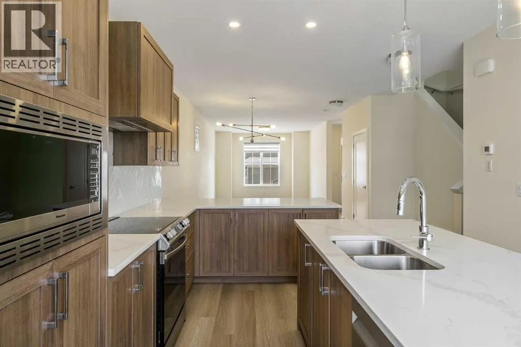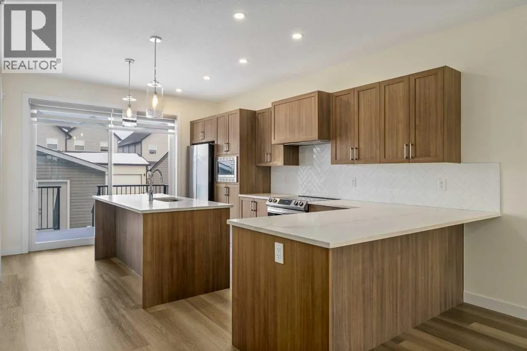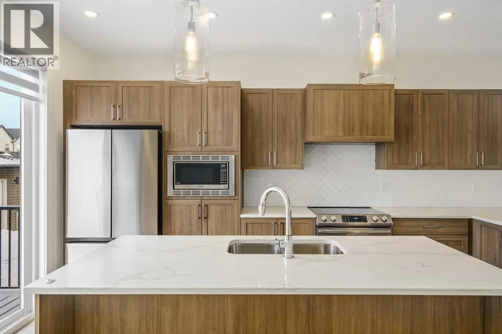 Welcome to this unique and well-maintained home in growing Airdrie, the 5th largest city in Alberta. Great potential for a growing or multi-generational family or investor. With a total of 2,570 sq. ft. of living space over three levels, which includes 5 bedrooms and 3.5 baths, this home provides room to grow. The first impression upon entering is light and bright. A transom window above the entry door, an open area living room, dining, and kitchen with blonde, wide-plank flooring, neutral colours, clean lines and windows and patio doors at opposite ends of the space spell out airy and cheerful. The combined living room/dining area is spacious and presents numerous possibilities as to furniture arrangements. Likewise, the kitchen is a study in sleekness with smooth, shaker-style cabinetry, cool, white quartz countertops, white chevron-style, tiled backsplash, stainless appliances and a breakfast bar/island with deep double, undermount sinks. A 2-pc. bath and rear hall leading to the outside deck finish this level. The carpeted upper level begins with a bonus room at the head of the stairs. Use this as a family room, play area or a home office. The laundry room is conveniently located across the hall. A substantial primary bedroom features a vaulted ceiling, walk-in closet and the privilege of a 4-pc. bath (double vanity). Two additional bedrooms, both with a good amount of closet space, share a tiled 4-pc bath. The lower level, a fully finished illegal suite can be accessed via a side entrance, has wide-plank flooring and boasts a rec room, 2 bedrooms, kitchen with stainless fridge and microwave, 4-pc. bath, utility room and storage area. Roughed-in plumbing is available for washer and dryer hookup. This level is perfect for guests or could be a secondary living area. The back yard features a railed, wooden deck for summer relaxing plus a double, detached garage accessed from the back lane. Adding to the family vibe of this home is the proximity to Airdrieâs Main St reet with shopping (Walmart Supercentre and Home Depot), restaurants, multiple schools, playgrounds, the QE 2 with just minutes to the New Horizon Mall, the City of Calgary and the International Airport. Visit today as this home will move quickly. (id:27476)