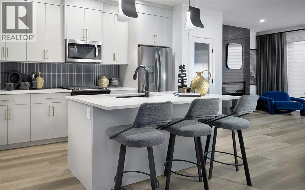 Welcome to the âOakâ by Brookfield Residential, a beautifully crafted semi-detached home located in the desirable community of Chinook Gate in Airdrie. Thoughtfully designed to deliver exceptional functionality and modern style, this home is complete with a double detached garage and nearly 1,700 sq. ft. of above-grade living space. Featuring two spacious living areas, three bedrooms, and 2.5 bathrooms above grade, this home offers a smart and versatile layout ideal for todayâs lifestyle. Nine-foot ceilings enhance the sense of openness throughout the main floor, while the central kitchen serves as the true heart of the home. The kitchen is both stylish and functional, showcasing a large island, spacious pantry, and a full suite of stainless-steel appliances, perfect for cooking, entertaining, and everyday living. The bright dining area overlooks the front yard through large windows that bring in abundant natural light year-round. At the rear of the home, the great room features a wall of southwest-facing windows overlooking the private backyard, creating a warm and inviting space to relax. A convenient 2-piece powder room completes the main level. Upstairs, a central bonus room provides separation and privacy between the primary retreat and the secondary bedrooms. The spacious primary suite includes a walk-in closet and a beautifully finished 4-piece ensuite with dual sinks and a walk-in shower. Two additional bedrooms, a full bathroom, and an upper-level laundry room complete this family-friendly second floor. The basement offers excellent future development potential, with ample space for a fourth bedroom, a full bathroom, and recreation room. It also features a private entrance, ideal for those considering a future basement suite (subject to permits and approvals). Outside, the sunny backyard provides the perfect setting for relaxing or entertaining during the warmer months. A rear double detached garage offers secure parking and additional storage year-round. L ocated in the heart of Chinook Gate, residents enjoy access to parks, playgrounds, green spaces, and convenient connections to major roadways â everything you need just minutes from your doorstep. Built with quality craftsmanship and backed by both a full builder warranty and the Alberta New Home Warranty program, this home offers style, comfort, and peace of mind in one exceptional package. (id:27476)