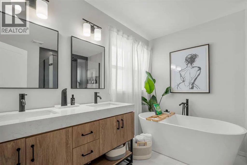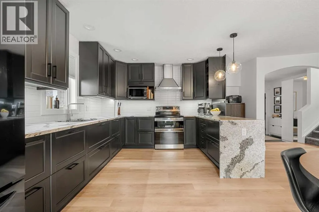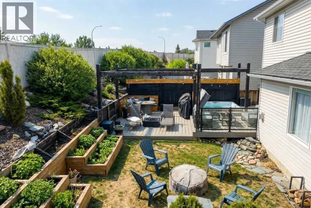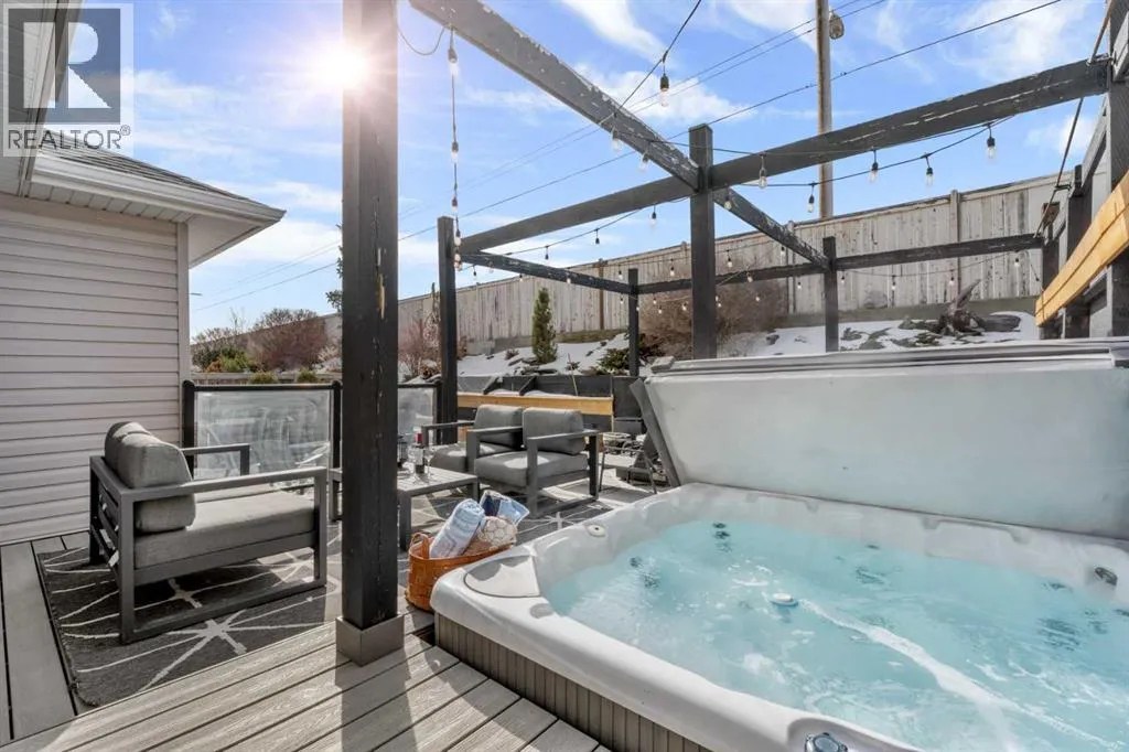 Welcome to this beautifully updated, top-to-bottom renovated home located in the desirable Fairways community of Airdrie, just minutes from Woodside Golf Course and conveniently close to Veterans Blvd NW, offering quick access to major routes, parks, and everyday amenities.This well-maintained property offers 3 spacious bedrooms upstairs, 2.5 bathrooms on the upper levels, plus a fully finished basement that includes an additional bedroom, a full bathroom, and a dedicated office space, making it perfect for growing families, remote work, or guests.Inside, the home showcases thoughtful upgrades throughout. The modern kitchen is designed for both functionality and style, featuring quality cabinetry, modern countertops, a stunning waterfall island, built-in dishwasher, stylish wine cabinet, and an electric range with double ovens, making it ideal for cooking, hosting, and everyday living.The primary ensuite has been beautifully renovated into a spa-like retreat, complete with a glass shower with built-in niche, upgraded plumbing fixtures, a relaxing standalone tub, and a stylish double vanity. The primary closet features a barn-style sliding door and built-in organizers, adding both character and practical storage.The fully finished basement adds valuable living space and includes a cozy electric fireplace, an additional bedroom, full bathroom, and a private office space, offering flexibility for work, guests, or extended family.Step outside to the true highlight of the home â the resort-style backyard, thoughtfully designed for relaxation and entertaining. The outdoor space features a pergola-covered seating area with privacy screen, a relaxing hot tub, cozy firepit area, raised garden beds, and a spacious deck perfect for gatherings. An L-shaped built-in bench seating area adds charm and functionality, creating the perfect place to host family and friends.Additional upgrades throughout the home include custom laundry storage, built-in closets, accent wall s, upgraded baseboards, modern lighting fixtures, and stylish ceiling fans, giving the entire home a polished, move-in-ready feel.Located in one of Airdrieâs most family-friendly neighbourhoods, and just minutes from golf, parks, green spaces, and major roadways, this home offers the perfect combination of comfort, lifestyle, and convenience. (id:27476)