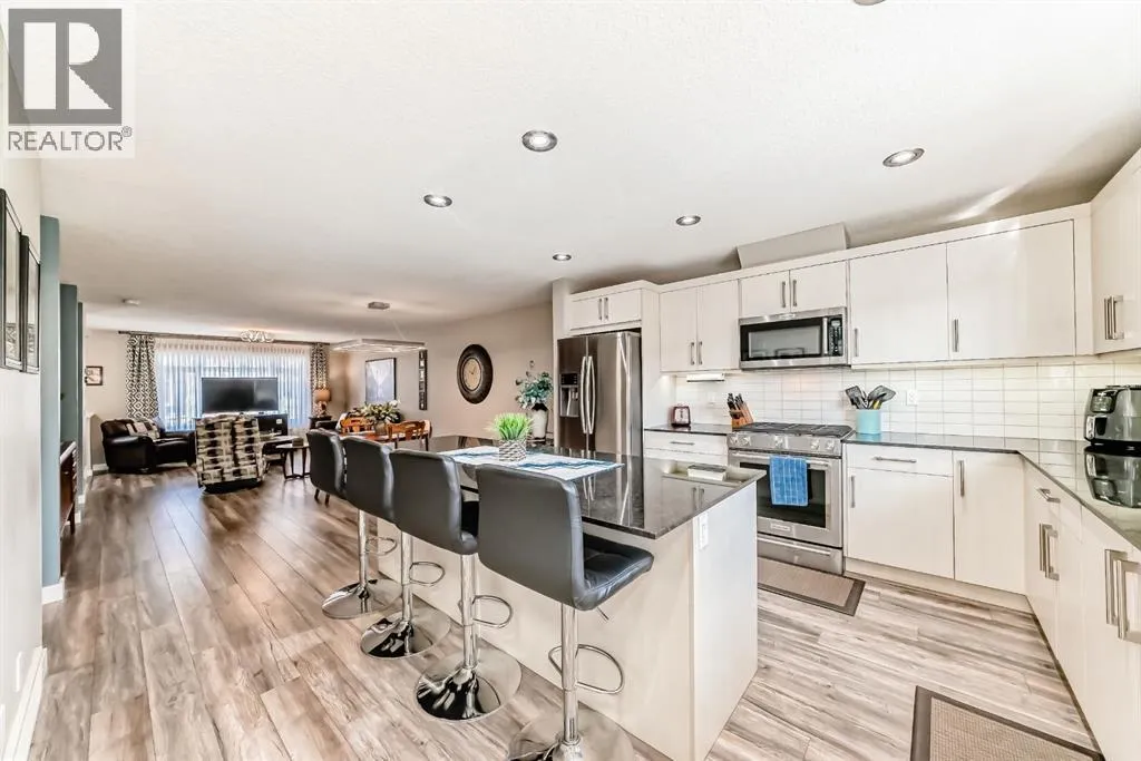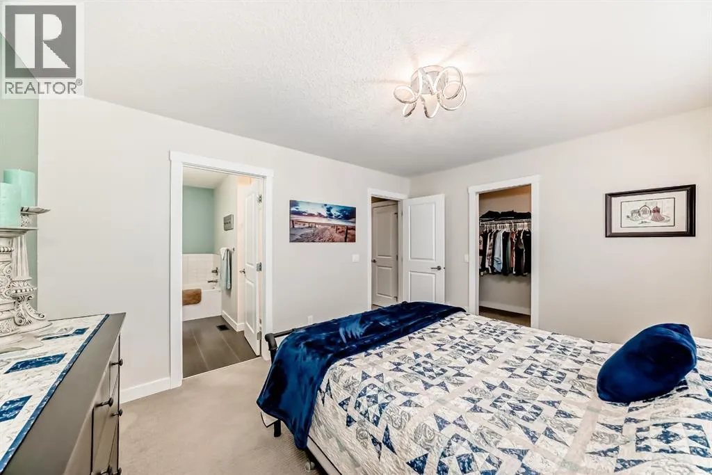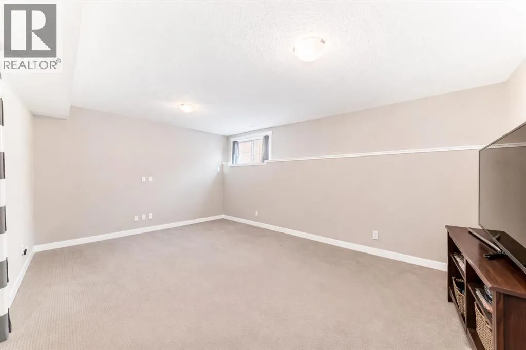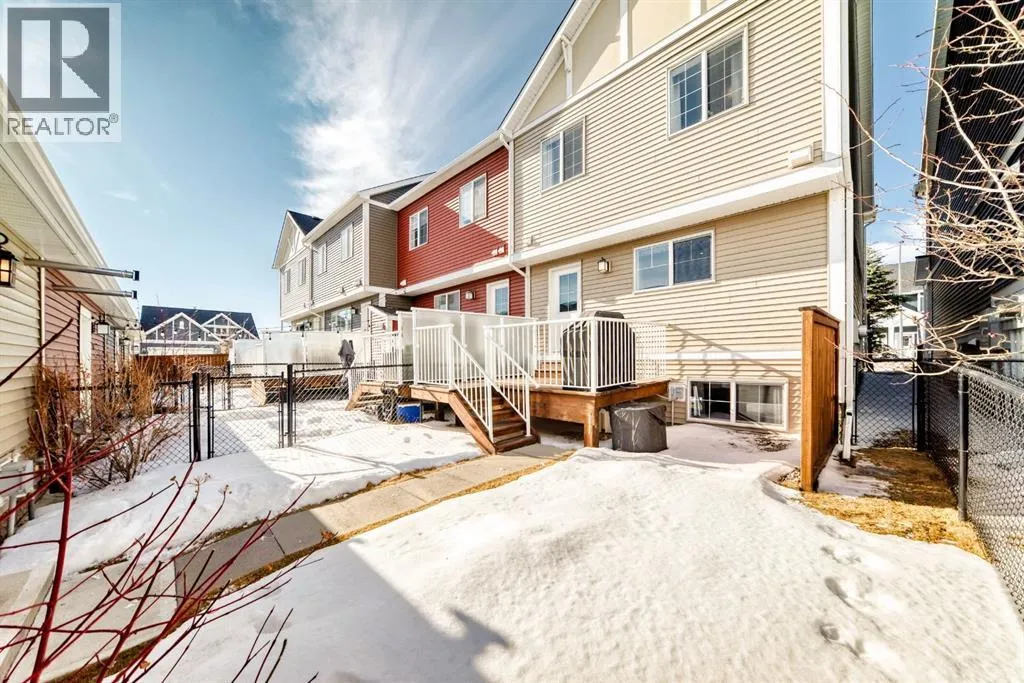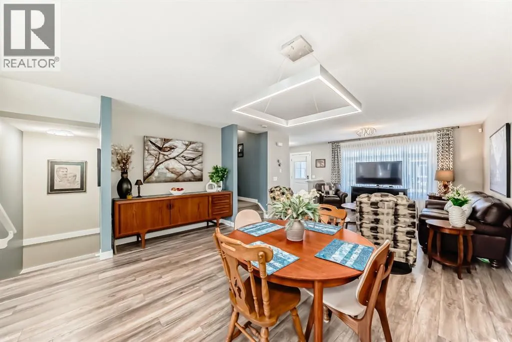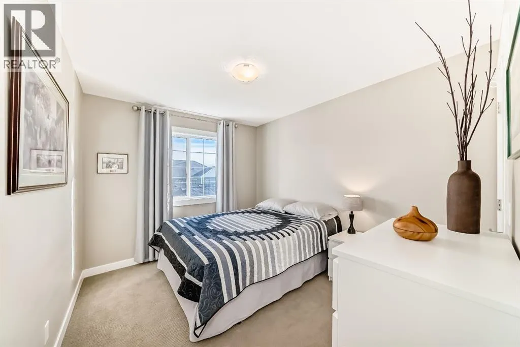 If you're looking for a townhome that offers real space, this one delivers: 4 bedrooms, 3.5 bathrooms, and over 2,400 SQFT of fully developed living with 1,700.9 SQFT above grade (RMS), in a desirable end-unit location with only one common wall.The main floor features a bright open-concept layout with high ceilings, large windows, and great flow between the living, dining, and kitchen areas. The kitchen is both functional and stylish with quartz countertops, a large island, and plenty of cabinetry, making it an easy space for everyday living or hosting friends and family. A convenient 2-piece bathroom completes the main level.Upstairs you'll find three spacious bedrooms, including a comfortable primary suite with a good-sized walk-in closet and private 4-piece ensuite featuring heated floors. The additional bedrooms are generously sized and also offer great closet space, while another full bathroom with heated flooring and upper-level laundry with a newer washing machine add everyday convenience.The fully finished basement expands the living space with a large fourth bedroom, full bathroom, and additional rec/family room, giving you flexibility for guests, a home office, gym, or extra living area.Additional features include central air conditioning, central vacuum, quartz countertops, high ceilings, and keypad door locks on all three exterior doors. The double detached heated garage is fully finished with epoxy flooring and back lane access. The backyard is fully fenced with a deck and natural gas BBQ line.Located in the family-friendly community of Baysprings, close to parks, schools, playgrounds, shopping, and walking paths, this home offers space, functionality, and a fantastic Airdrie location. (id:27476)