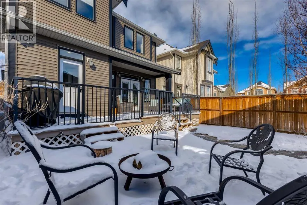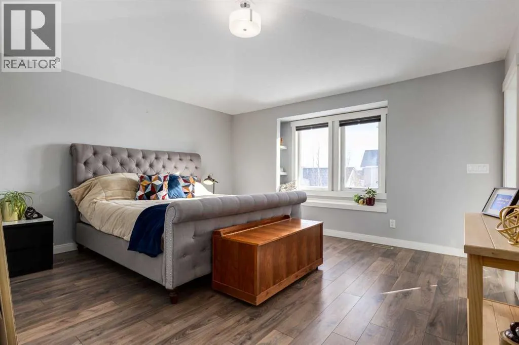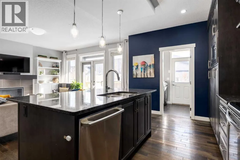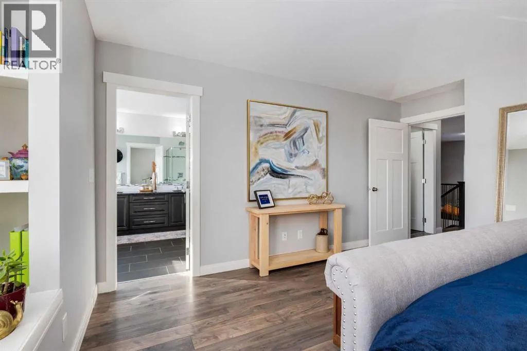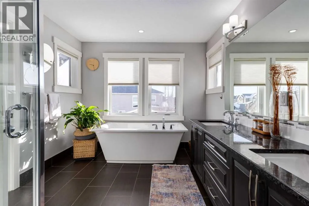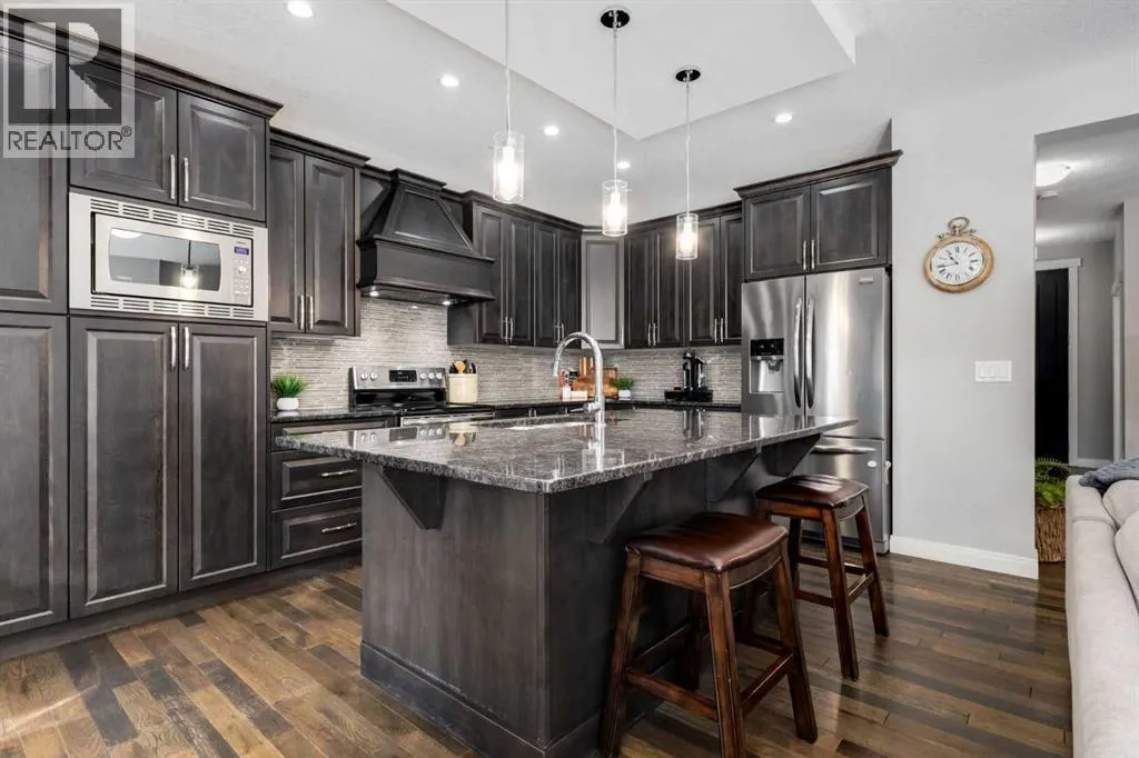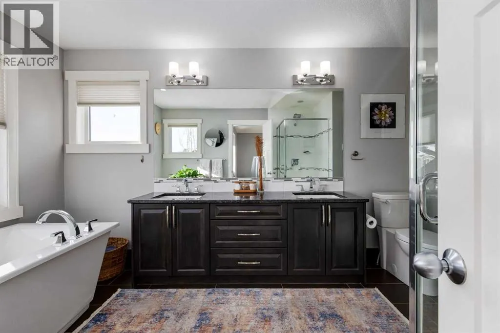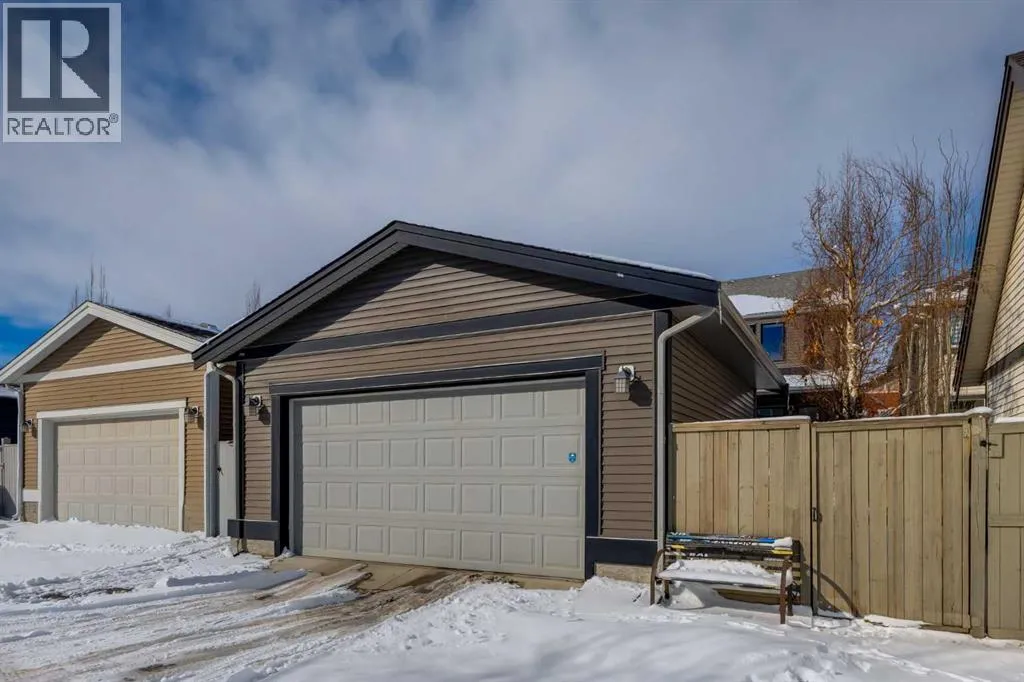 Impeccably finished from top to bottom, with thoughtful upgrades, elegant spaces, a private backyard retreat, AND an OVERSIZED 24x22 Detached Double Garage! From the moment you step inside off the covered front porch , a welcoming tile Foyer leads you into a bright main floor where rich hardwood floors and elegant design details create a warm, inviting atmosphere. Just off the front entrance is a private Home Office with French doors and bright windows âperfect for working from home or a quiet study space. The Dining area is extremely spacious and features a striking chandelier, flowing seamlessly into the Living Room and Kitchen. Natural light floods the Living Room, with a cozy gas fireplace with a mantle, framed by two bookcase cabinets. French doors open to the partially covered back deck, creating a natural connection between indoor and outdoor living.The Kitchen is perfectly designed for both everyday life and entertaining, showcasing granite countertops, full-height cabinetry, SS appliances and a large island designed for gathering. A convenient tiled Laundry & Mudroom just off the kitchen offers a folding counter, additional cabinetry, and built-in bench with hooks, keeping coats and bags neatly organized. Completing this open-concept main level is a 2-pc Bathroom with pedestal sink & an opening window. Ushered upstairs by the wide carpeted, modern staircase youâll find a spacious Bonus Room filled with sunshine, The Primary retreat boasts vaulted ceiling, a cozy window seat, and a walk-in closet. The 5-pc Ensuite is a true spa-inspired space featuring in-floor heating, a stand-alone soaker tub beneath the big window, separate walk-in corner shower, dual sinks with granite counters, and tons of cupboard / additional drawer storage. Central A/C and UV window protection has been added to enhance comfort and efficiency in this home. Also upstairs are 2 more spacious Bedrooms, an organized Linen Closet, and a beautifully finished 4-pc Bathroom with granite coun ters and tile flooring. The FULLY FINISHED BASEMENT expands your living space with impressive 9ft ceilings, a massive Family Room/ Recreation area, extra space for your Home Gym, a FOURTH BEDROOM, a stunning 3-pc Bathroom with an O/S walk-in shower and great vanity storage, AND loads of extra storage options. Outside, the beautifully landscaped backyard feels like a private oasis with mature trees & gardens, a partially covered deck for relaxing or entertaining, and a stamped concrete patio and pathway to the Garage. Last but certainly not least - the oversized 22'x24' Double Detached Garage with PAVED LANE ACCESS! Located in one of Airdrieâs most sought-after communities, this home is just steps from parks, pathways, schools, and the many amenities of Coopers Promenade. Donât miss the chance to call this luxurious property HOME, book a private showing TODAY. (id:27476)