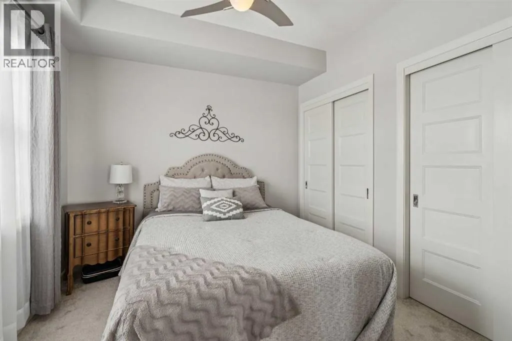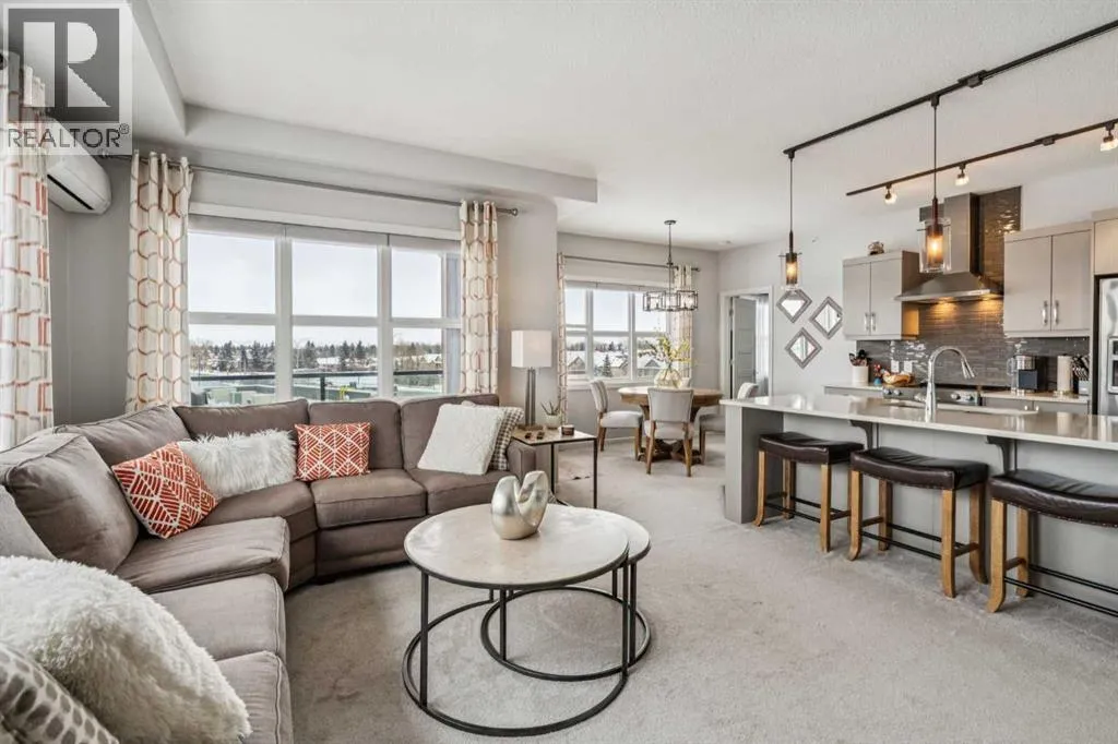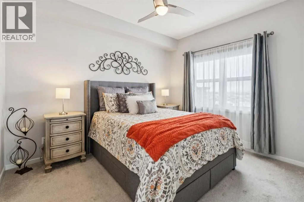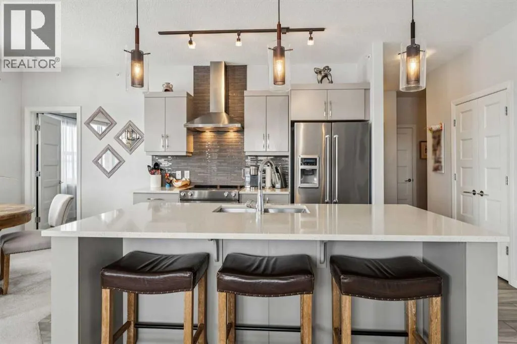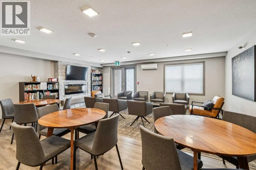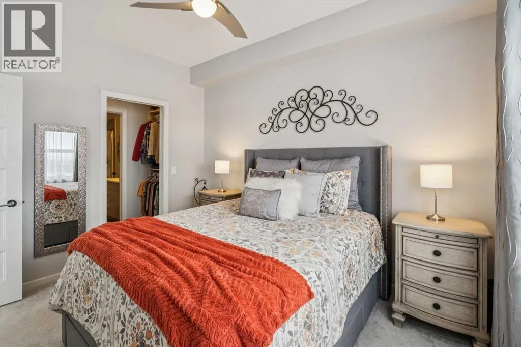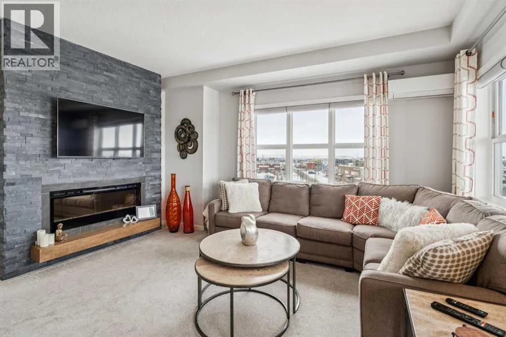 CHECK OUT OUR 24/7 VIRTUAL OPEN HOUSE. Welcome to The Chateaux, Airdrieâs premier 55+ complex, thoughtfully designed for comfortable, low-maintenance living in a vibrant community setting. This top-floor corner unit offers over 900 sq. ft. of bright, open living space with 2 bedrooms and 2 bathrooms, including a primary suite with private ensuite.The open-concept floorplan is perfect for everyday living and entertaining, featuring quartz countertops and over $50,000 in upgrades. The kitchen is a standout with a premium stainless steel appliance package, custom hood fan, and a microwave built seamlessly into the island. Additional upgrades include a stylish fireplace, air conditioning, high-quality blinds, upgraded light fixtures, and a convenient screen door for added comfort.Step outside to your covered private deck with gas BBQ hookup, the perfect spot for morning coffee or evening relaxation. This home also includes a titled underground parking stall with a storage cage above, providing both convenience and security.Residents of The Chateaux enjoy exceptional amenities, including a beautifully landscaped courtyard, a welcoming amenity/social room available for private bookings, and a secure underground workshop for woodworking enthusiasts. The building also features secure underground access, elevator service, bike storage, and a welcoming lobby, all within a well-maintained complex with in-floor heating for year-round efficiency and comfort.Ideally located within walking distance to groceries, shopping, restaurants, medical services, and banking, this home also offers easy access to Deerfoot Trail, especially with the convenient new 40th Ave exit. Enjoy nearby access to the Genesis Place recreation complex, East Lake walking/biking paths, and a dog park nearby in Kings Heights too.This pet-friendly community (two pets permitted, with size restrictions) offers the perfect balance of comfort, convenience, and community for those looking to enjoy an acti ve, maintenance-free lifestyle. Book your viewing today! (id:27476)