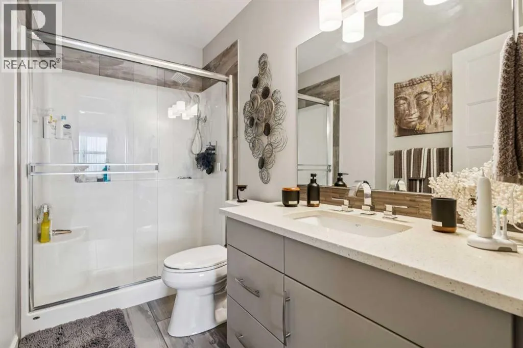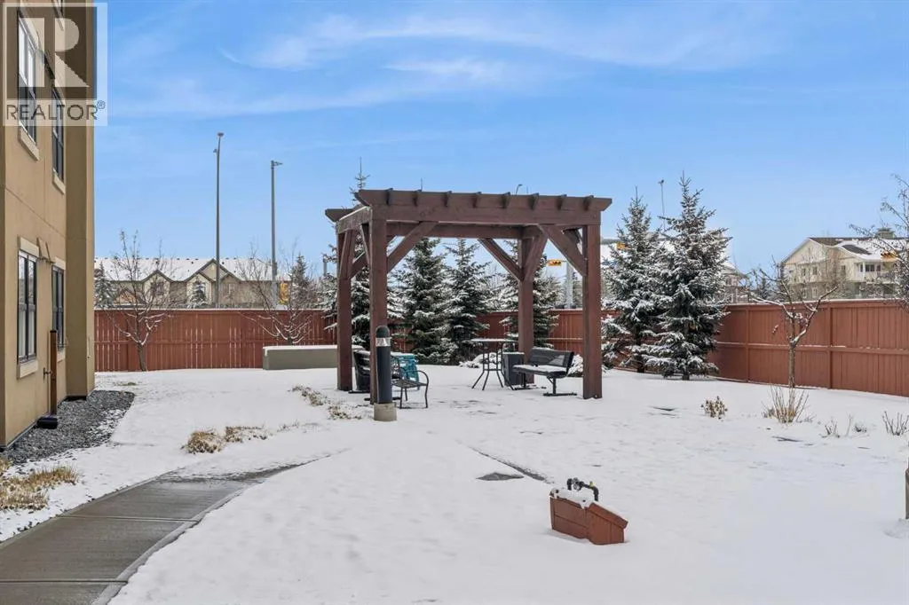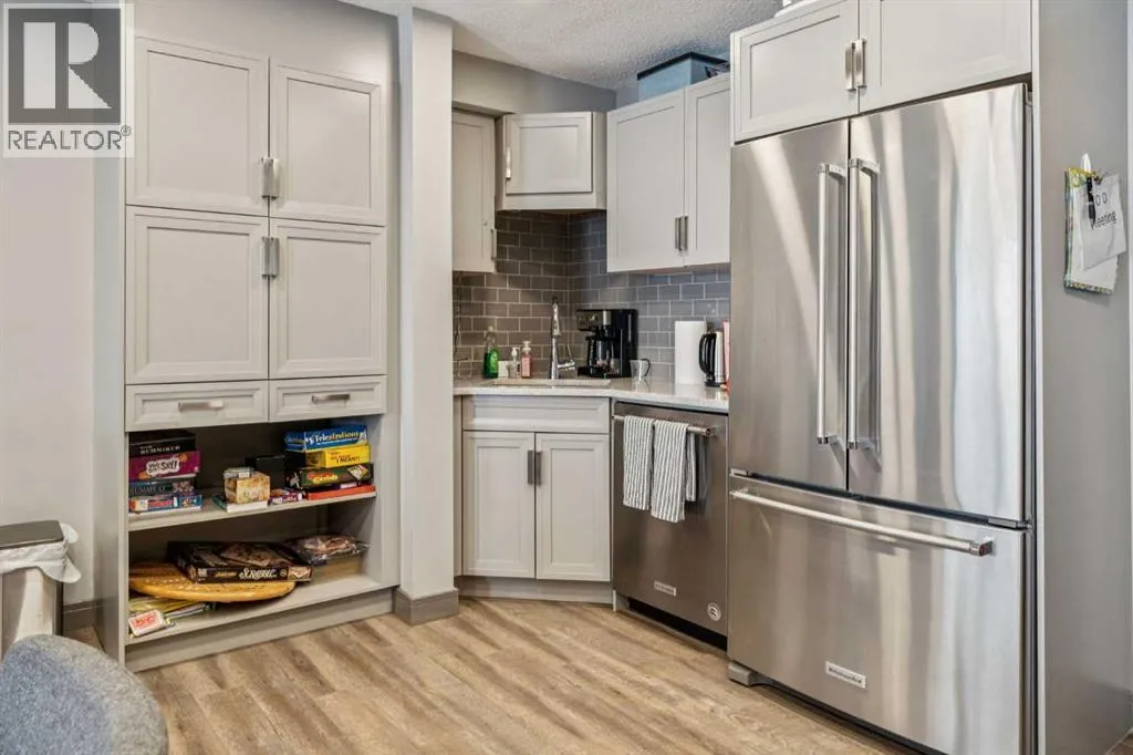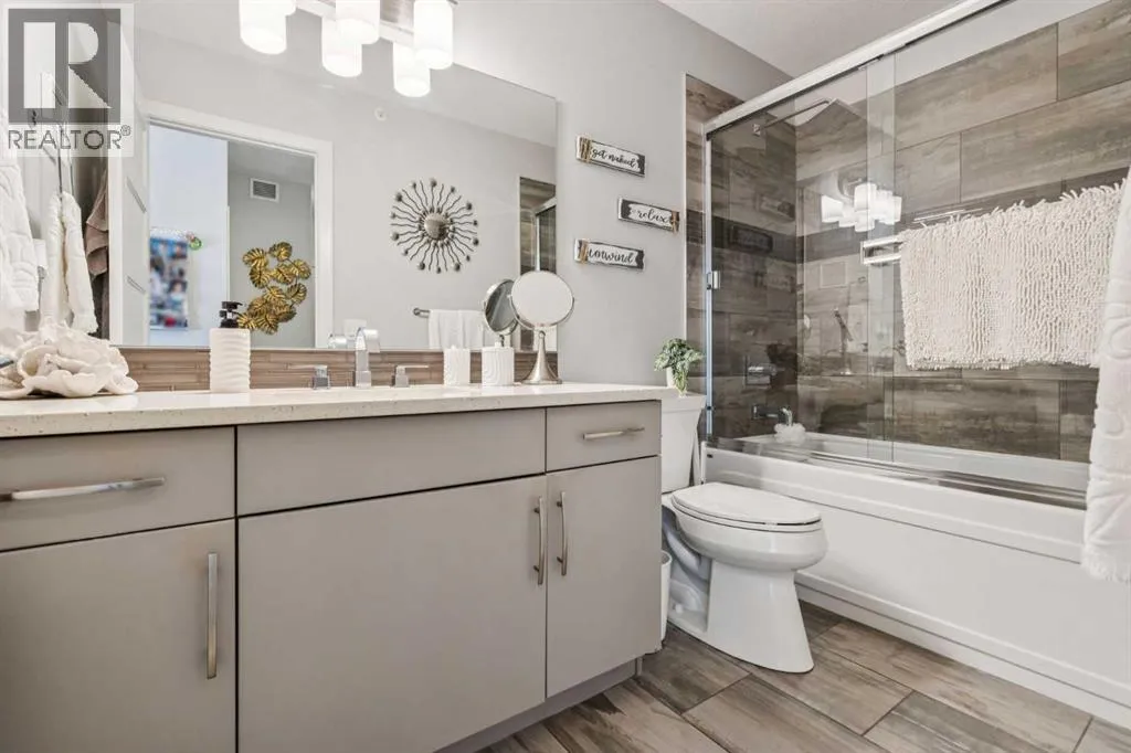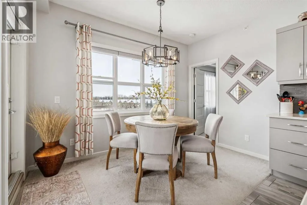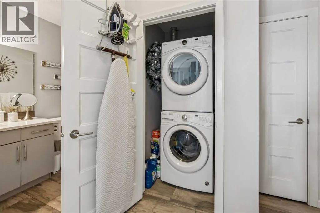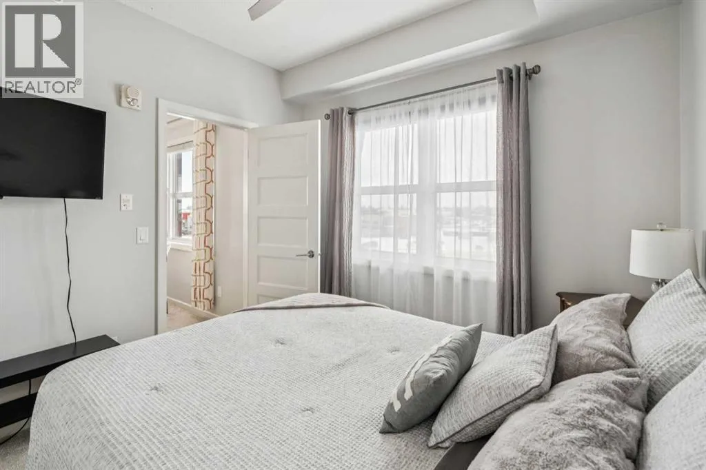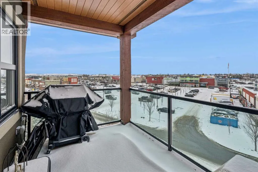 CHECK OUT OUR 24/7 VIRTUAL OPEN HOUSE. Welcome to The Chateaux, Airdrieâs premier 55+ complex, thoughtfully designed for comfortable, low-maintenance living in a vibrant community setting. This top-floor corner unit offers over 900 sq. ft. of bright, open living space with 2 bedrooms and 2 bathrooms, including a primary suite with private ensuite.The open-concept floorplan is perfect for everyday living and entertaining, featuring quartz countertops and over $50,000 in upgrades. The kitchen is a standout with a premium stainless steel appliance package, custom hood fan, and a microwave built seamlessly into the island. Additional upgrades include a stylish fireplace, air conditioning, high-quality blinds, upgraded light fixtures, and a convenient screen door for added comfort.Step outside to your covered private deck with gas BBQ hookup, the perfect spot for morning coffee or evening relaxation. This home also includes a titled underground parking stall with a storage cage above, providing both convenience and security.Residents of The Chateaux enjoy exceptional amenities, including a beautifully landscaped courtyard, a welcoming amenity/social room available for private bookings, and a secure underground workshop for woodworking enthusiasts. The building also features secure underground access, elevator service, bike storage, and a welcoming lobby, all within a well-maintained complex with in-floor heating for year-round efficiency and comfort.Ideally located within walking distance to groceries, shopping, restaurants, medical services, and banking, this home also offers easy access to Deerfoot Trail, especially with the convenient new 40th Ave exit. Enjoy nearby access to the Genesis Place recreation complex, East Lake walking/biking paths, and a dog park nearby in Kings Heights too.This pet-friendly community (two pets permitted, with size restrictions) offers the perfect balance of comfort, convenience, and community for those looking to enjoy an acti ve, maintenance-free lifestyle. Book your viewing today! (id:27476)