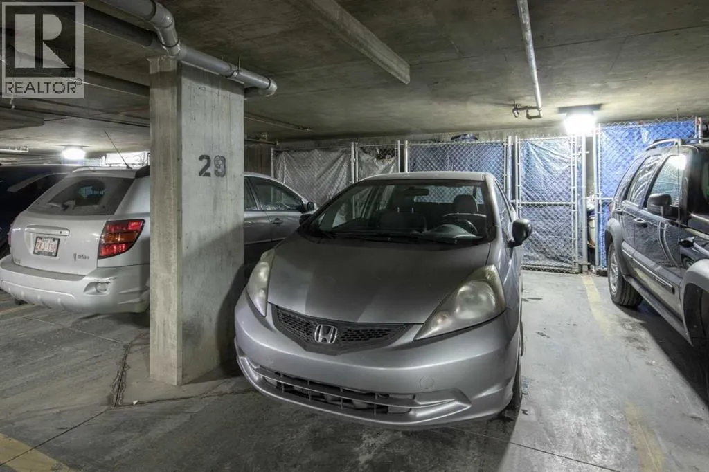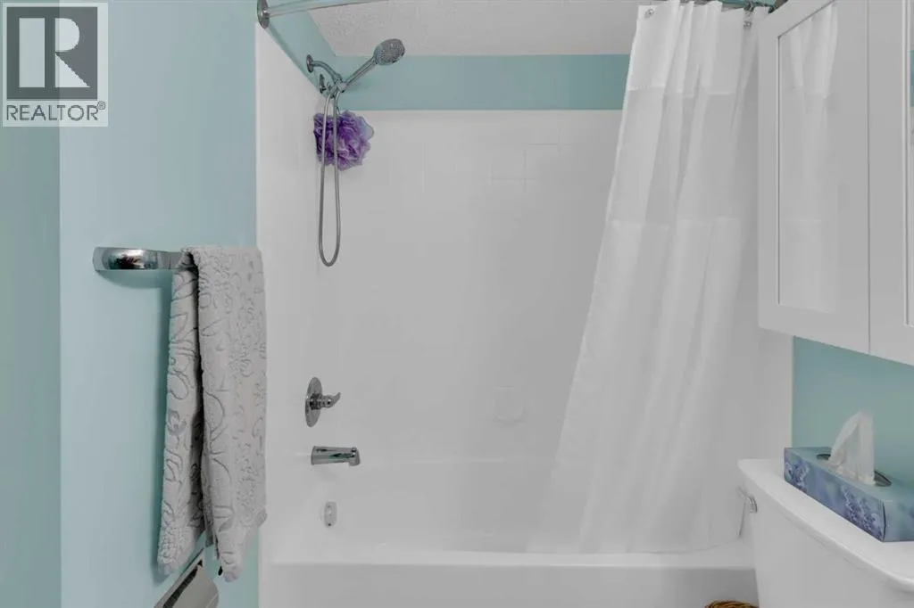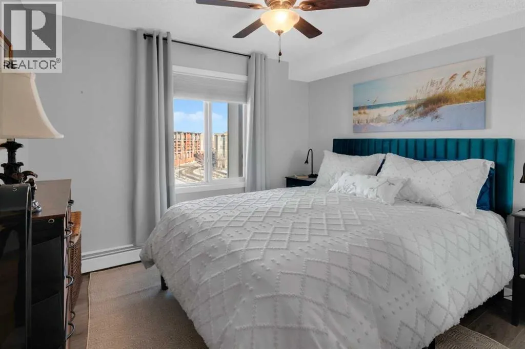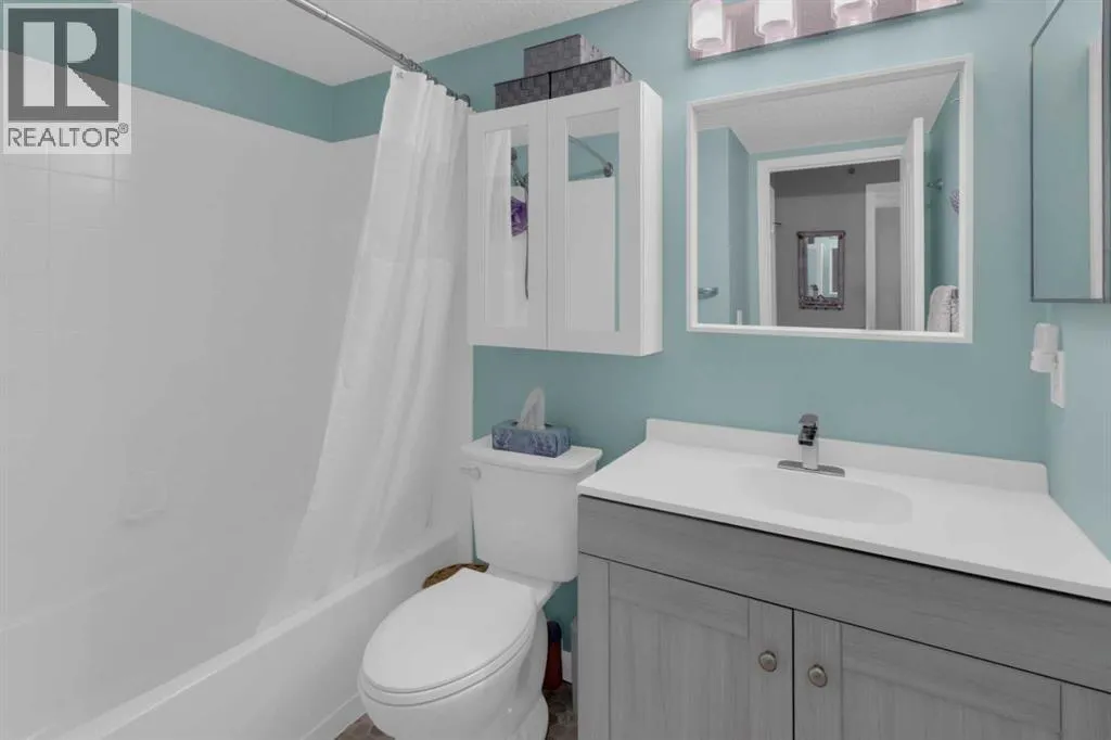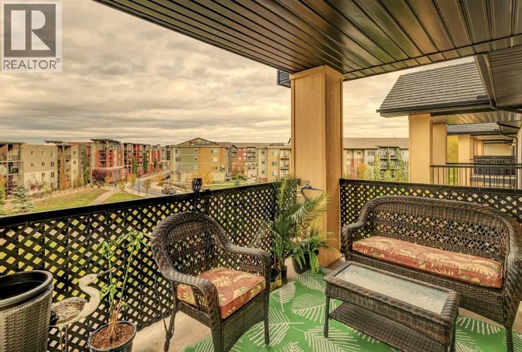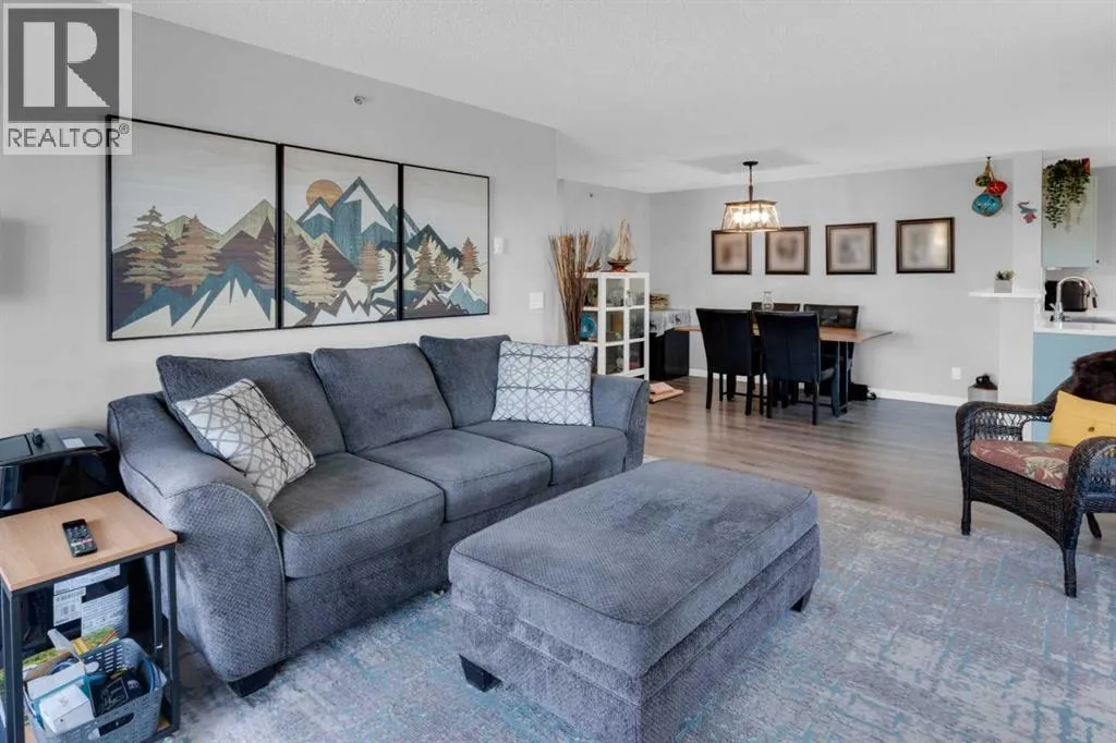 Welcome to MacKenzie Pointeâcurrently the only unit available in the complex. This top-floor, corner 2-bedroom, 1-bathroom condo offers added privacy with no neighbours above and just one shared wall. The bright, functional layout features an open living and dining area, with natural light from its corner position. The kitchen includes contemporary cabinetry and stainless steel appliances (2022), including a convection oven with air-fryer function, dishwasher, microwave/hood fan, and a refrigerator with bottom-drawer freezer. A farmhouse sink with pull-down faucet adds everyday practicality. Recent updates include a new washer and dryer (2025), upgraded lighting, updated switch plates, and ceiling fans in both bedrooms. Foil-lined sunshades in the kitchen and living room help maintain comfort year-round, while mirrored closet doors enhance light and storage. The bathroom features a professionally refinished bathtub for a clean, refreshed finish. The large, two-sided balcony offers space to relax or enjoy evening sunsets. This unit also includes titled, heated underground parking located near the elevator, complete with a secure storage area. Located in the heart of Airdrie, youâre within walking distance to shopping, restaurants, services, and Nose Creek Park. Condo fees include all utilitiesâelectricity, heat, water, sewer, and waste removalâadding to the overall value. This is an excellent opportunity for buyers looking to step into low-maintenance condo living in a walkable, central location. (id:27476)