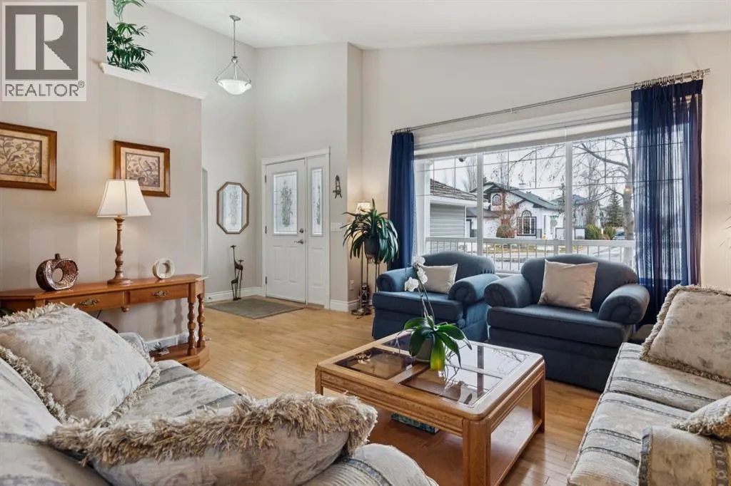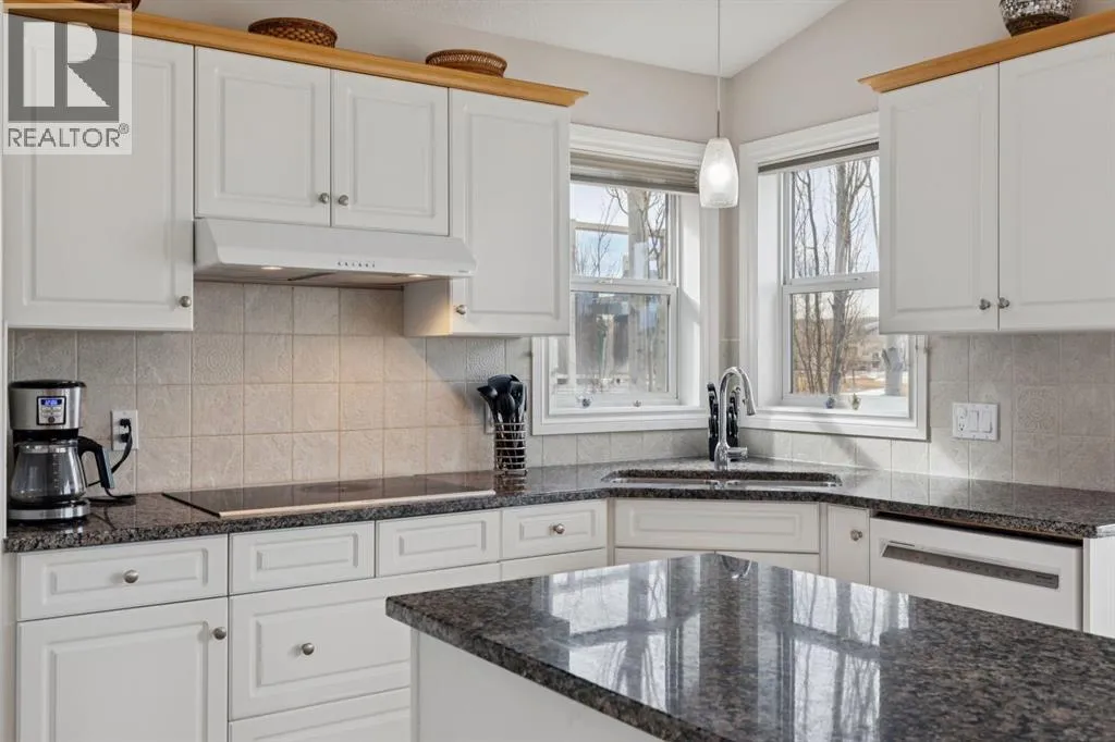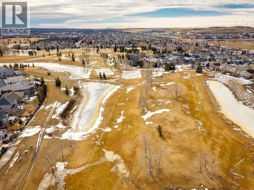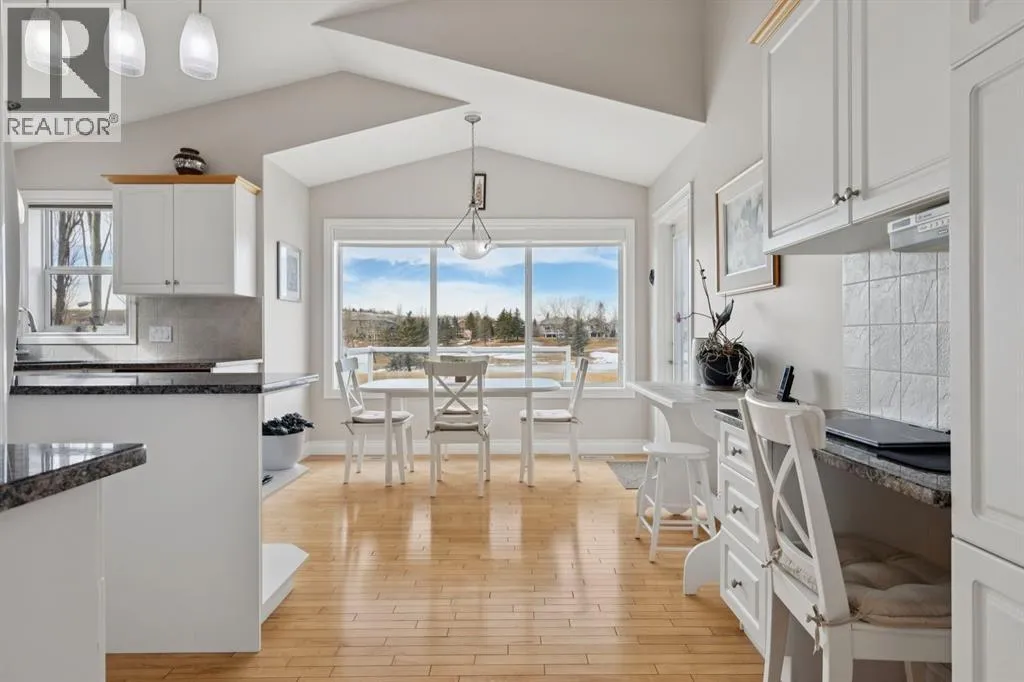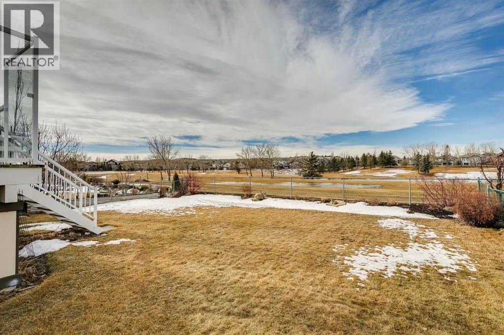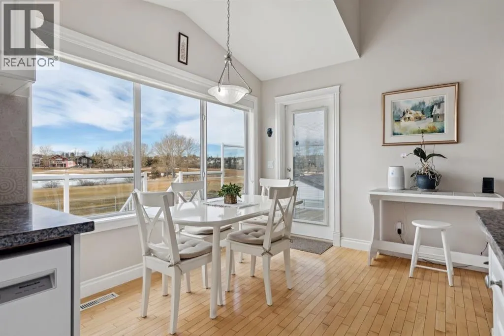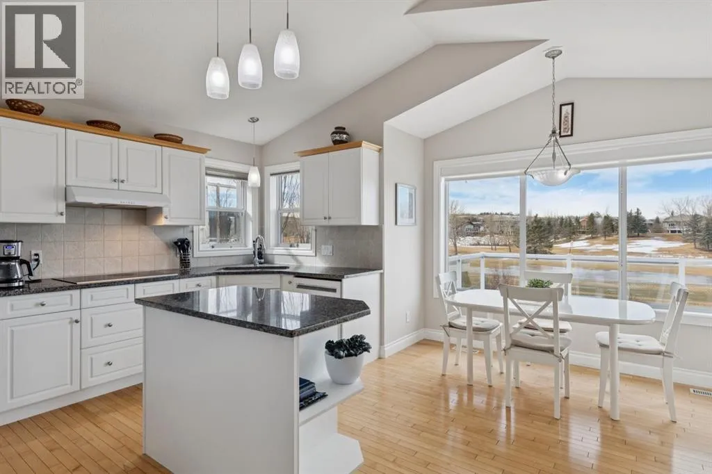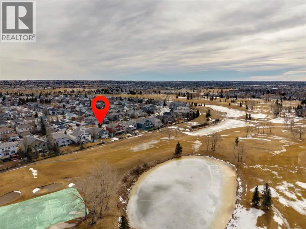 Welcome to a rare opportunity in the highly sought-after Woodside communityâthis original-owner bungalow, custom built by McKee Homes, offers an exceptional combination of quality, comfort, and an unbeatable location backing directly onto the picturesque Woodside Golf Course. Perfectly positioned on a quiet, low-traffic cul-de-sac, this home captures stunning west-facing views over two tranquil ponds and rolling greens, with no neighbours behind. Enjoy the peaceful setting year-round, with only seasonal golf activity for approximately six months of the year. Whether you're relaxing or entertaining, the elevated balcony deck is a standout featureâcomplete with a gas line for your BBQ, clear glass wind panels to preserve the views, and a power awning with remote for added comfort. Inside, the home boasts a bright and open layout enhanced by vaulted ceilings and an abundance of windows that flood the space with natural light. The kitchen is thoughtfully designed with granite countertops, built-in appliances, a central island with vacuum kick plate, and a cozy breakfast nookâall overlooking the golf course. Rich hardwood flooring flows throughout the main level, adding warmth and elegance. The spacious primary retreat offers serene views, a walk-in closet, and a full en suite. A second bedroom on the main level provides flexibility as a guest room, den, or home officeâalso enjoying those incredible west views. The main floor is completed by a large and functional laundry/mudroom with pocket doors, allowing you to keep everyday life neatly tucked away. The professionally finished basement features 9â ceilings, upgraded carpet, and an inviting gas fireplace with a built-in entertainment unit. Two additional bedrooms with sunshine windows, ample storage, and a full bathroom make this level perfect for family or guests. Additional highlights include triple pane windows on the west-facing side for enhanced efficiency, double pane windows elsewhere, central vacuum system , a full blinds package, and a builder-finished basement. The oversized attached garage (25â5â x 23â) easily accommodates a full-sized truck, while the backyard offers plenty of space along with a storage shed. The front yard showcases a beautifully designed rock garden filled with perennials that create stunning seasonal curb appeal, complemented by a welcoming front deckâperfect for enjoying your morning coffee. Homes of this caliber, in locations like this, rarely come to market. With pride of ownership evident throughout, a highly functional layout, and breathtaking views, this is your chance to secure a truly special property in one of Airdrieâs most desirable neighborhoods. (id:27476)