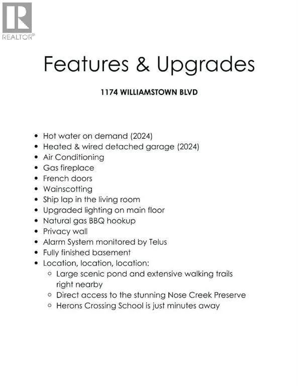 Welcome home to this beautifully maintained detached family residence in the highly sought-after Williamstown neighbourhood in Airdrie!Nestled in a friendly, family-oriented community, this home is perfectly positioned with a large scenic pond and extensive walking trails right nearby, plus direct access to the stunning Nose Creek Preserve for endless outdoor enjoyment. Herons Crossing School is just minutes away, making this an ideal location for families.Inside, youâll love the warm and welcoming layout featuring a cozy gas fireplace perfect for Alberta evenings. The home offers four generous bedrooms and three full bathrooms, while the fully finished basement provides flexible space for a rec room, home office, or guest suite â with an additional bathroom already roughed-in for easy future completion.Recent 2024 upgrades include an on-demand hot water system for instant comfort and a brand-new heated & wired detached garage thatâs ready for vehicles, tools, or hobbies.Step out back to your private deck with a natural gas BBQ hookup â the perfect spot for summer gatherings and relaxing evenings.This is a true turn-key family home in one of Airdrieâs most desirable pockets. Whether youâre raising a family or looking for room to grow, 1174 Williamstown Boulevard delivers everything youâve been searching for.Book your private showing today â homes like this donât last long! (id:27476)