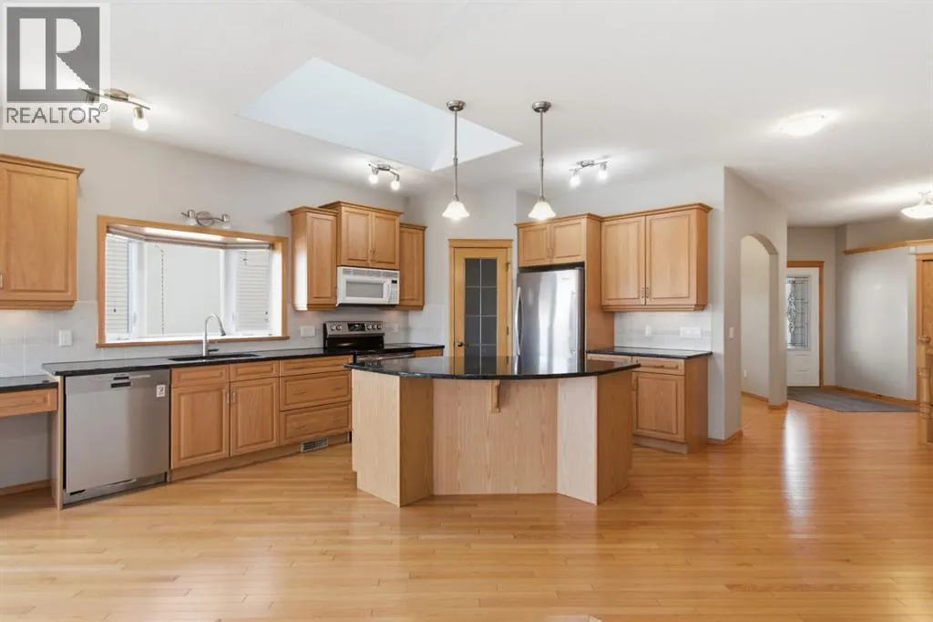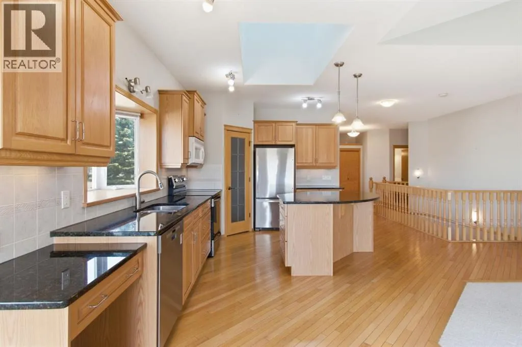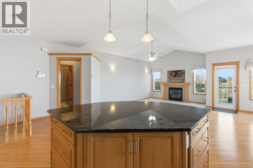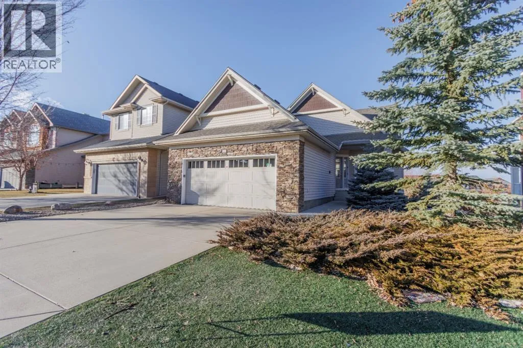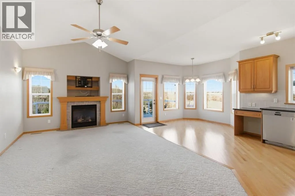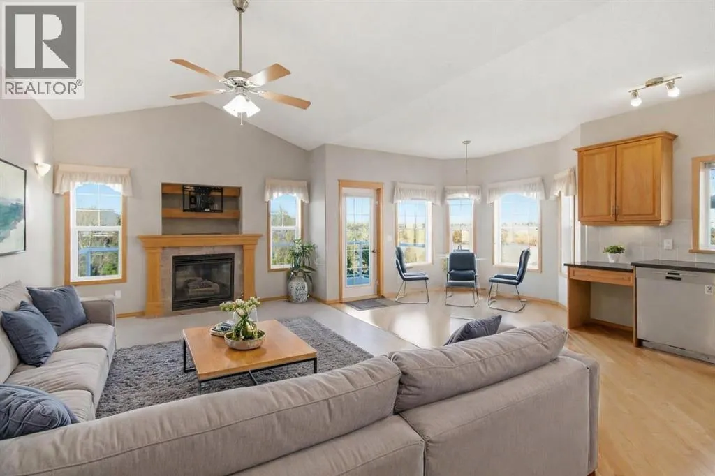 This meticulously well kept bungalow in Coopers Crossing, with over 2800 sq ft of living space, features an open-concept main floor designed for effortless living and entertaining. The heart of the home is a bright kitchen equipped with a central island, granite counter tops, and skylight, which flows directly into a vaulted living room anchored by a fireplace. The primary bedroom suite offers a walk-in closet and a 4pc ensuite, complemented on the main level by a dedicated den/office or formal dining room, main floor laundry, a 2 piece bath, and a large two-car garage (21'x23'). The fully developed walk-out basement provides extensive additional living space, centered around a large recreation room with built-in oak shelving and a second fireplace. This lower level also includes two well-sized bedrooms, a private office, a full 4pc bath, and a substantial unfinished area for utility and storage. Outside, the property boasts an elevated rear deck with glass railings overlooking a serene water feature, while the lower level opens to a covered patio and manicured lawn. Book your showing today! (id:27476)