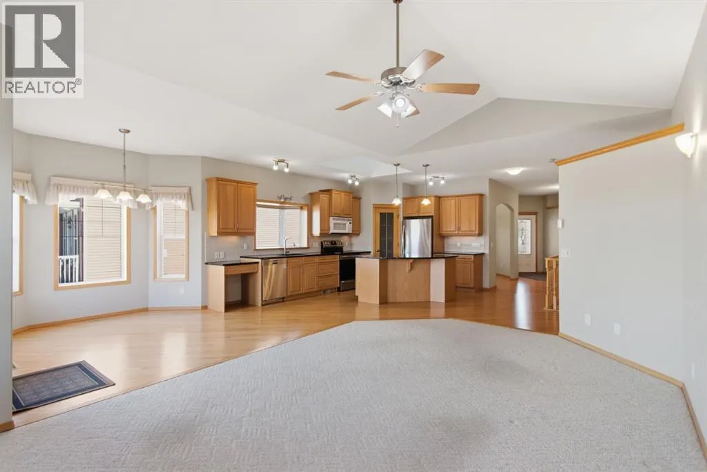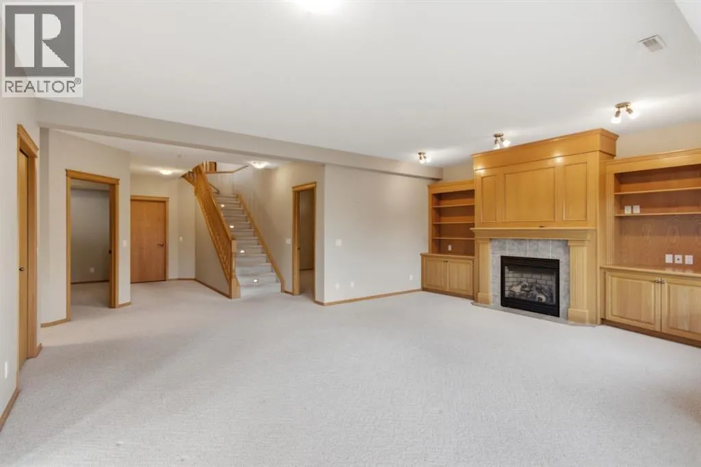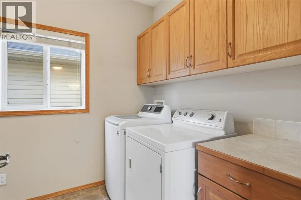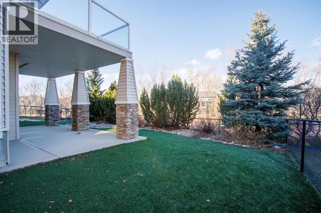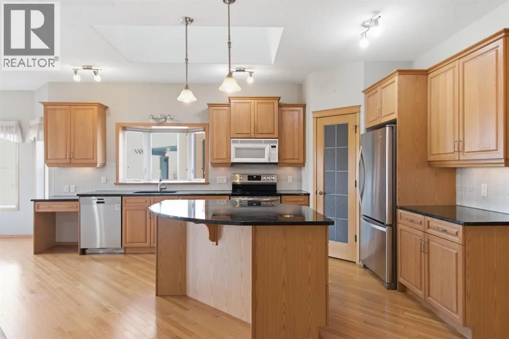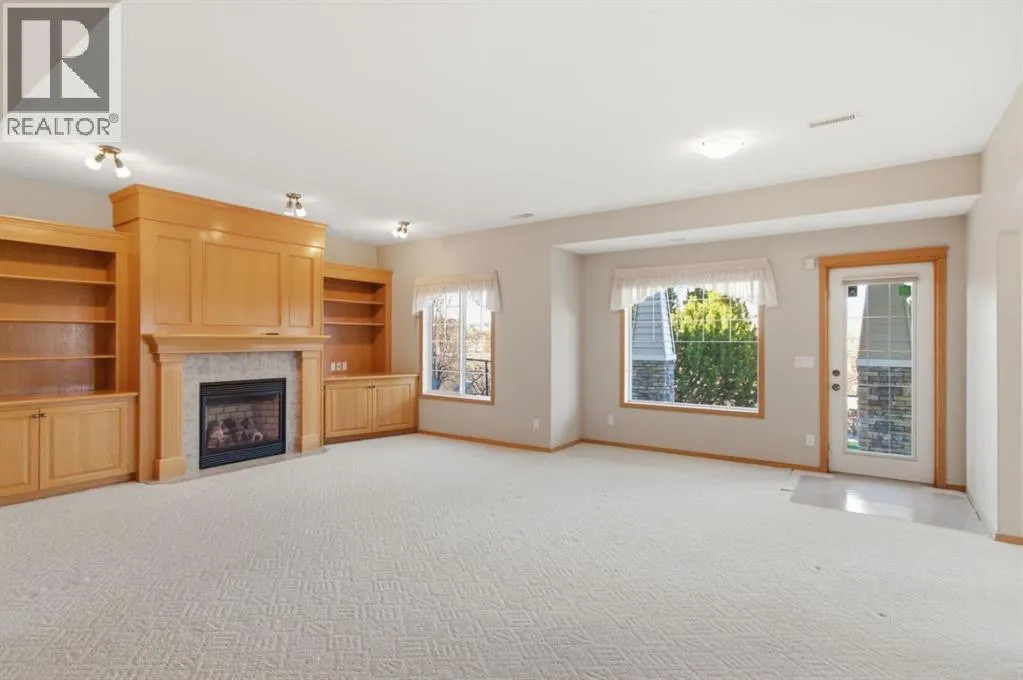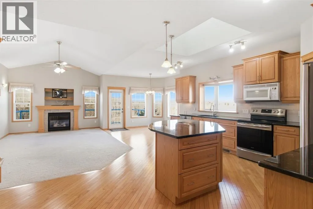 This meticulously well kept bungalow in Coopers Crossing, with over 2800 sq ft of living space, features an open-concept main floor designed for effortless living and entertaining. The heart of the home is a bright kitchen equipped with a central island, granite counter tops, and skylight, which flows directly into a vaulted living room anchored by a fireplace. The primary bedroom suite offers a walk-in closet and a 4pc ensuite, complemented on the main level by a dedicated den/office or formal dining room, main floor laundry, a 2 piece bath, and a large two-car garage (21'x23'). The fully developed walk-out basement provides extensive additional living space, centered around a large recreation room with built-in oak shelving and a second fireplace. This lower level also includes two well-sized bedrooms, a private office, a full 4pc bath, and a substantial unfinished area for utility and storage. Outside, the property boasts an elevated rear deck with glass railings overlooking a serene water feature, while the lower level opens to a covered patio and manicured lawn. Book your showing today! (id:27476)