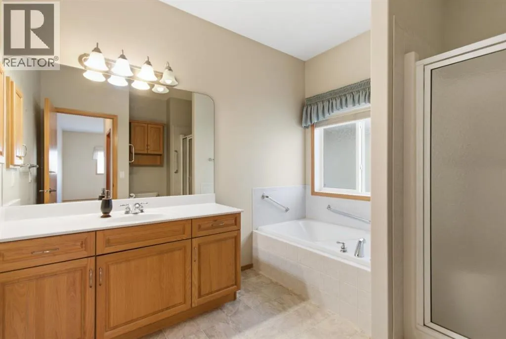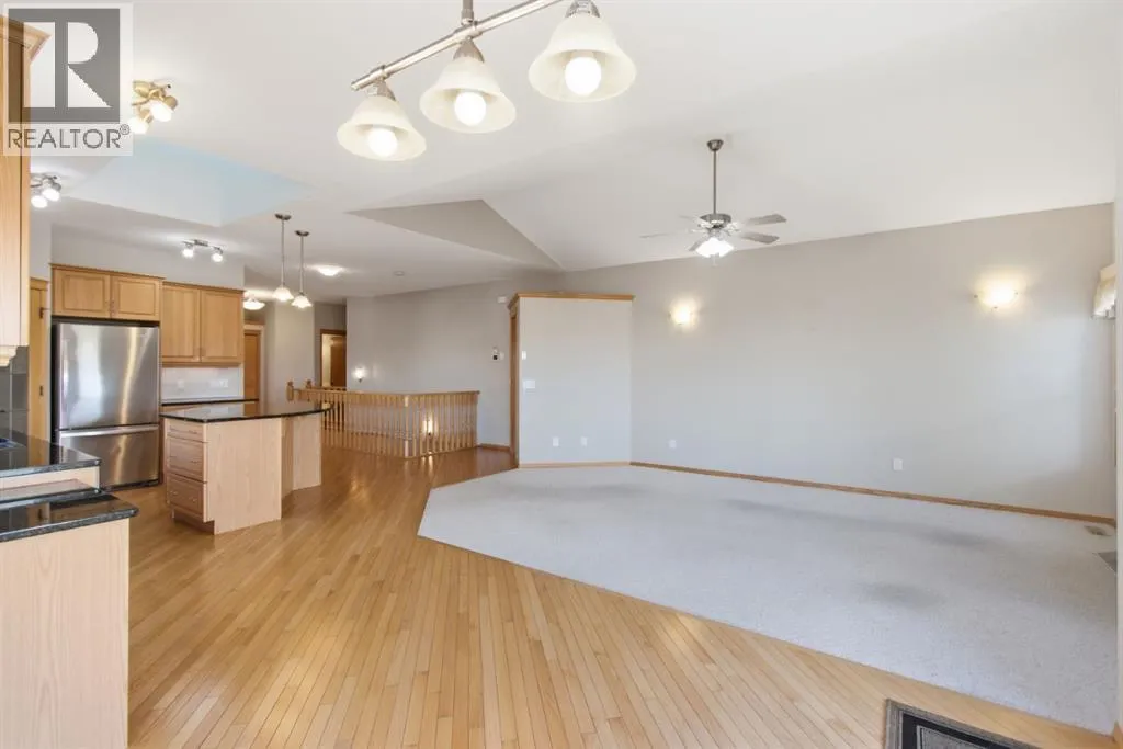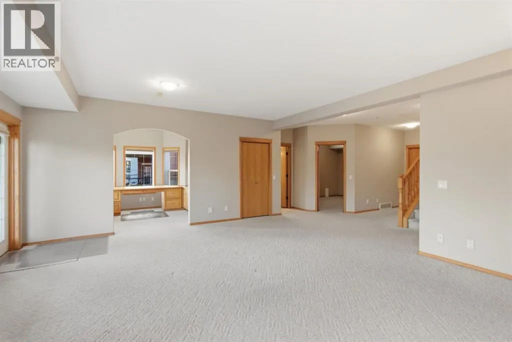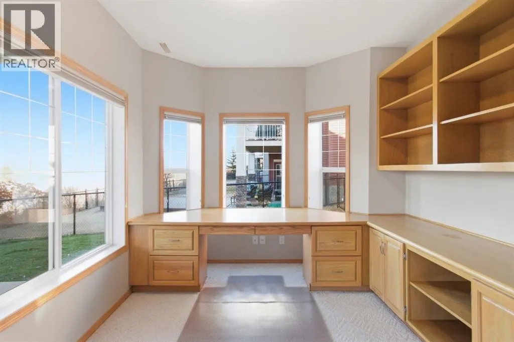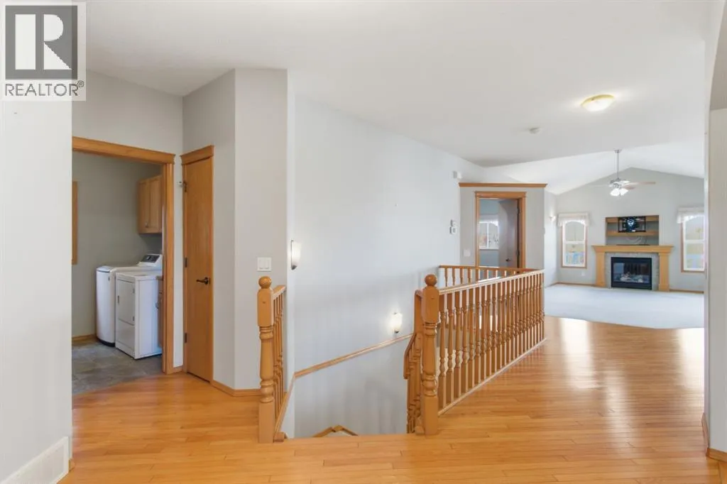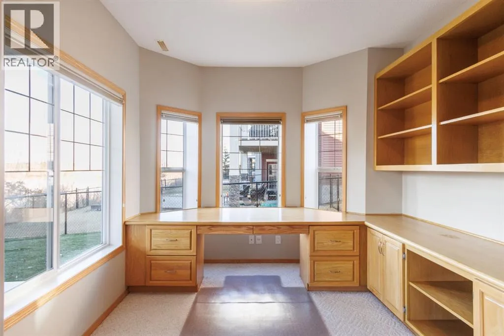 This meticulously well kept bungalow in Coopers Crossing, with over 2800 sq ft of living space, features an open-concept main floor designed for effortless living and entertaining. The heart of the home is a bright kitchen equipped with a central island, granite counter tops, and skylight, which flows directly into a vaulted living room anchored by a fireplace. The primary bedroom suite offers a walk-in closet and a 4pc ensuite, complemented on the main level by a dedicated den/office or formal dining room, main floor laundry, a 2 piece bath, and a large two-car garage (21'x23'). The fully developed walk-out basement provides extensive additional living space, centered around a large recreation room with built-in oak shelving and a second fireplace. This lower level also includes two well-sized bedrooms, a private office, a full 4pc bath, and a substantial unfinished area for utility and storage. Outside, the property boasts an elevated rear deck with glass railings overlooking a serene water feature, while the lower level opens to a covered patio and manicured lawn. Book your showing today! (id:27476)
