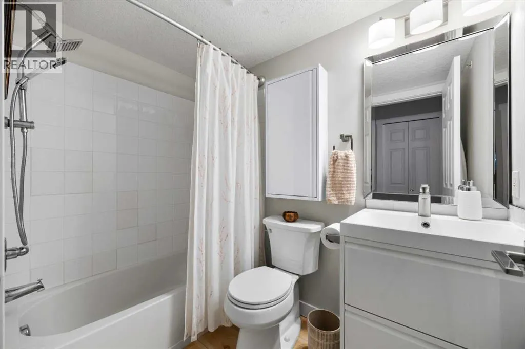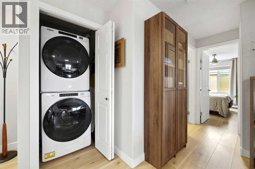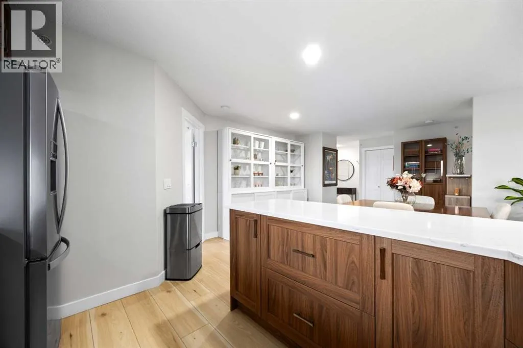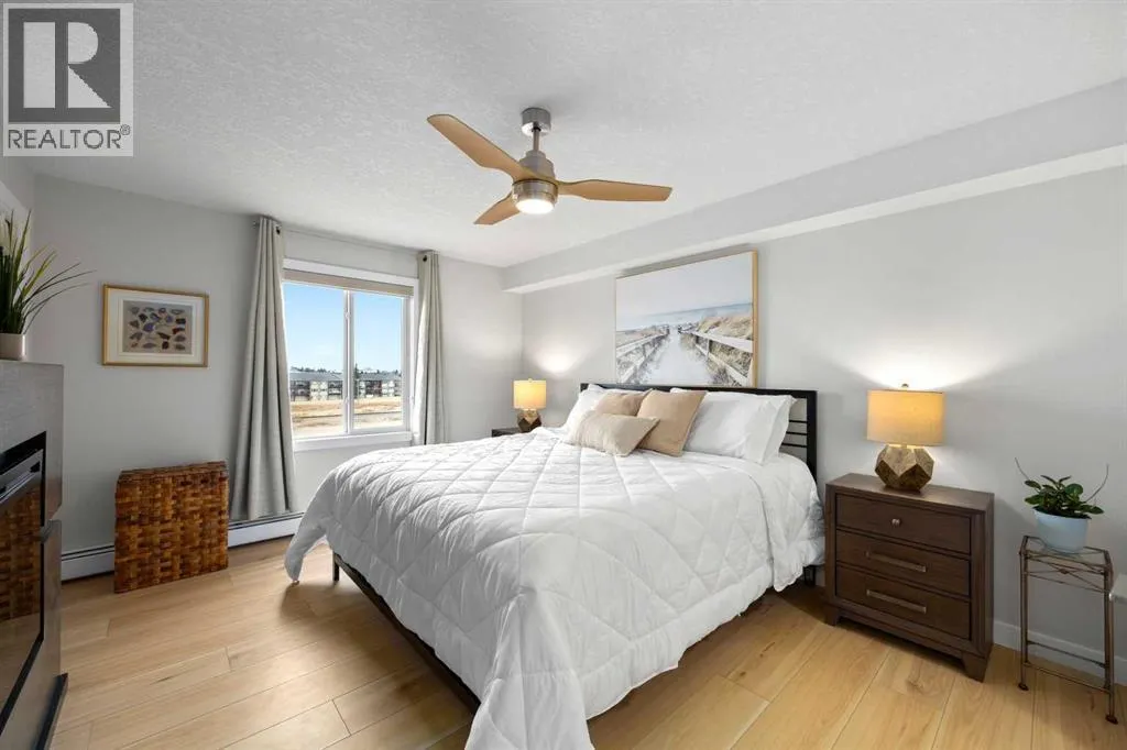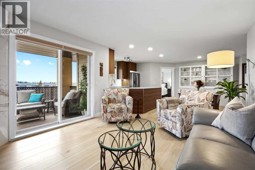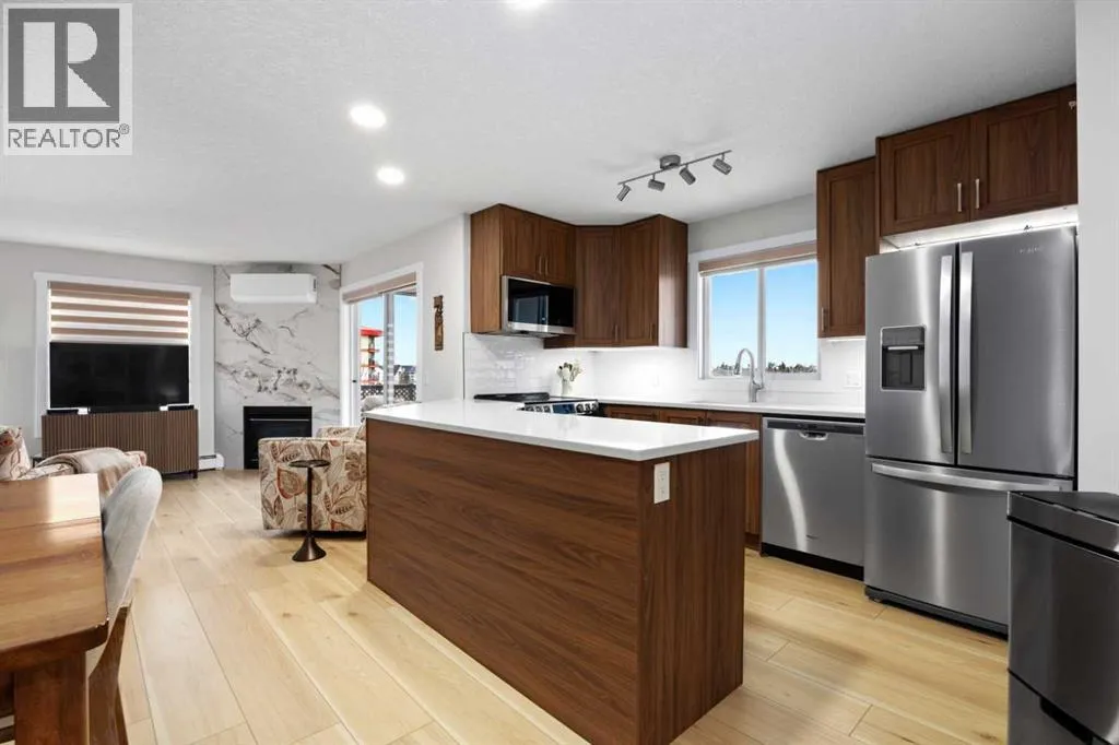 Beautifully renovated and move-in ready, this top-floor corner unit in Mackenzie Pointe offers exceptional finishings, abundant natural light, and a highly walkable location. More than $50,000 in professional upgrades over the past two years have elevated the home throughout, including air conditioning, a stunning new kitchen, refreshed bathrooms, new flooring, lighting, paint, window coverings, and a striking floor-to-ceiling tiled fireplace. The open-concept layout connects the kitchen, dining, and living areas, leading to a spacious covered patio with gas line for year-round outdoor enjoyment. The private primary suite features a generous walk-through closet and upgraded ensuite, complemented by a well-sized second bedroom, a four-piece main bath, full-size laundry, and excellent in-suite storage. Enjoy outstanding walkability, with shopping, restaurants, medical and professional services, parks, and scenic pathways all just a short walk away. Parking and storage are exceptional, including an oversized titled underground stall next to the elevator, a second outdoor stall near the main entrance, and a spacious titled storage locker tucked away in a secure room conveniently located beside the elevator. This well-managed complex offers true lock-and-leave living, with condo fees that include all utilities even electricity (unlimited AC use during hot summers), exterior maintenance, landscaping, and snow removalâan ideal choice for buyers seeking quality, convenience, and long-term peace of mind. (id:27476)
