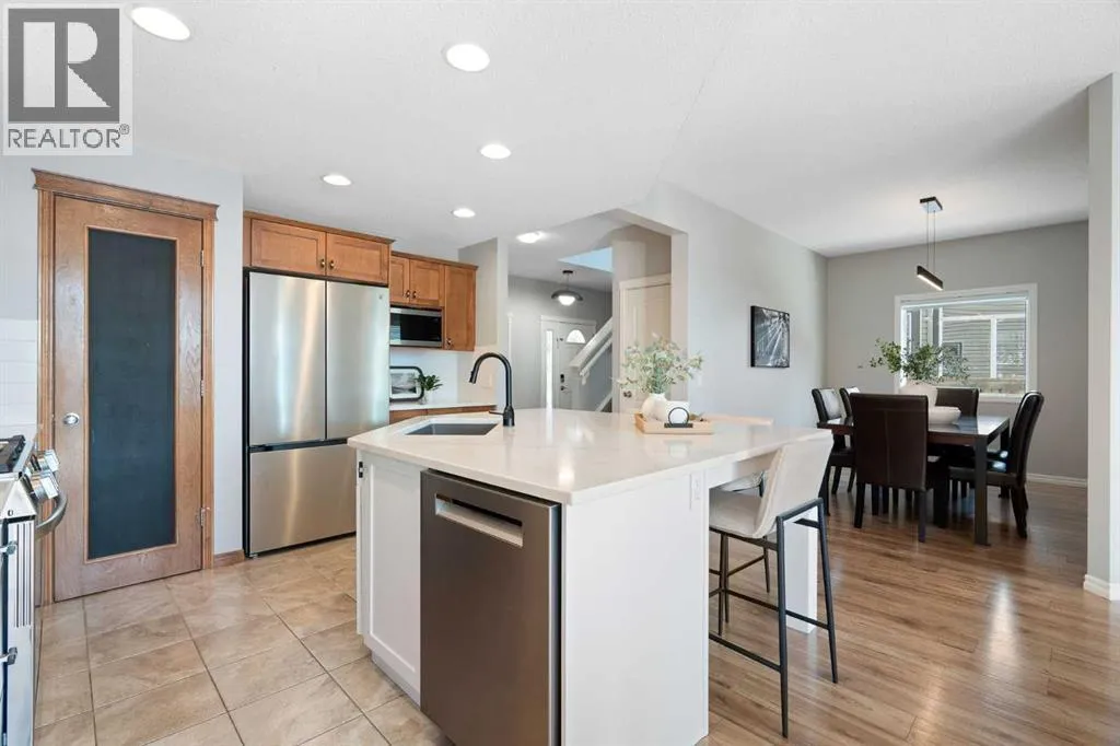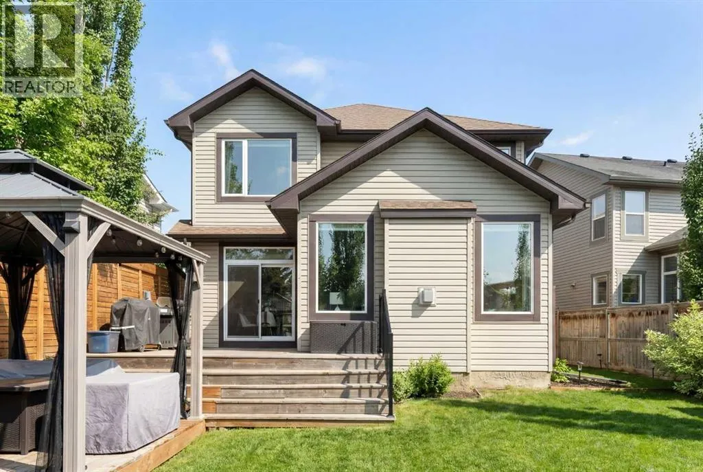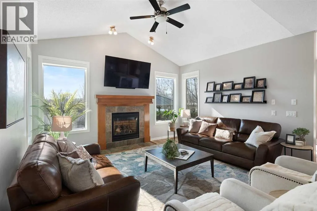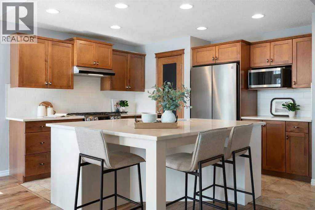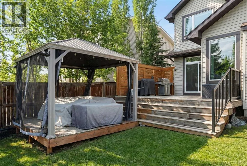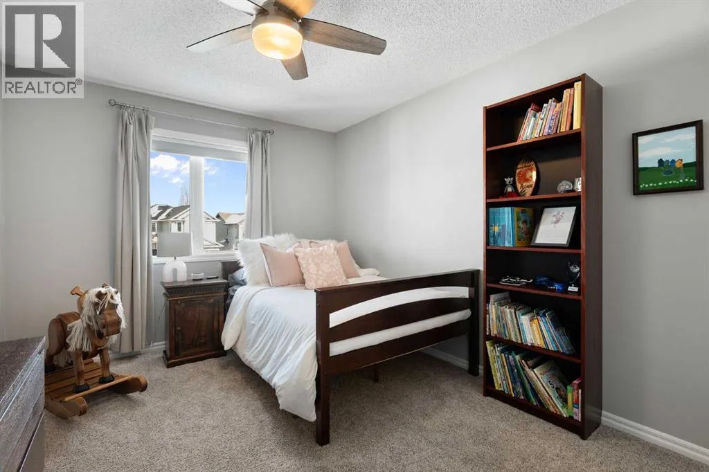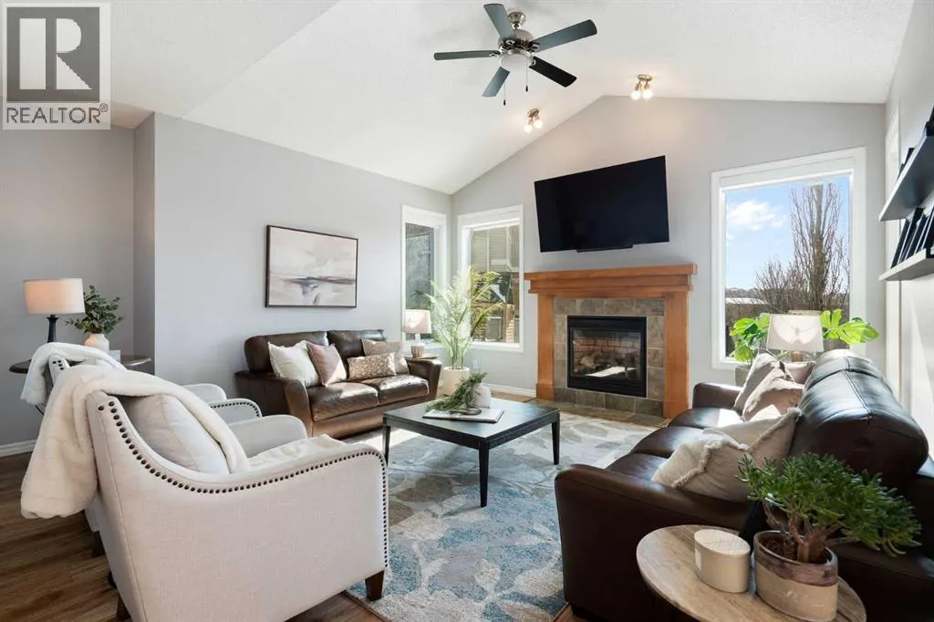 Hello, Gorgeous! Welcome to 142 Coopers Bay SW in Airdrie, located in the highly sought-after community of Coopers Crossing. This fully developed two-storey home offers over 2,200 sq ft above grade, 4 bedrooms, and 3.5 bathrooms, providing a functional layout suited for family living.The main floor features a spacious living room with a gas fireplace and large windows for natural light. The kitchen has been updated with a renovated island, countertops, and backsplash, along with newer appliances including a stove (2024), dishwasher (2025), hood fan (2025), washer and dryer (2025), and refrigerator (2026). A dining area, breakfast nook, main-floor laundry, and 2-piece bathroom complete this level.Upstairs includes a primary bedroom with a walk-in closet and 5-piece ensuite featuring dual sinks, a soaker tub, and separate shower. Two additional bedrooms, a 4-piece bathroom, and a bonus room provide additional living space.The fully developed basement includes a recreation room with a second gas fireplace, a fourth bedroom, a 3-piece bathroom, and storage space.Additional features include air conditioning, a heated double attached garage, and added insulation in the attic and garage.Situated on a large south facing pie-shaped lot in a quiet cul-de-sac, the property offers a fully fenced yard with a deck and is located close to parks, pathways, schools, and amenities. (id:27476)