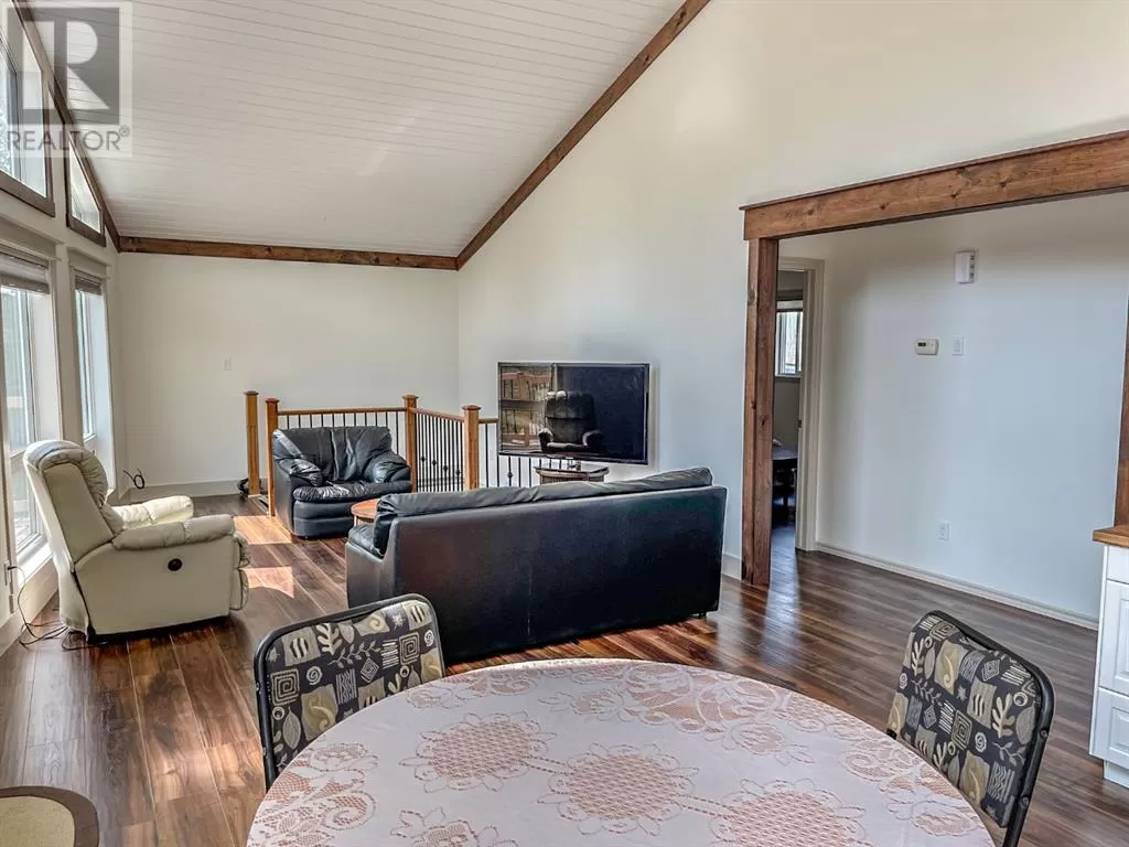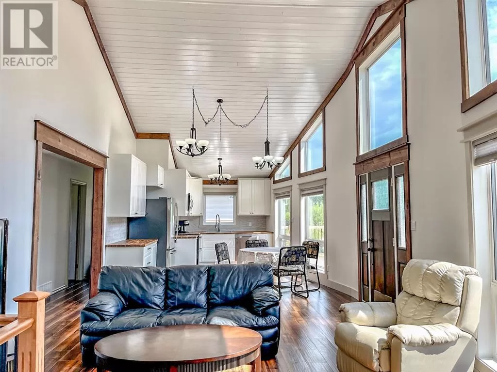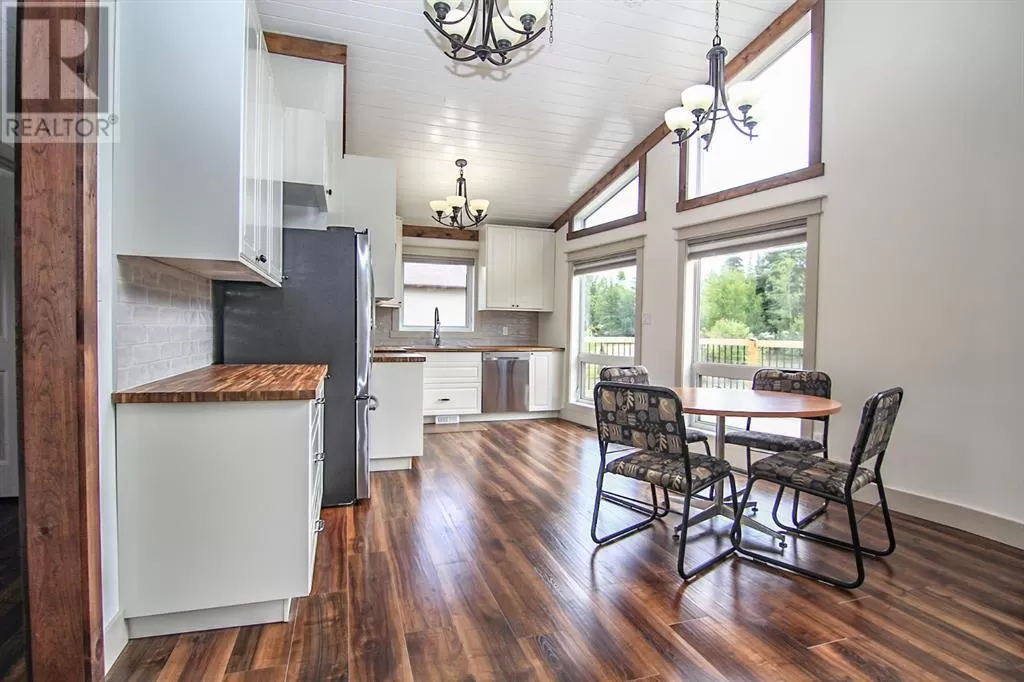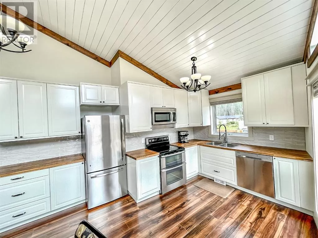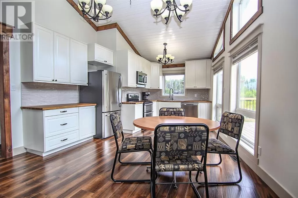 Welcome to 146 Hopegood Drive, country living at its best, located in Anzac, Alberta, and close to Gregoire lake sits the beautifully renovates A-frame log cabin that sits on a 1-acre lot.The extensive renovations are listed at the bottom of this description. But it's all about location, location, location, and the peace and quiet that acreage living brings.This home features a large open concept main floor living space in the front of the home that has vaulted ceilings and loads of floor-to-ceiling windows to let in all the natural light. The good size eat-in kitchen has ample cupboard and countertop space stainless steel appliances subway tile backsplash and to the back of the home 3 good size bedrooms, main floor laundry, and a 4 pc bathroom. The well-placed staircase leads to the basement with the 9-foot ceiling where you will find 2 more bedrooms a flex room that can be used for an office exercise room or playroom with good size windows and second laundry location large storage room and there is a separate entrance that leads to the back yard. The beautiful wrap-around deck is the perfect place to enjoy your morning coffee or entertain family and friends with a BBQ.Anzac has all the amenities that city living has with less hustle and bustle, grocery store, pizza, fast food delivery, a gas bar, and liquor store Schools and Rec center also a brand new fire department.List of recent renovations New appliances. New flooring upstairs. New vanities and sinks. Replaced lights upstairs. New exterior doors and upstairs (one fiberglass). New kitchen cabinets and countertops. New kitchen faucet. All new interior doors. New kitchen backsplash tiling. New bathroom/ side entrance tiling. New upstairs bedroom windows and one new window in the living room. Sanded and painted exterior. Made positive grading around the house with a gravel top. New sump pump. New suspended ceiling downstairs. New drywall and paint. New deck railing on the outside. Tubs also have new facet s. (id:27476)