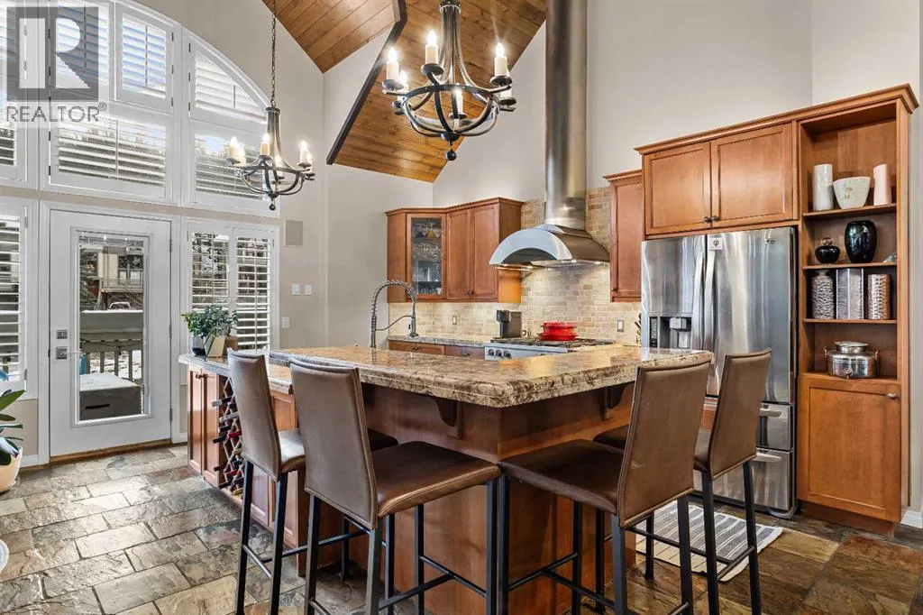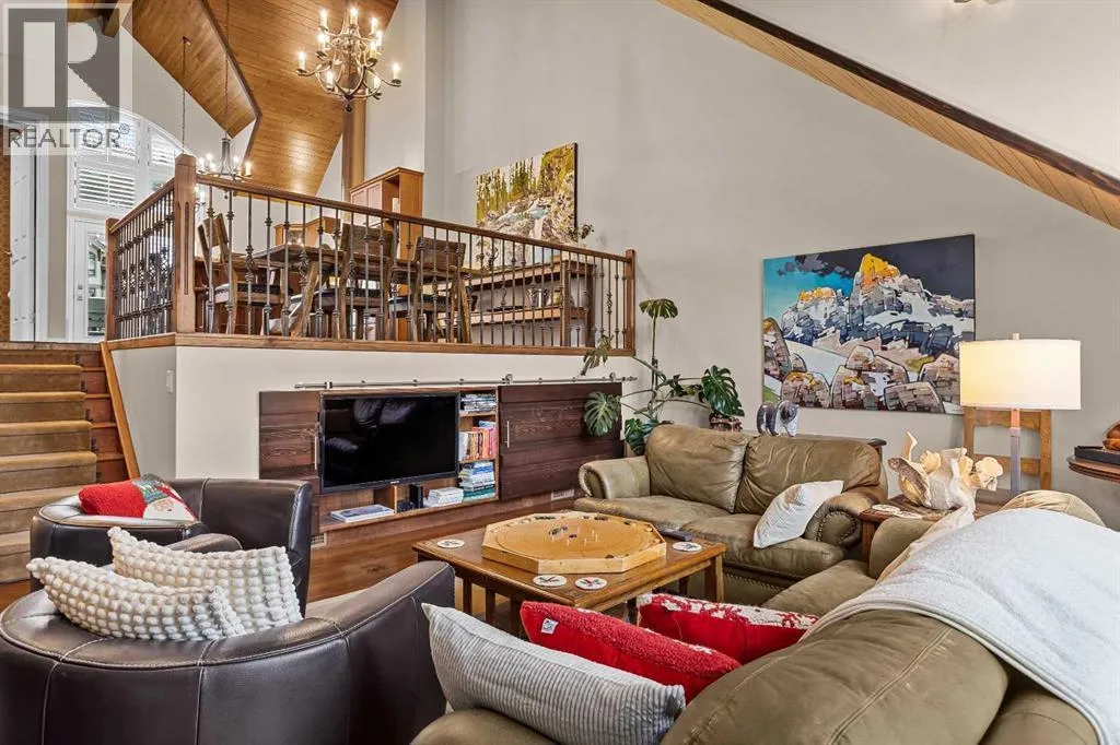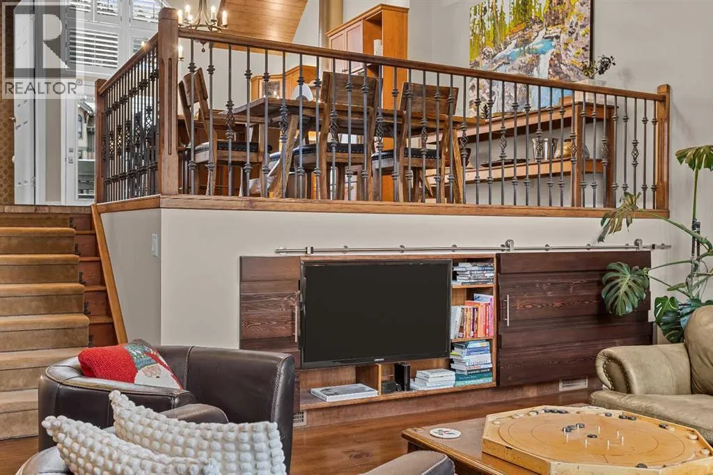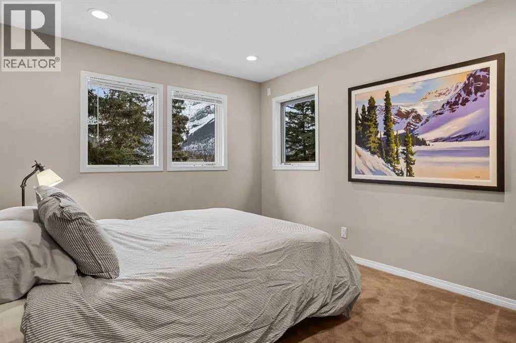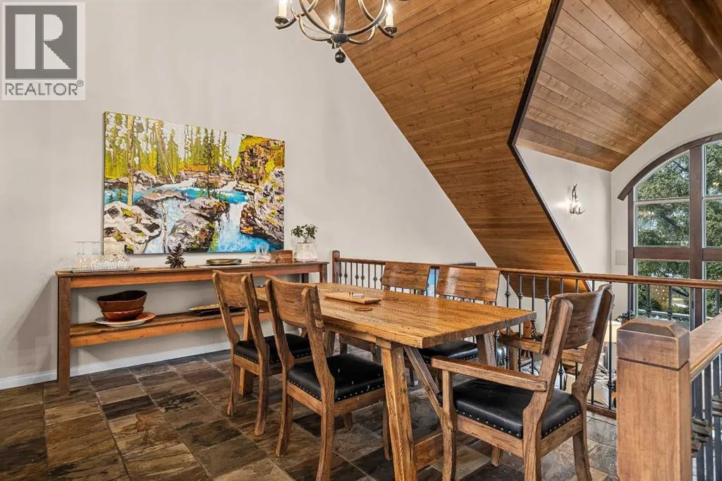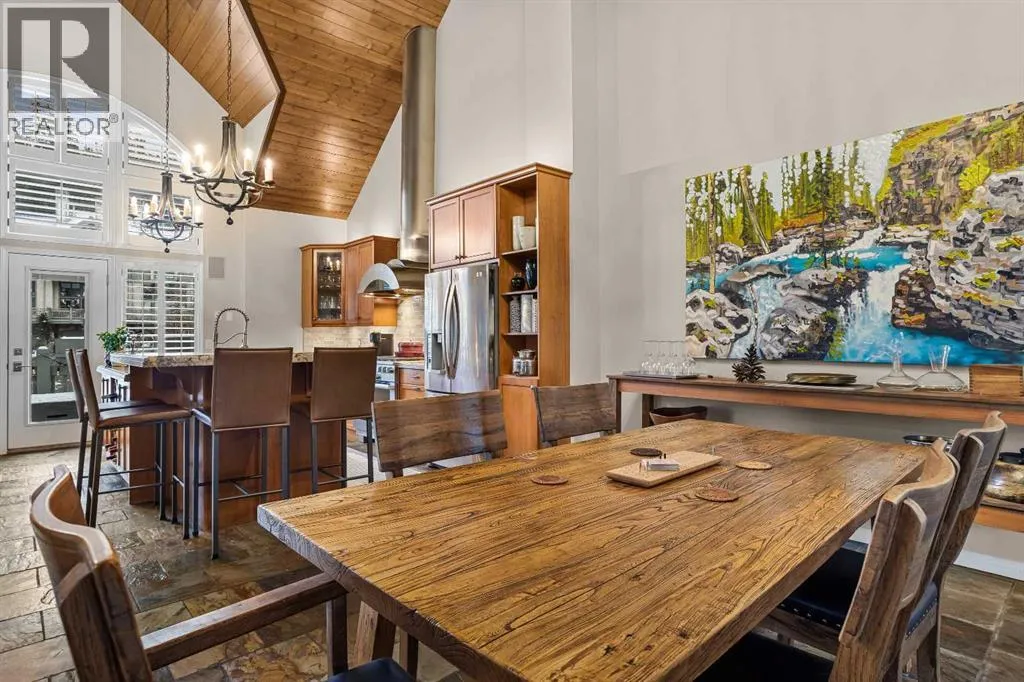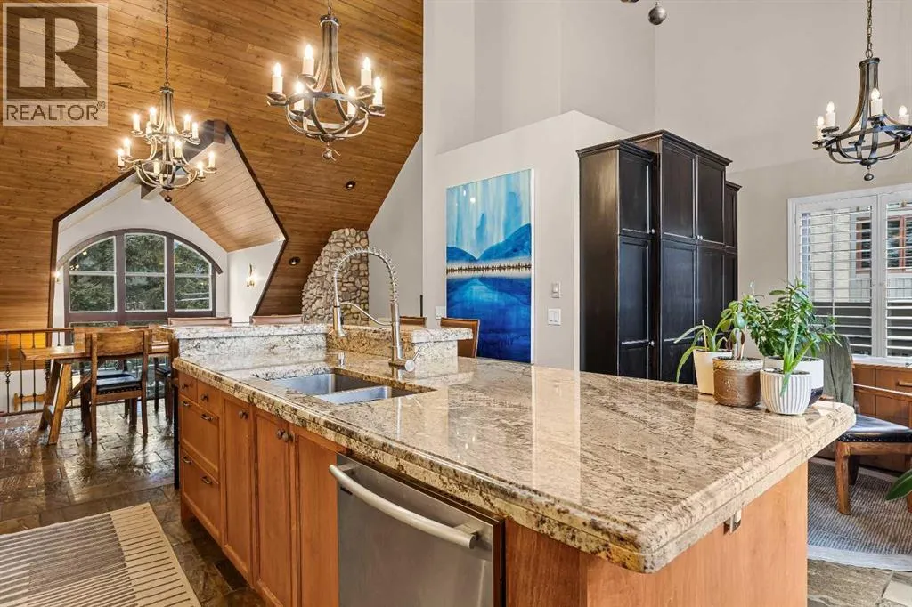Luxurious End Unit Townhome in Exclusive Banff Neighbourhood - Tatanga Ridge I !This spacious, 2,716 sq.ft. alpine styled three bedroom plus den home stands in a class of its own â offering a level of finish, charm and functionality unmatched by anything currently on the market.Tastefully upgraded from top to bottom, the home welcomes you on the main level with a large sunny south facing balcony with massive windows that flood the interior with natural light. At the heart of this level is a dream kitchen with granite countertops, undermount sink, brick backsplash, oversized Miele gas range, custom hood fan, and stainless fridge with French doors. This level is accentuated with beautiful slate flooring and custom lighting and includes the dining area, home office, powder room and roomy foyer. Striking vaulted ceilings, clad in rich tongue and groove pine planks and accentuated with prominent timber beams guide you down to an airy and warm living room with a floor to ceiling river rock wood burning fireplace, a cozy alpine feature. Grand windows and a wrap around deck capture incredible views of Norquay and Cascade mountains. Gorgeous wide plank Douglas Fir flooring in the living room and primary bedroom create warmth and comfort. The tranquil primary bedroom comes complete with a slate accented gas fireplace with timber mantle, private deck, and full spa like ensuite bathroom with soaker tub and separate enclosed steam shower. The versatile bonus room/den complete with gas fireplace, custom bar made from west coast Maple with live edge and wine rack offers the perfect setting for movie nights, quiet reading or watching the big game. The lower level consists of two roomy bedrooms, a full bathroom, and separate laundry room. Lastly, for all your mountain toys there is a large attached double car garage featuring epoxy-coated flooring and storage for your year-round adventure gear. For added safety a fire smart all metal roof sprinkler system has been i nstalled to protect against possible wildfire. This home has everything you are looking for in a mountain home and more! (id:27476)