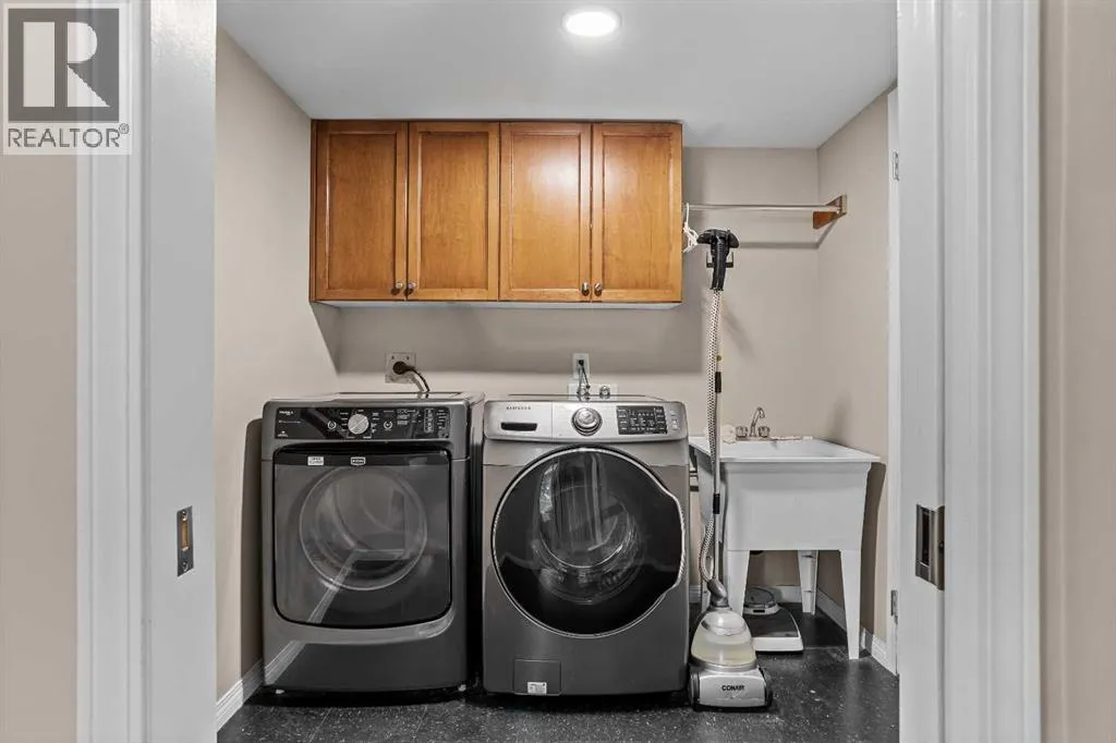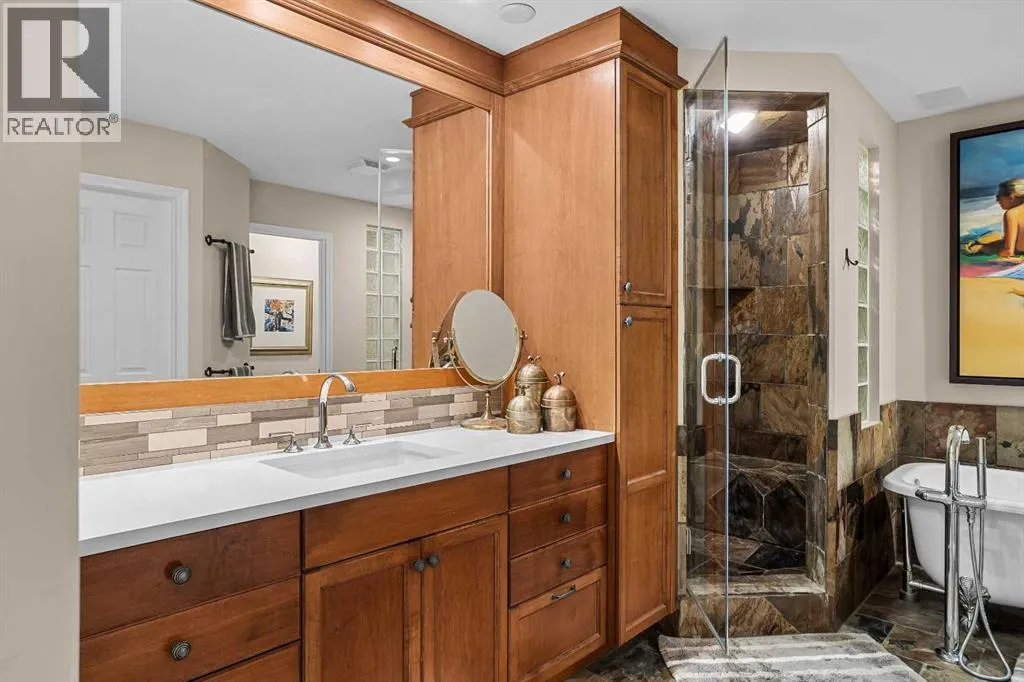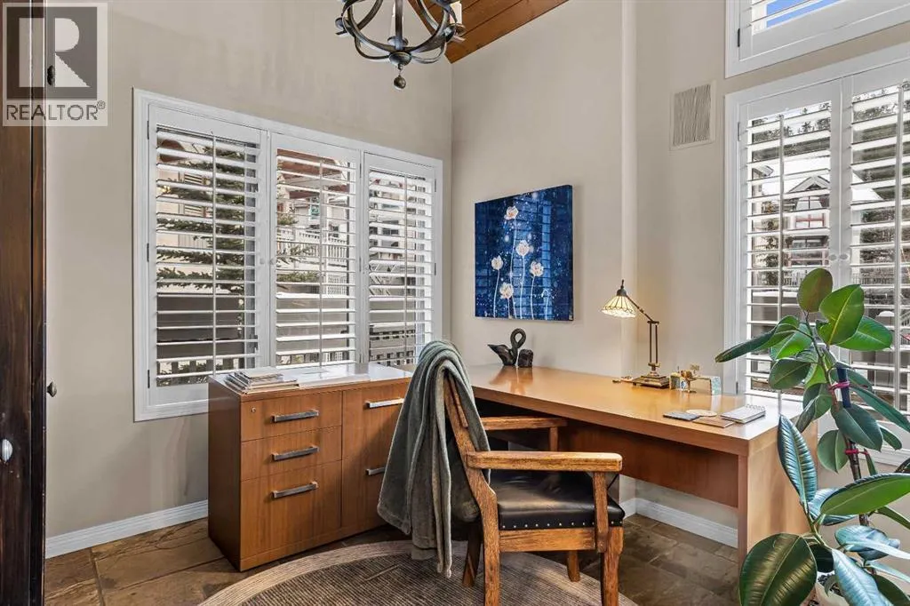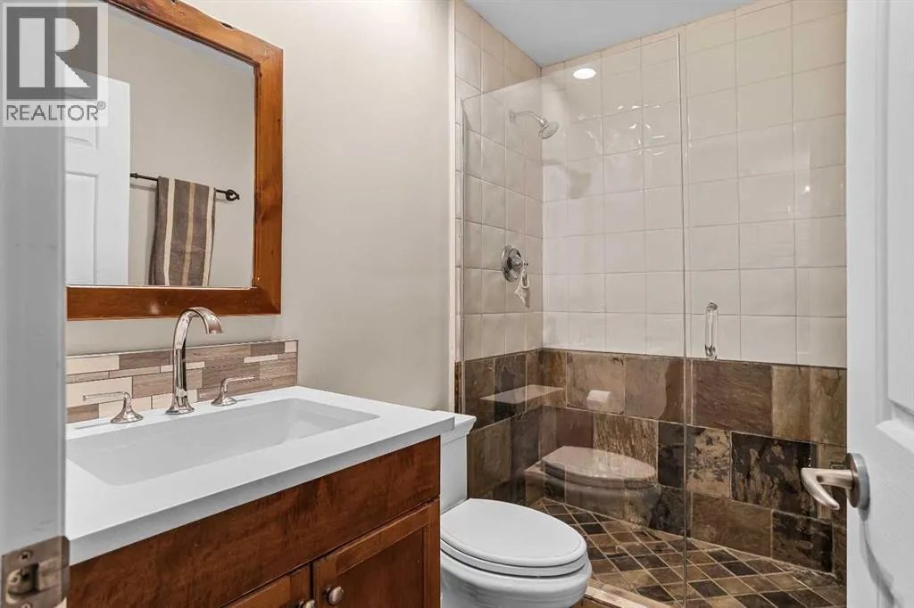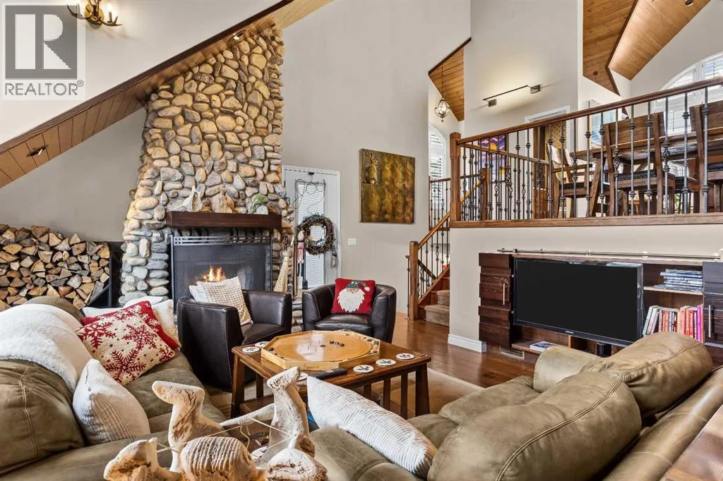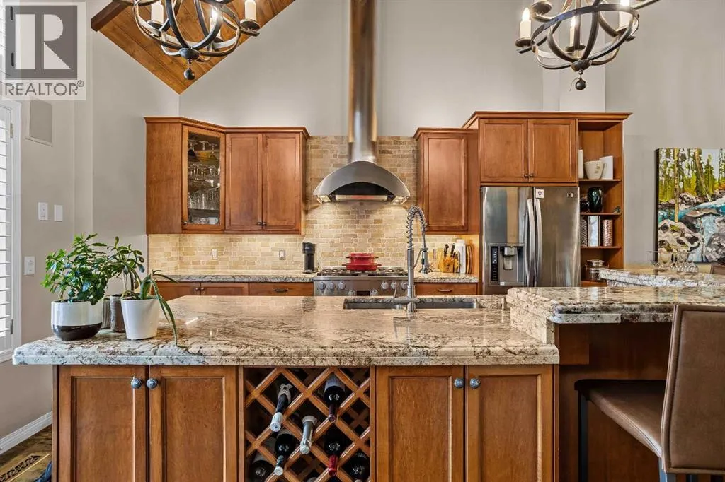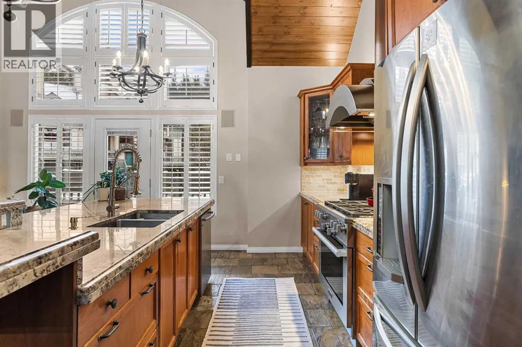 Luxurious End Unit Townhome in Exclusive Banff Neighbourhood - Tatanga Ridge I !This spacious, 2,716 sq.ft. alpine styled three bedroom plus den home stands in a class of its own â offering a level of finish, charm and functionality unmatched by anything currently on the market.Tastefully upgraded from top to bottom, the home welcomes you on the main level with a large sunny south facing balcony with massive windows that flood the interior with natural light. At the heart of this level is a dream kitchen with granite countertops, undermount sink, brick backsplash, oversized Miele gas range, custom hood fan, and stainless fridge with French doors. This level is accentuated with beautiful slate flooring and custom lighting and includes the dining area, home office, powder room and roomy foyer. Striking vaulted ceilings, clad in rich tongue and groove pine planks and accentuated with prominent timber beams guide you down to an airy and warm living room with a floor to ceiling river rock wood burning fireplace, a cozy alpine feature. Grand windows and a wrap around deck capture incredible views of Norquay and Cascade mountains. Gorgeous wide plank Douglas Fir flooring in the living room and primary bedroom create warmth and comfort. The tranquil primary bedroom comes complete with a slate accented gas fireplace with timber mantle, private deck, and full spa like ensuite bathroom with soaker tub and separate enclosed steam shower. The versatile bonus room/den complete with gas fireplace, custom bar made from west coast Maple with live edge and wine rack offers the perfect setting for movie nights, quiet reading or watching the big game. The lower level consists of two roomy bedrooms, a full bathroom, and separate laundry room. Lastly, for all your mountain toys there is a large attached double car garage featuring epoxy-coated flooring and storage for your year-round adventure gear. For added safety a fire smart all metal roof sprinkler system has been i nstalled to protect against possible wildfire. This home has everything you are looking for in a mountain home and more! (id:27476)