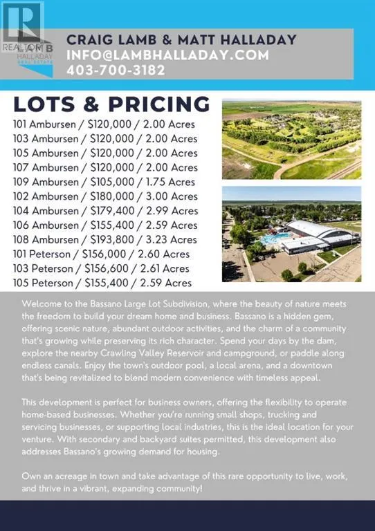 Welcome to the Bassano Large Lot Subdivision, where the beauty of nature meets the freedom to build your dream home and business. Bassano is a hidden gem, offering scenic nature, abundant outdoor activities, and the charm of a community that’s growing while preserving its rich character. Spend your days by the dam, explore the nearby Crawling Valley Reservoir and campground, or paddle along endless canals. Enjoy the town's outdoor pool, a local arena, and a downtown that's being revitalized to blend modern convenience with timeless appeal. This development features a total of 12 lots for sale, ranging from 1.7 acres to 3.22 acres, with water, gas, and power run to the lot line—making these lots ready to go for your dream build. Priced at just $60,000 per acre, this is an unbeatable value for such spacious and well-equipped property. As an added incentive, enjoy a 3-year tax rebate to make your investment even more rewarding! Perfect for business owners, this subdivision offers the flexibility to operate home-based businesses. Whether you’re running small shops, trucking and servicing businesses, or supporting local industries, this is the ideal location for your venture. With secondary and backyard suites permitted, this development also addresses Bassano’s growing demand for housing. Families will love the convenience of a K-12 school right in town, making it easy to settle in and enjoy all that Bassano has to offer. Own an acreage in town and take advantage of this rare opportunity to live, work, and thrive in a vibrant, expanding community! (id:27476)
