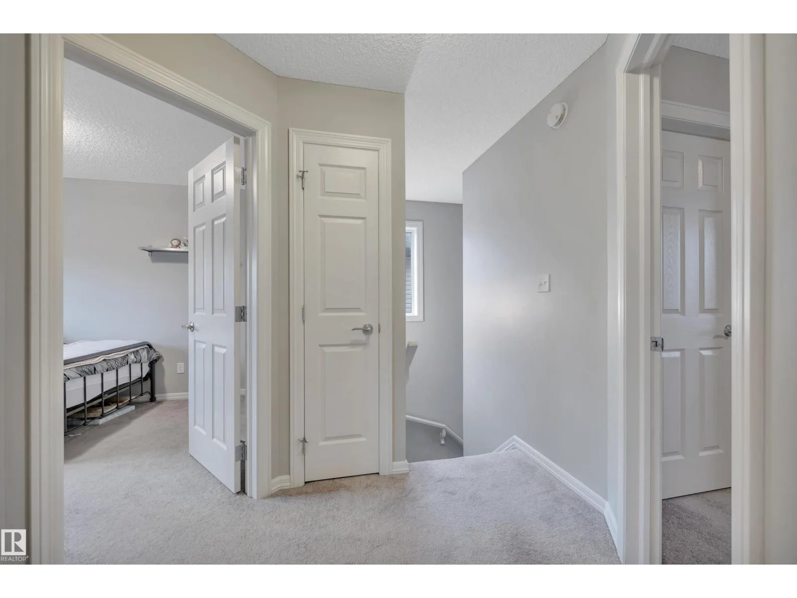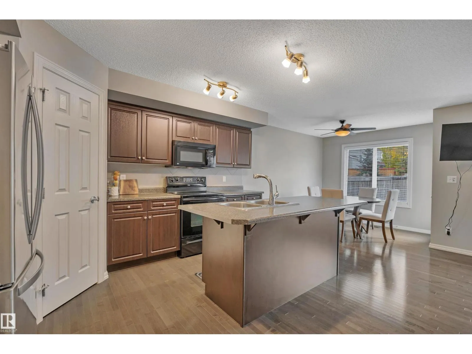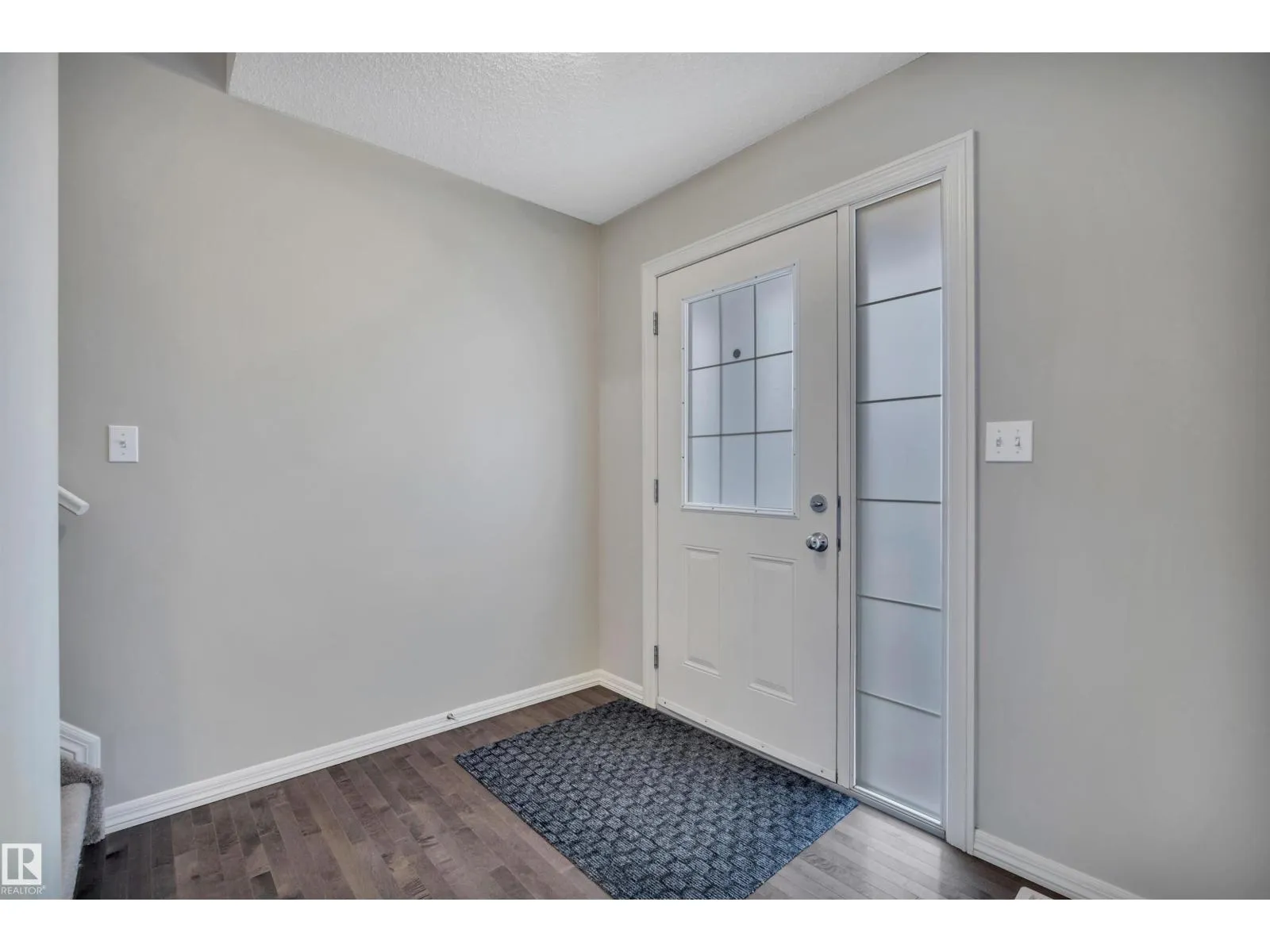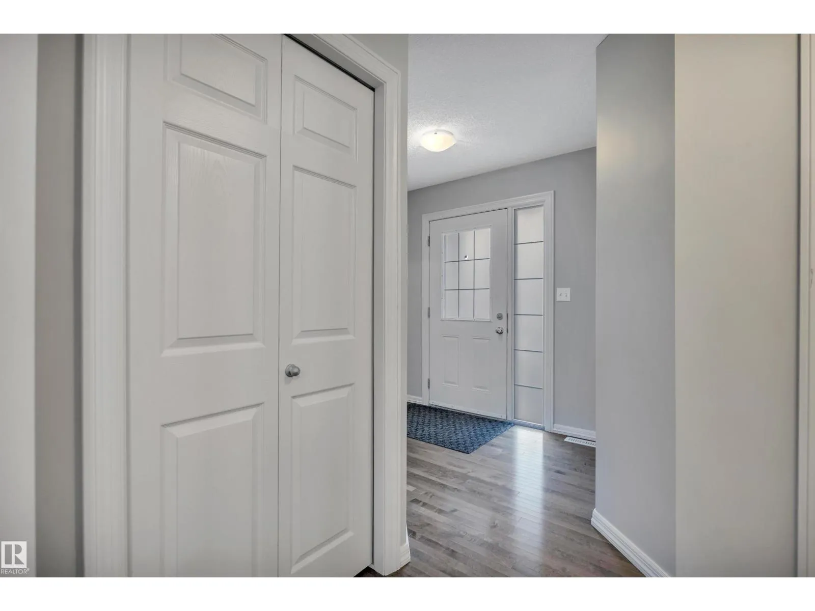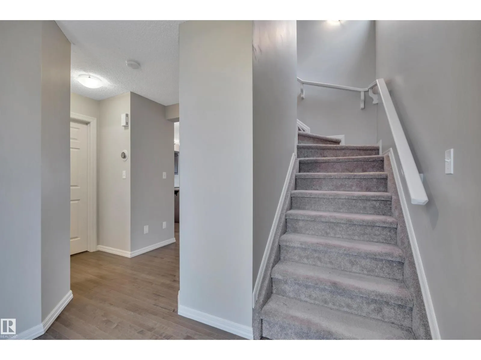 Backs Walking & Bike trails. A Duplex W/perfect blend of style and convenience for professionals or first-time buyers! Step inside to find gleaming hardwood floors throughout the main level, which features a handy walk-through pantry, main floor laundry & a 2 pce bathroom. Kitchen has a large island with sink, great lighting, looking onto the dinette with a garden door to back deck. Space is open concept, inviting you to the living room. Upstairs, you'll find three comfortable bedrooms with plush carpeting, including a generous primary bdrm with a 4 pce ensuite & walk in closet. An additional 4-piece bathroom serves the other rooms. Enjoy outdoor living on the deck, leading to a yard that backs onto a tranquil trail. A/C & water softener system recently added. The location is unbeatable: you're just 15 minutes from the EIA, and a simple street crossing brings you to a school, parks, trails, & playgrounds! Single attached finished garage, located on a quite street, this home makes life easy & affordable. (id:27476)