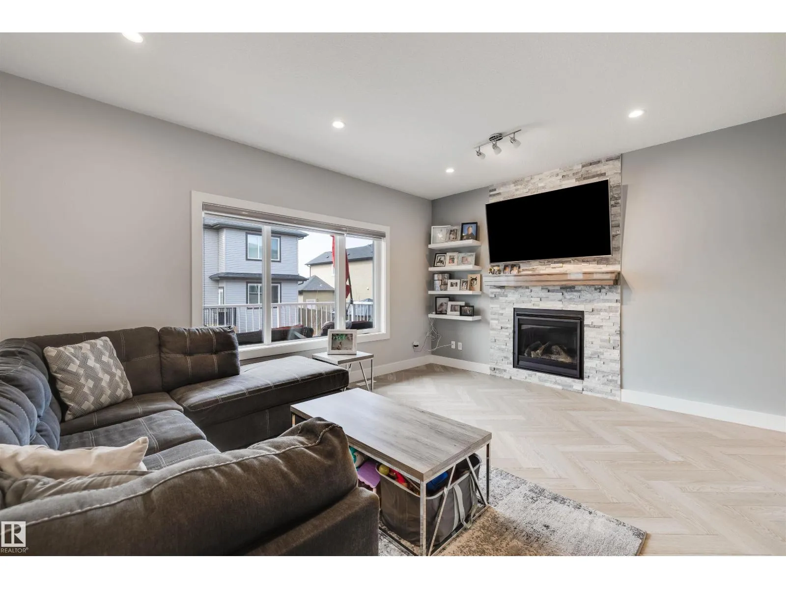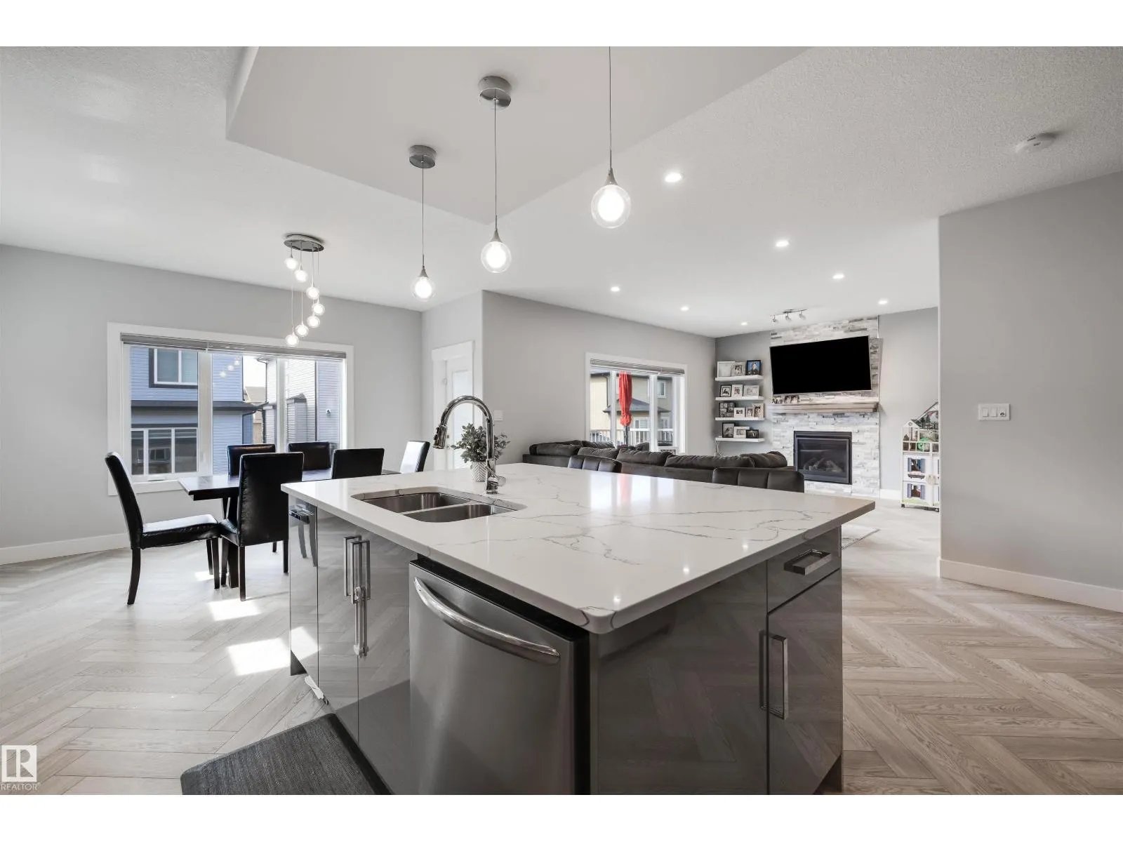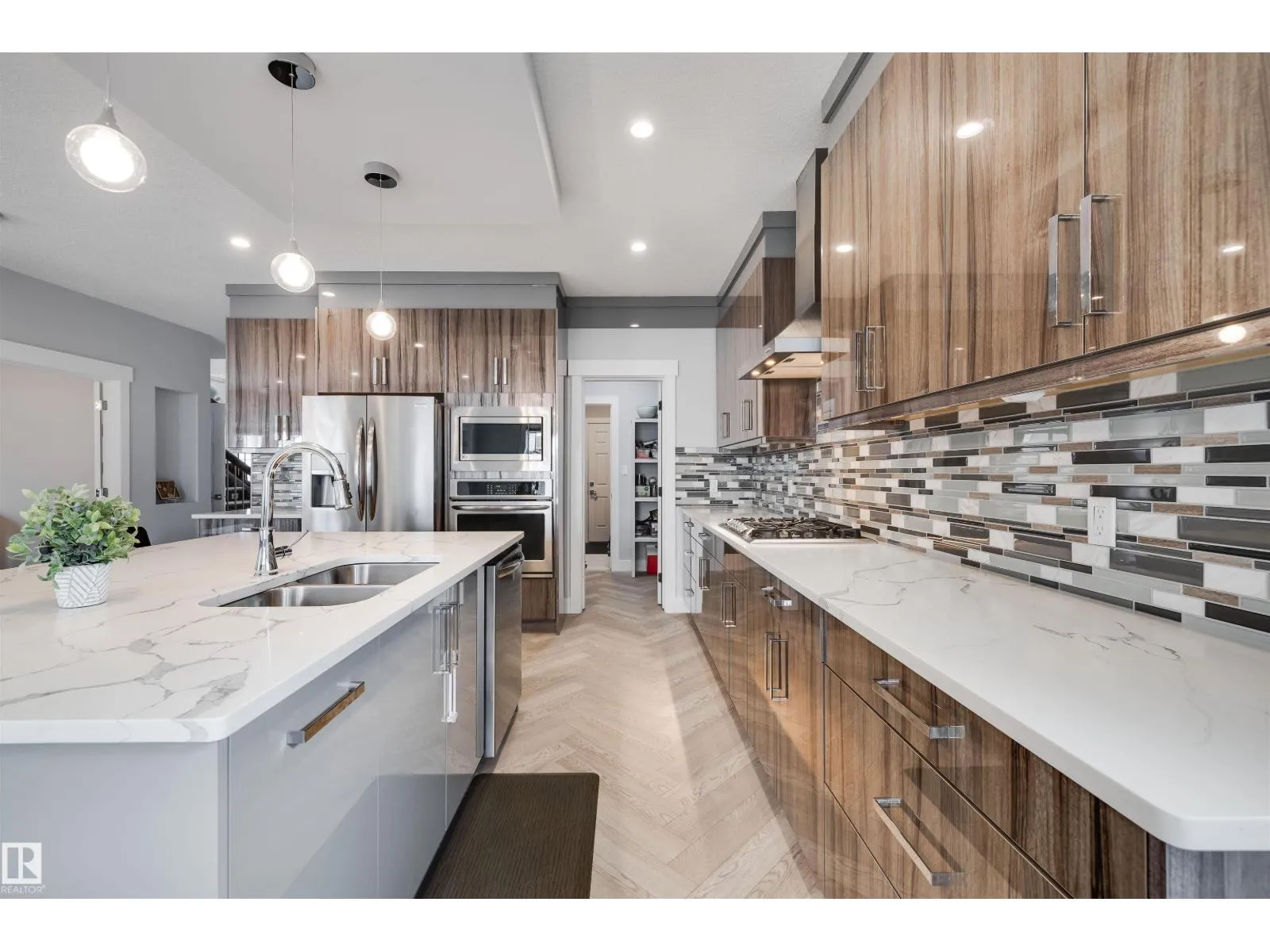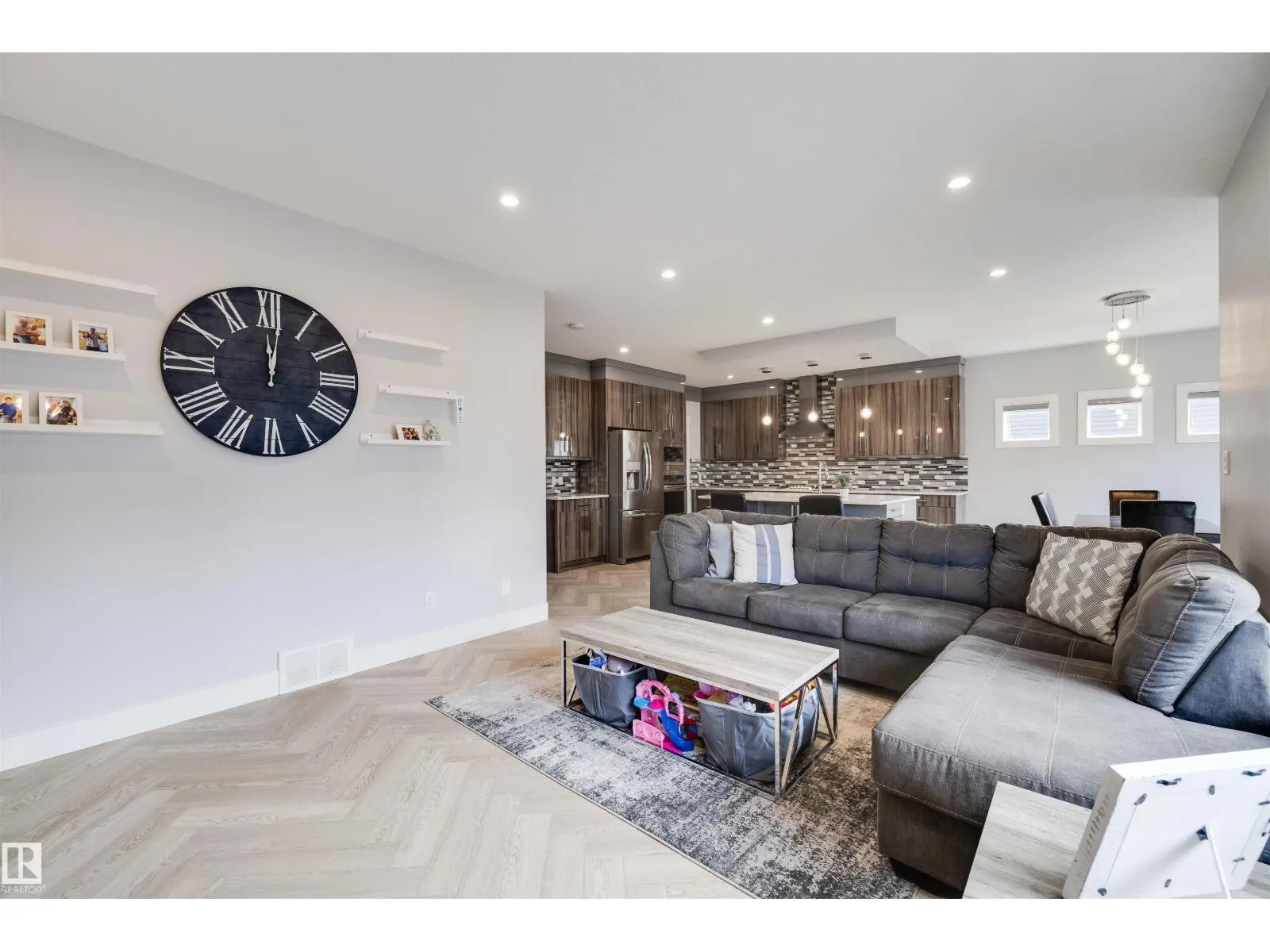 Gorgeous HERRINGBONE flooring throughout, setting warm and welcoming tones as you walk in. This home is offering over 4,000 sqft of serious comfort, function, and luxury. The main floor features 17 ft ceilings as you enter with an open concept kitchen, perfect for entertaining. Working from home? No problem, there's a DEN on the main. FIVE bedrooms, 3 upstairs, 2 in the basement. Think about the retreat to the luxurious primary suite with a spa-like bathroom, complete with a jetted tub, tiled shower, and large walk-in closet after a hard days work. FULLY FINISHED basement includes a WET BAR, generous rec room, cozy fireplaceâideal for guests or a growing family. A SEPERATE SIDE ENTRANCE could be convenient for a future suite in the basement customized by you, and the HEATED TRIPLE car attached garage offers both space and comfort year-round. Stay cool with central AIR CONDITIONING. From top to bottom, this home is full of upgrades and personalityâtruly an awesome place to call home. (id:27476)