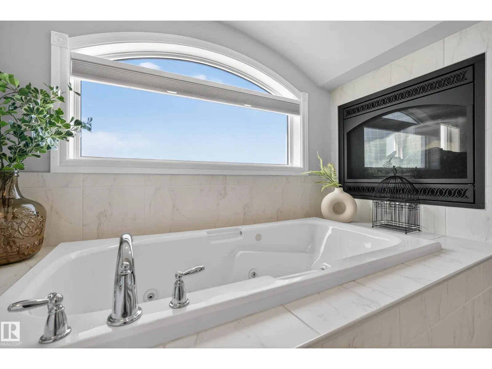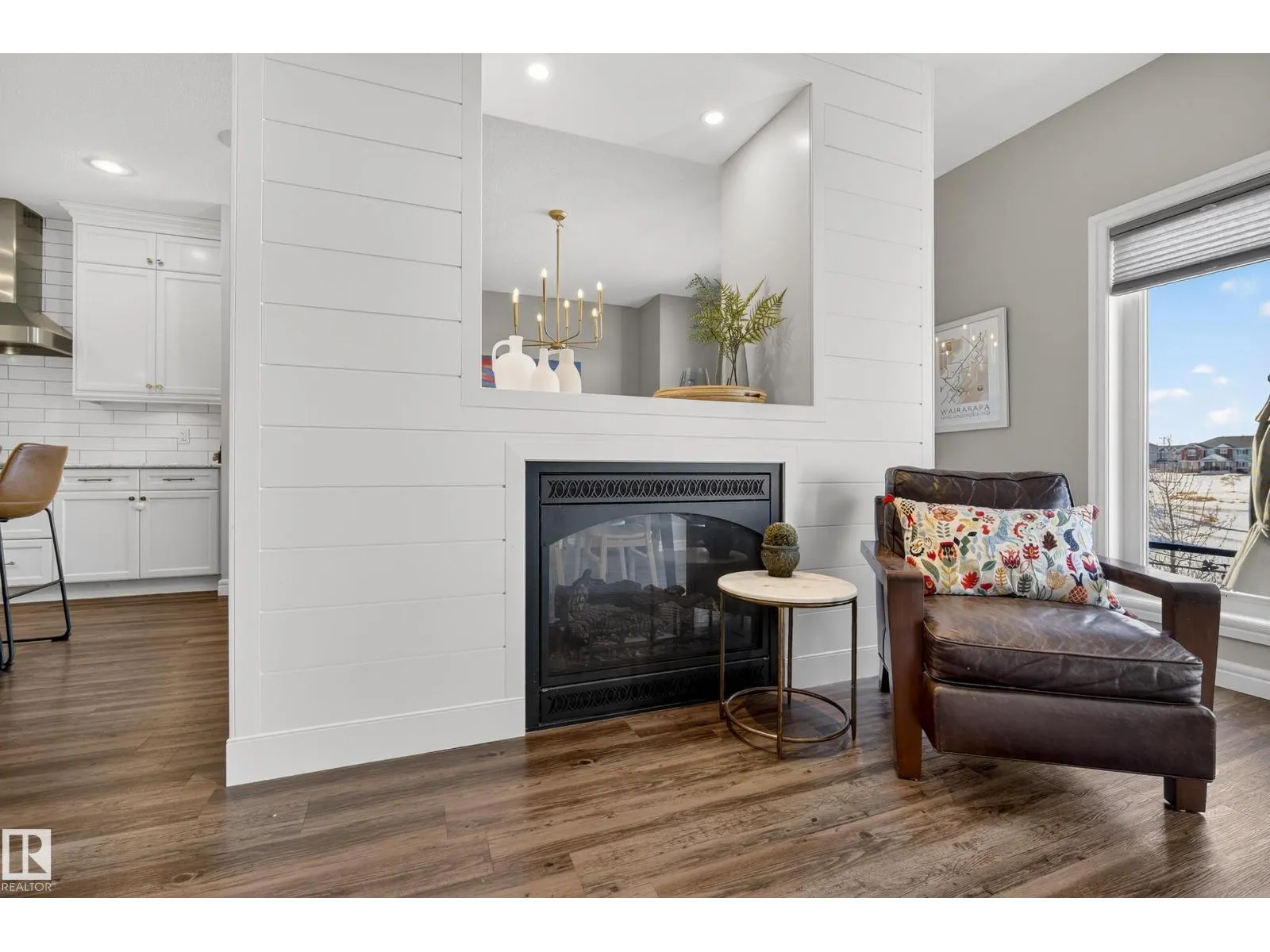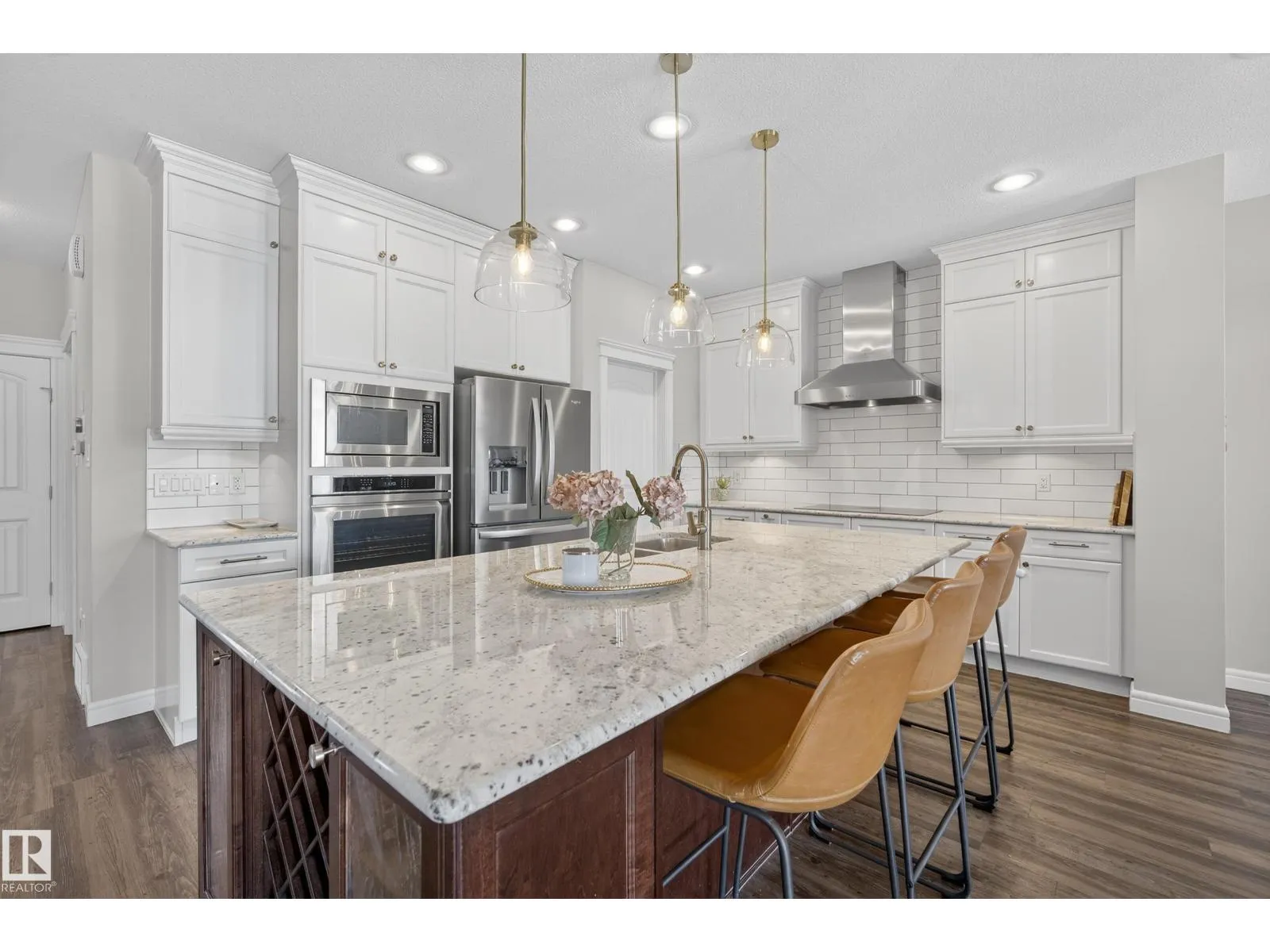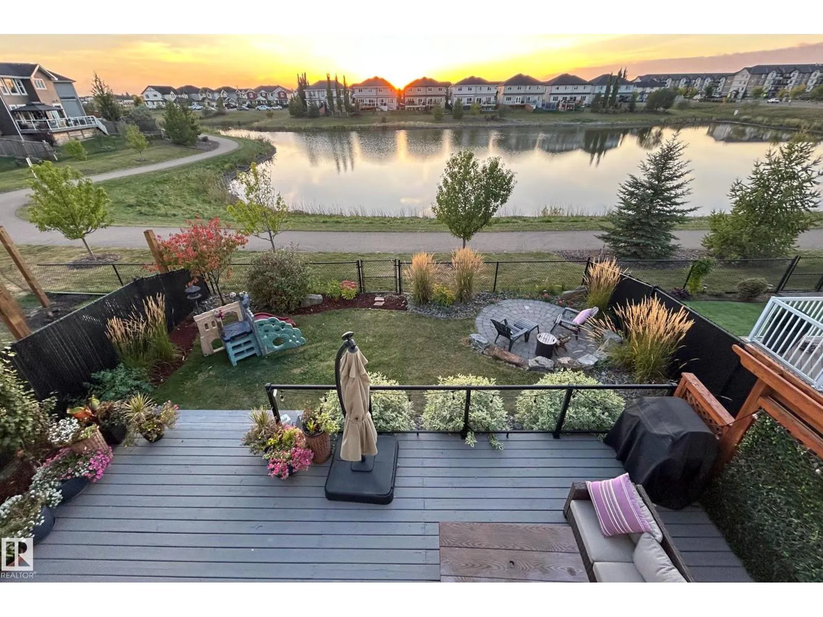 Enjoy stunning pond views and breathtaking west-facing sunsets from the spacious back deck of this beautifully designed home. Built by Pacesetter, it features a unique layout with two elegant double-sided fireplaces that add warmth and character to the main living areas. The bright open-concept design showcases oversized windows and luxury vinyl plank flooring. The chef-inspired kitchen is perfect for entertaining, complete with a large granite island, built-in wall oven, professional hood fan, full-height cabinetry, and classic white subway tile backsplash. Upstairs offers generous bedrooms with walk-in closets, a vaulted bonus room, convenient laundry, and a luxurious primary suite with spa-style ensuite, deep soaker tub, separate shower, heated towel rack, and its own two-way fireplace. The fully finished basement adds valuable living space with a bedroom, full bath, and spacious rec room. Oversized heated double attached garage. Close to pond trails, parks, amenities, and just steps to the K-9 school. (id:27476)