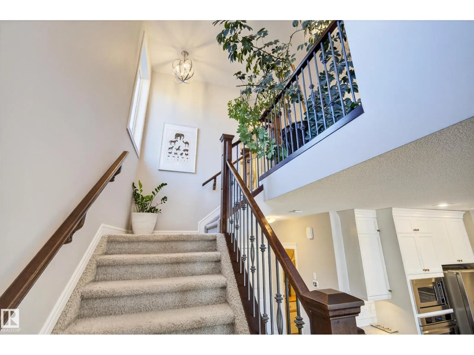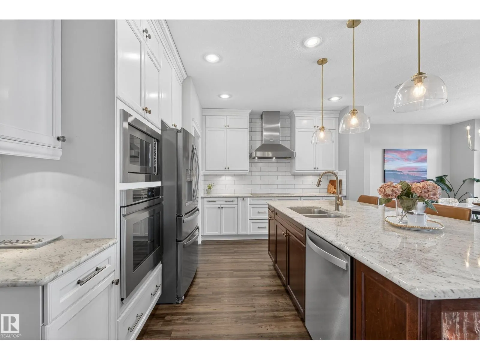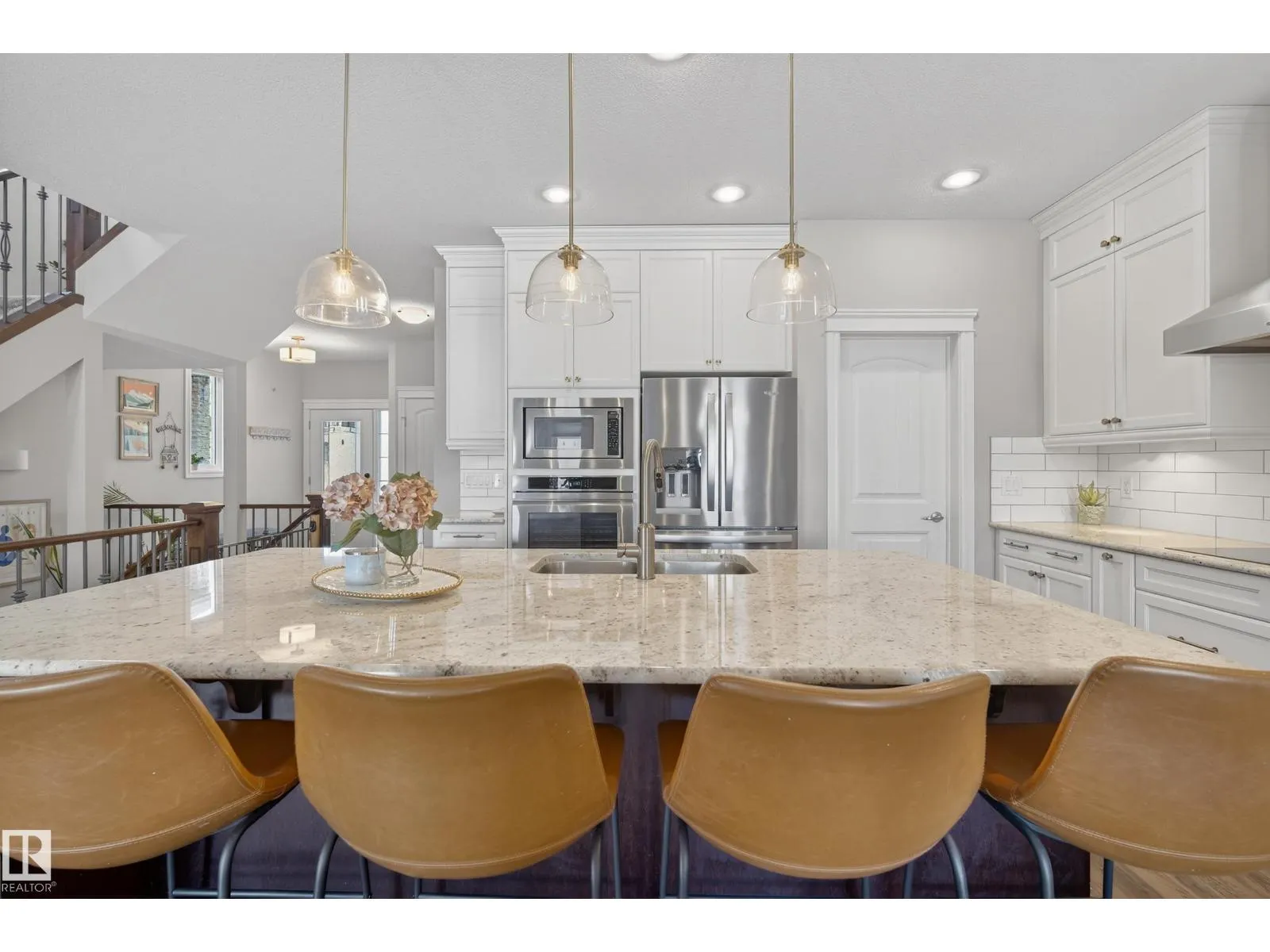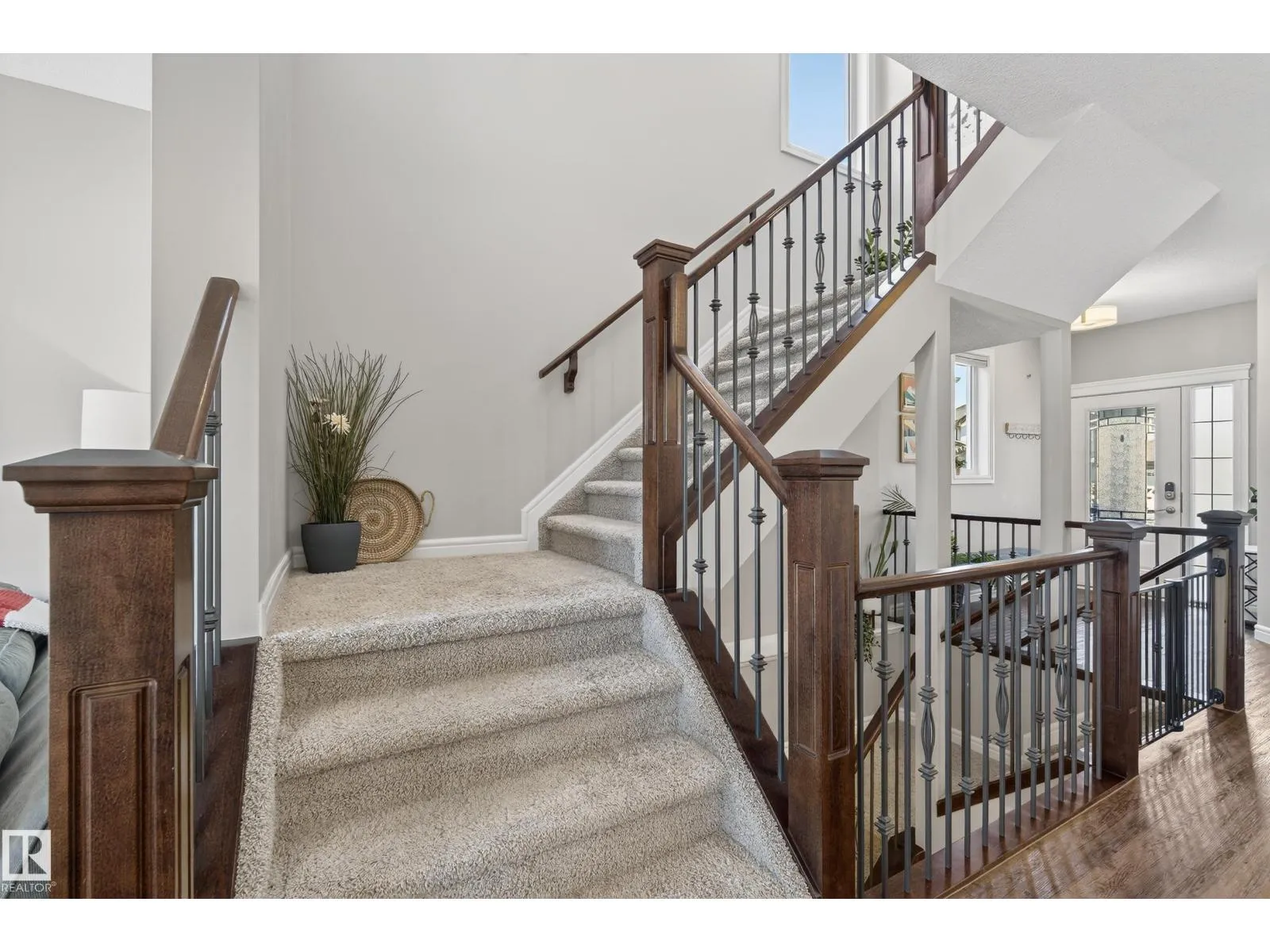 Enjoy stunning pond views and breathtaking west-facing sunsets from the spacious back deck of this beautifully designed home. Built by Pacesetter, it features a unique layout with two elegant double-sided fireplaces that add warmth and character to the main living areas. The bright open-concept design showcases oversized windows and luxury vinyl plank flooring. The chef-inspired kitchen is perfect for entertaining, complete with a large granite island, built-in wall oven, professional hood fan, full-height cabinetry, and classic white subway tile backsplash. Upstairs offers generous bedrooms with walk-in closets, a vaulted bonus room, convenient laundry, and a luxurious primary suite with spa-style ensuite, deep soaker tub, separate shower, heated towel rack, and its own two-way fireplace. The fully finished basement adds valuable living space with a bedroom, full bath, and spacious rec room. Oversized heated double attached garage. Close to pond trails, parks, amenities, and just steps to the K-9 school. (id:27476)