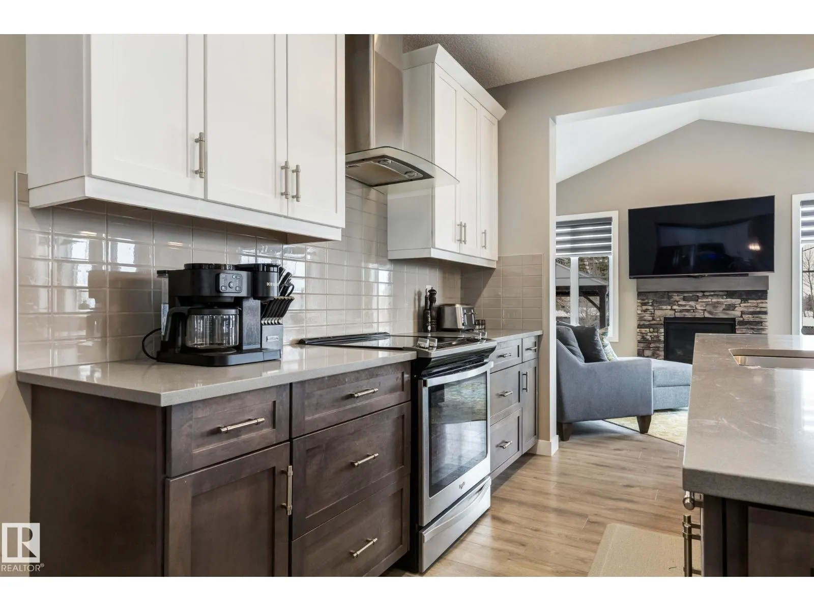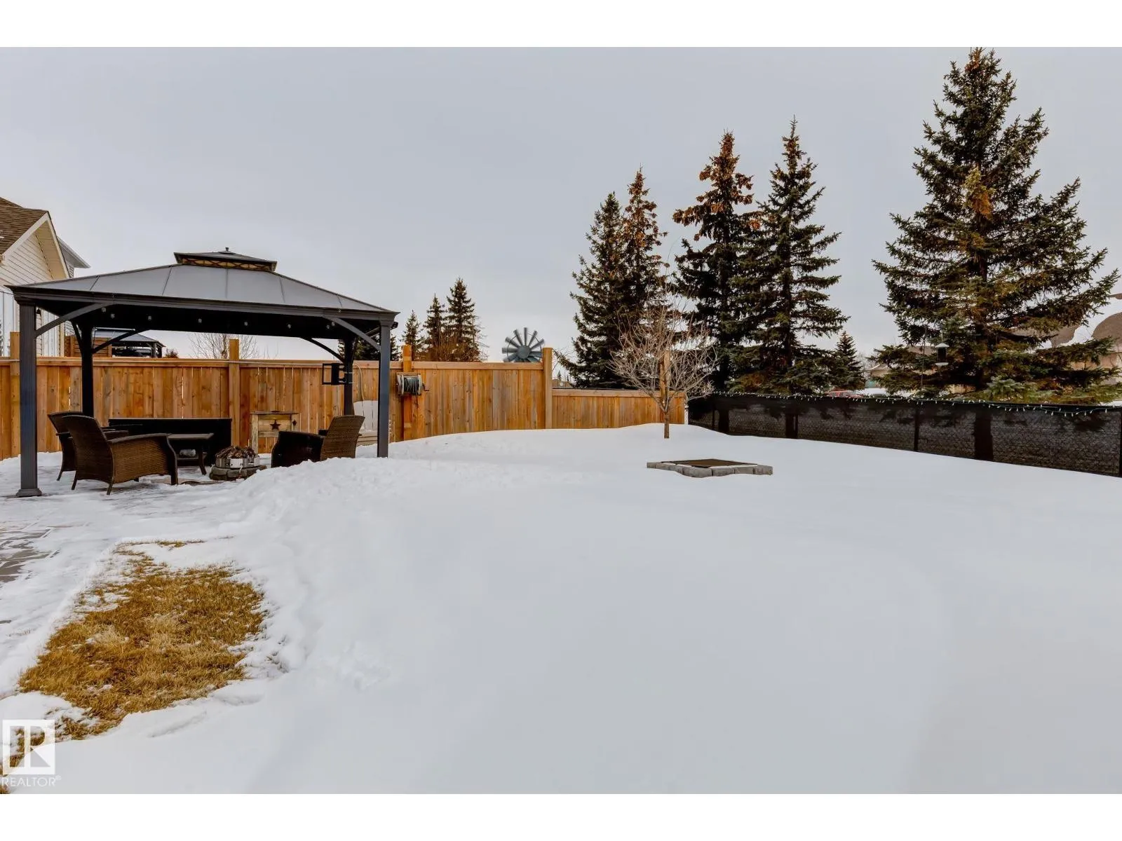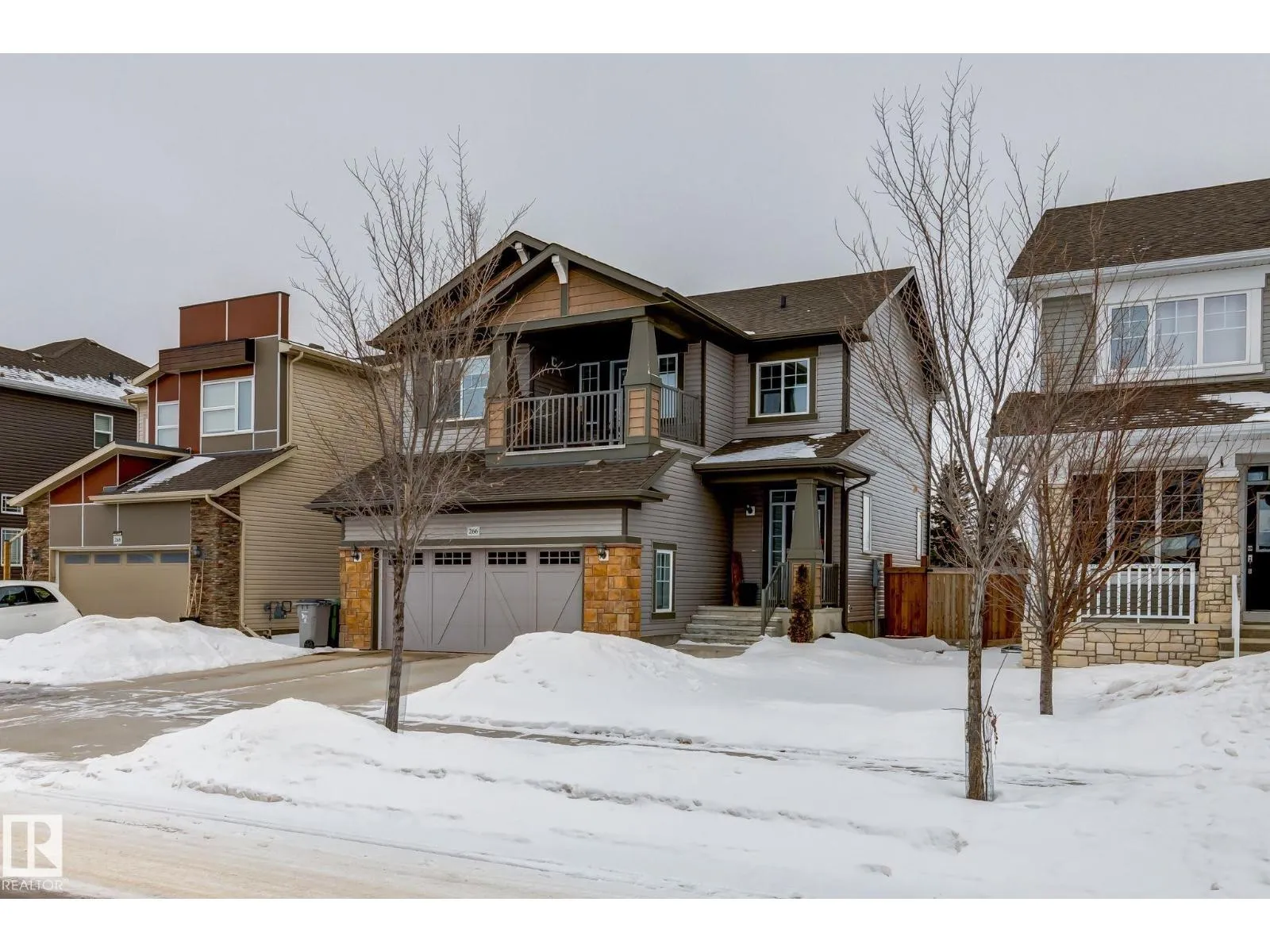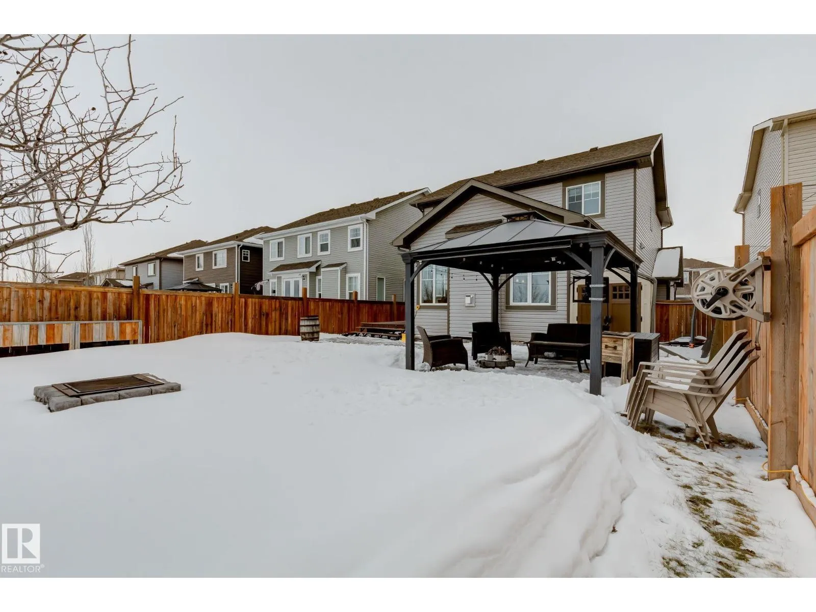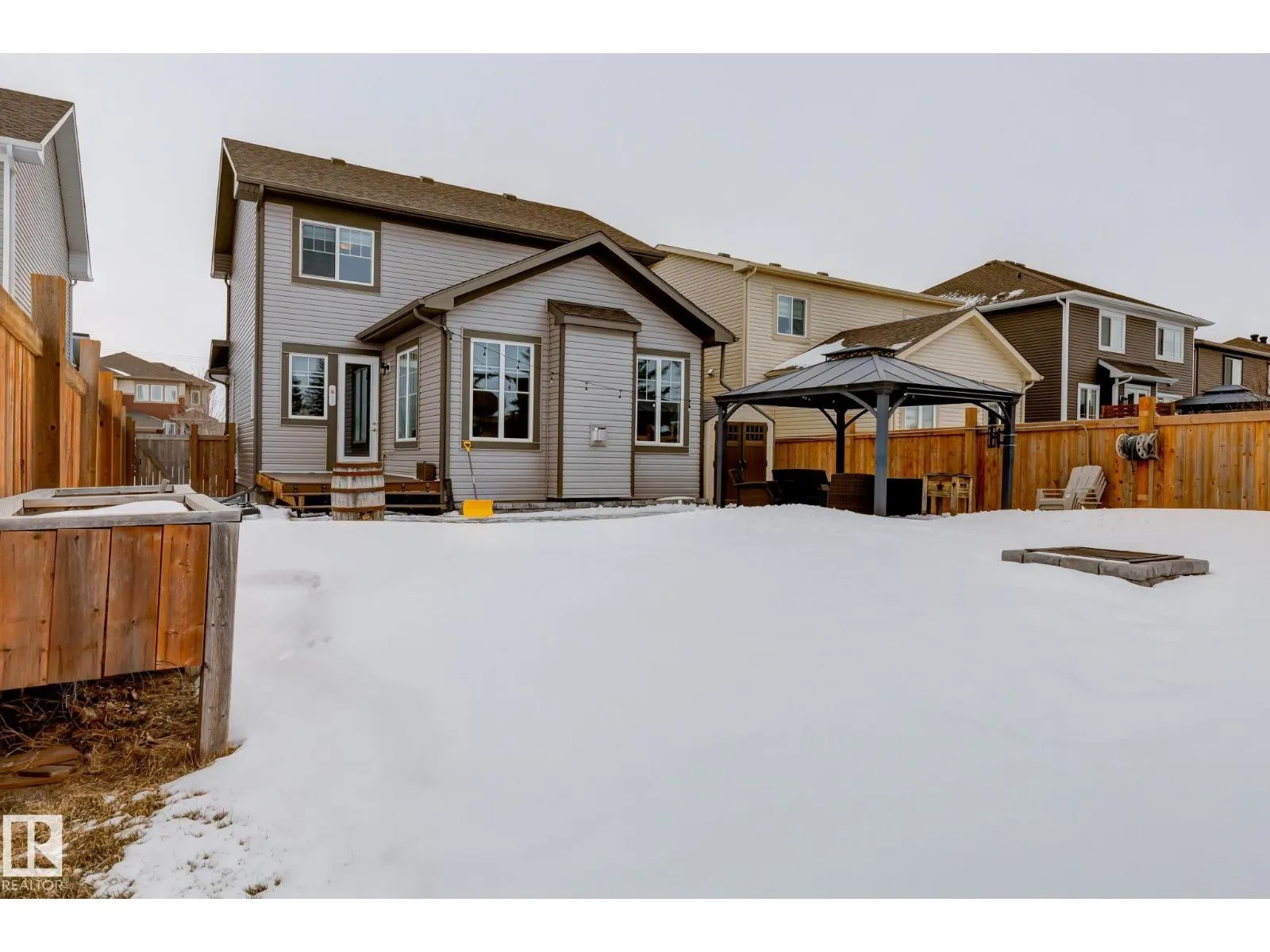 Welcome to this stylish two-storey home with fantastic curb appeal and an extra-wide, heated double garage. The bright, open-concept main floor features a modern kitchen with white uppers, dark lowers, subway tile backsplash, stainless appliances, and a large island with seating. The living room offers a stone-surround fireplace and big windows for natural light, while the dining area opens to the backyard. Upstairs, the primary bedroom includes a large ensuite with double sinks and a custom shower, plus access to an upper patio perfect for morning sun. High-quality window coverings and central A/C add comfort throughout. The unfinished basement offers future potential. The backyard is fully finished with a large tiled area, fire pit, 18Ã8 composite deck, 10Ã12 gazebo, 8Ã8 shed, and beautiful golf-course sunset views. Located in a desirable neighbourhood close to parks and amenities, this move-in-ready home is a must-see. (id:27476)