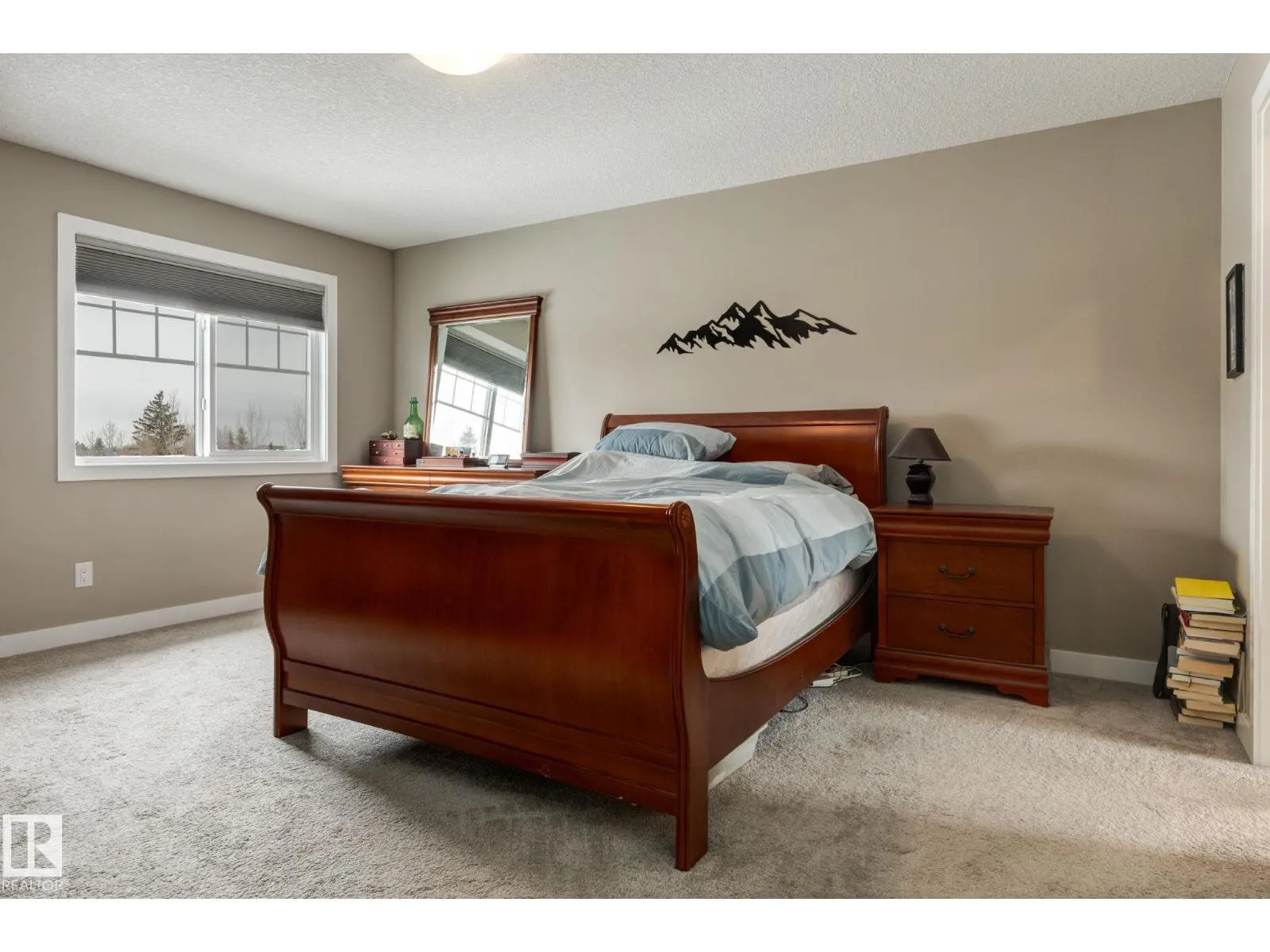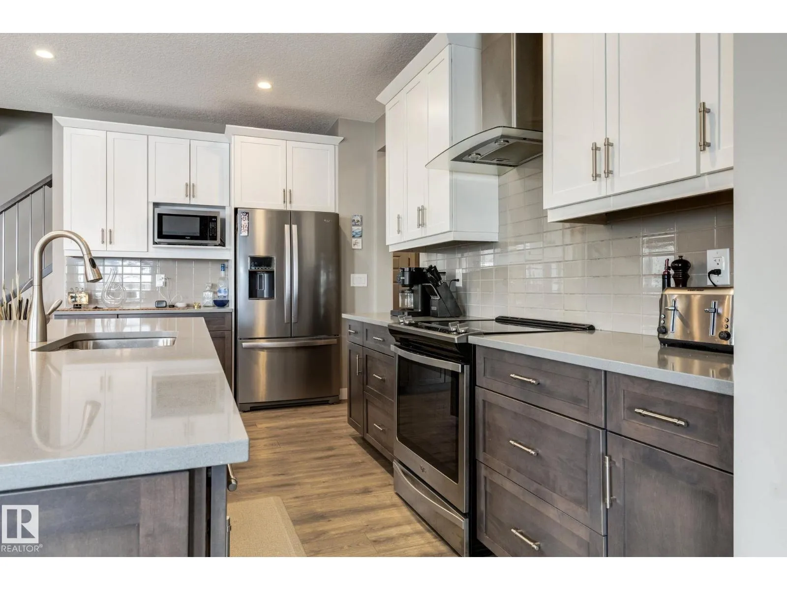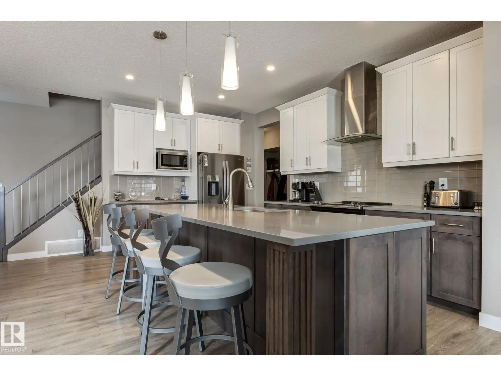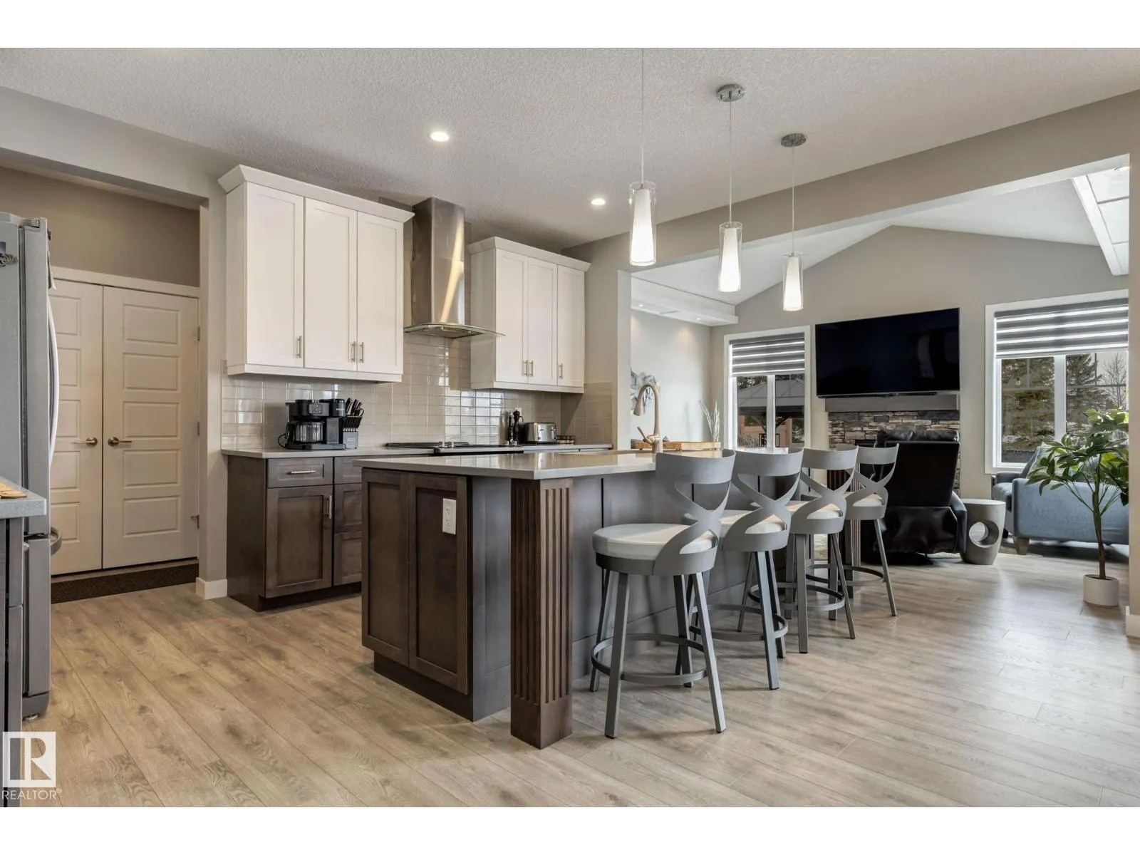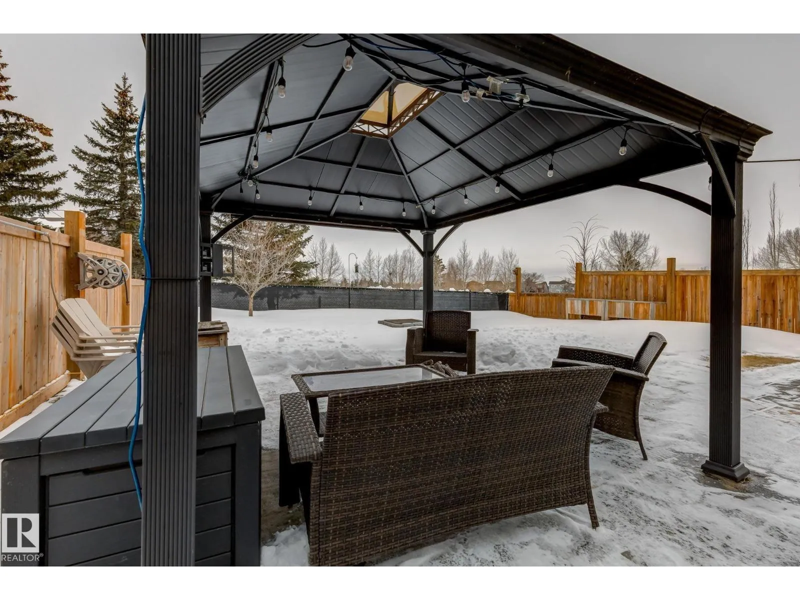 Welcome to this stylish two-storey home with fantastic curb appeal and an extra-wide, heated double garage. The bright, open-concept main floor features a modern kitchen with white uppers, dark lowers, subway tile backsplash, stainless appliances, and a large island with seating. The living room offers a stone-surround fireplace and big windows for natural light, while the dining area opens to the backyard. Upstairs, the primary bedroom includes a large ensuite with double sinks and a custom shower, plus access to an upper patio perfect for morning sun. High-quality window coverings and central A/C add comfort throughout. The unfinished basement offers future potential. The backyard is fully finished with a large tiled area, fire pit, 18Ã8 composite deck, 10Ã12 gazebo, 8Ã8 shed, and beautiful golf-course sunset views. Located in a desirable neighbourhood close to parks and amenities, this move-in-ready home is a must-see. (id:27476)