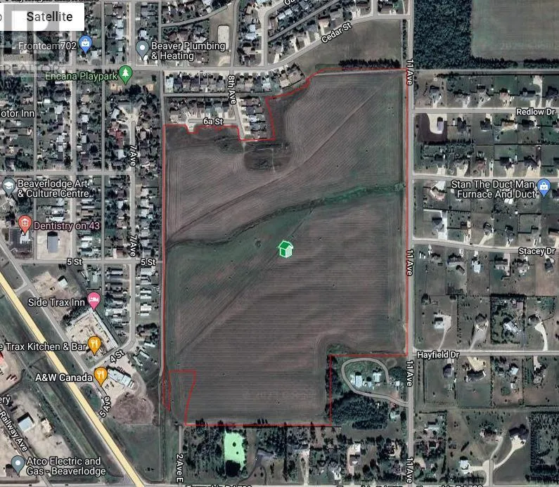 Are you seeking a prime location to develop residential properties? Look no further than 67.5 acres of development land in the thriving community of Beaverlodge. With a coveted South West view, urban zoning, and an outline plan for approximately 220 residential lots (with the next phase for 32 lots), this property is a developer's dream. Plans have already been approved but expired, and the plan application and engineering have been fully completed. The property is easily serviceable and boasts a nice slope from East to West, with convenient access off 8th and 11th Avenue. Beaverlodge is a self-sufficient community offering a variety of retail businesses, industrial hubs, recreation facilities, healthcare, good schools, seniorsâ center, and more. Just a 20-minute drive from Grande Prairie, this location offers the perfect combination of convenience and high-quality rural living. The seller of this property is a licensed realtor in Alberta. Don't miss out on this opportunity to create thriving, beautiful new residences in the heart of Beaverlodge. (id:27476)