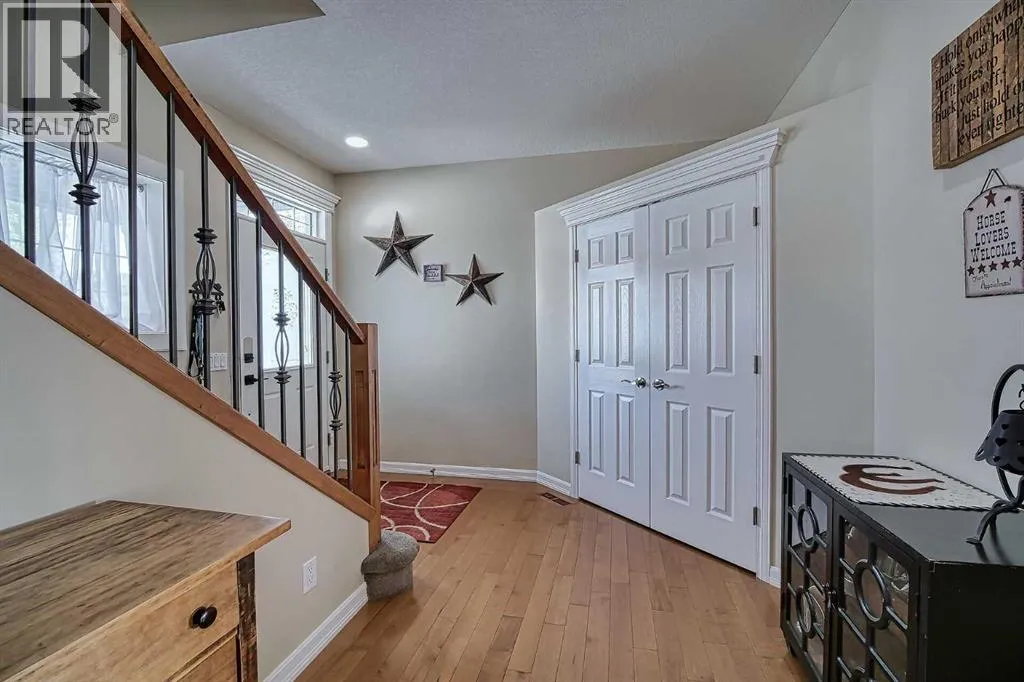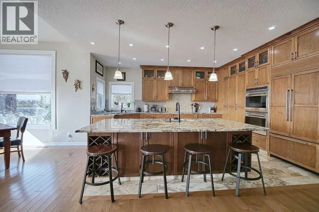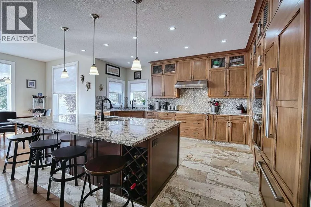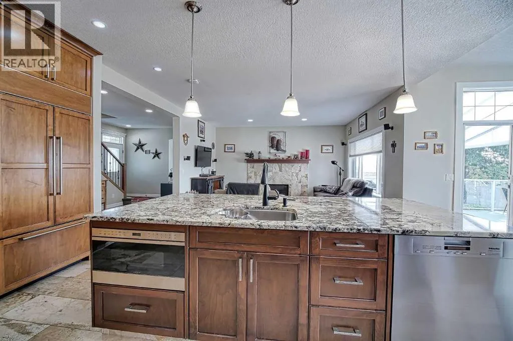 Top-of-the-line home packed with EXTRAS! Step into a grand foyer that opens to soaring ceilings and an impressive open-concept main floor. At the heart of the home is a bright, modern kitchen with PREMIUM appliances: Double Wolf Wall Ovens, an Induction Cooktop, UNDER COUNTER built-in microwave, Miele dishwasher, and a Sub-Zero Refrigerator. Thick Granite counters span the space, including a large breakfast bar with sink and garburator, plus an additional sink and garburator by the windows. Custom cabinetry offers abundant storage throughout. The spacious dining area is wrapped in windows, showcasing sweeping prairie viewsâperfect for entertaining. A cozy gas fireplace anchors the living room, while remote-control blinds add convenience. From the dining room, step out to a covered deck with glass railing for seamless indoor-outdoor living. Rounding out the main floor are a stylish powder room, a well-planned laundry, and a practical mudroom.Up the first landing, youâll find a bright bonus room with soaring ceilings and oversized windowsâideal for movie nights or a kidsâ play zone. On the next level are two generously sized bedrooms with large closets. The primary suite is a true retreat with prairie views, a spacious walk-in closet and a four-piece ensuite featuring custom lightingâeven in the shower, low flow toilet and heated floor. The fully finished basement offers in-floor heating, a spacious rec room with a cozy gas fireplace and a flexible area currently used as a fourth bedroom.This level also includes a full four-piece bathroom. The oversized double garage is fully finished with epoxy floors, drywall, insulation, and in-floor heat. Outside, the massive 10,000 sq. ft. yard is fully fenced with low-maintenance vinyl, RV parking, and sweeping farm views; there may even be enough room for an additional garage. Additional features include hardwood and premium carpet throughout, central air conditioning, underground sprinklers, RO systems, a water softener, LED l ighting (everywhere), built-in vacuum system and even a European plug for specialty appliances. This Layne Home is solidly built, well maintained and truly move-in ready. (id:27476)