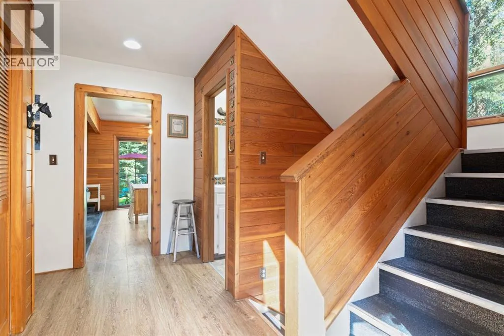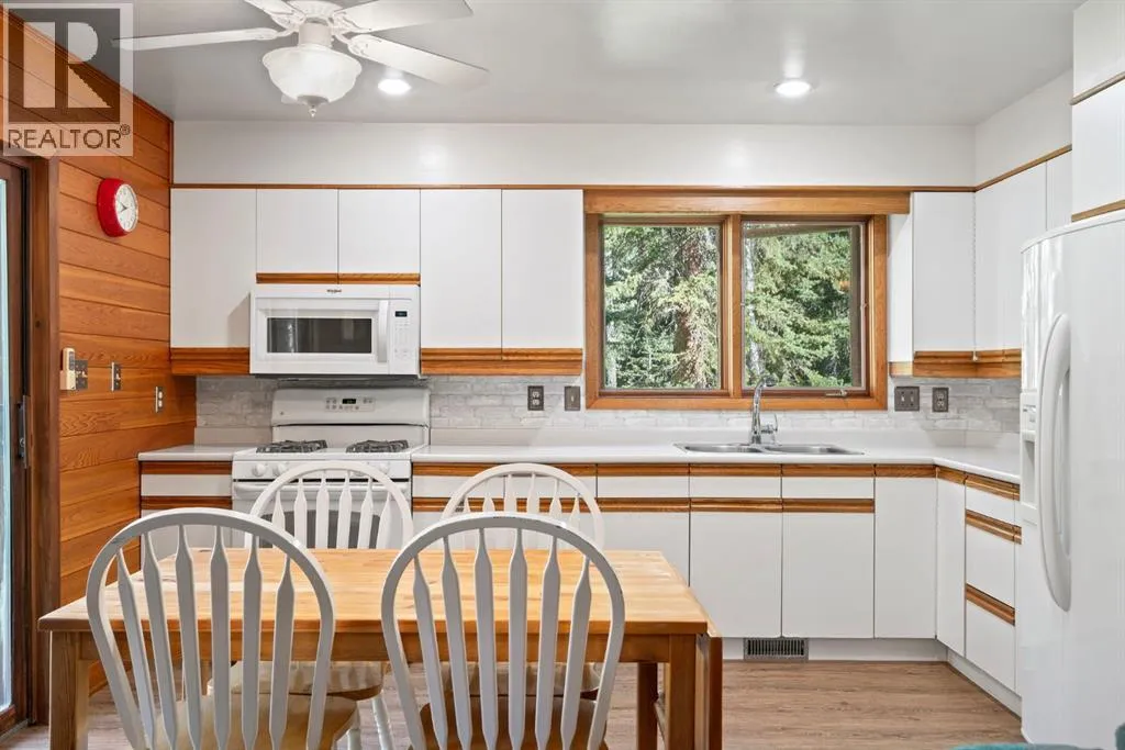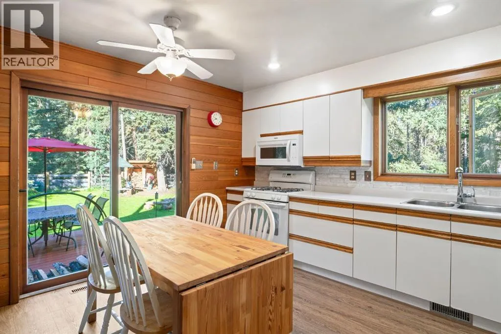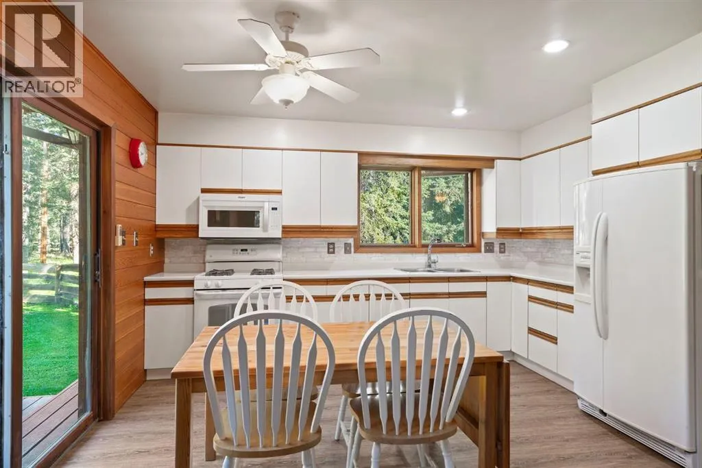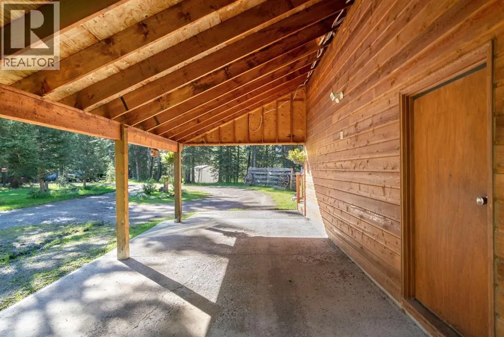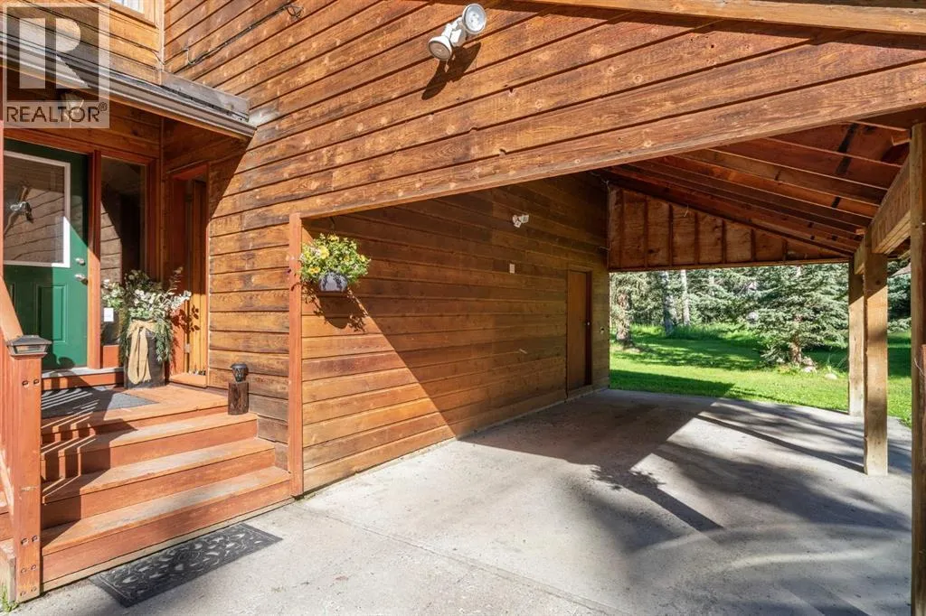 Escape to your own private 2.51 acre woodland paradise with this charming 4-bedroom, 2-bathroom home set on a beautifully treed lot in the serene Benchlands community. Nestled among towering evergreens, this property offers peace, privacy, and the perfect blend of rustic charm and modern comfort. Inside, warm wood accents and vaulted ceilings with skylights create a bright, inviting atmosphere. The sun filled living room features large windows overlooking the forest and a cozy airtight wood burning stove set against a stone feature wall. The spacious kitchen offers ample cabinetry, a gas stove, and direct access to the outdoors, ideal for both everyday living and entertaining. Bedrooms are generously sized, and bathrooms include unique touches such as vibrant tile work and wood finishes. The property includes an oversized detached garage with space to park 2 cars plus workshop space for quads or motorbikes, or woodworking, plenty of parking with a carport also attached to the house. Lush green space for outdoor activities, and the ability to have 2 horses onsite with corrals and horse shelter already in place. With its private driveway, fire pit area, and direct access to nature, this home is perfect for year-round living or a weekend getaway with easy access to the Waiparous area crown lands and the Ghost River just a few minutes walk from your front door. Call to book a showing today. New Starlink internet system just installed and will be left with the property. New roof 2024, new flooring 2024, new paint. (id:27476)