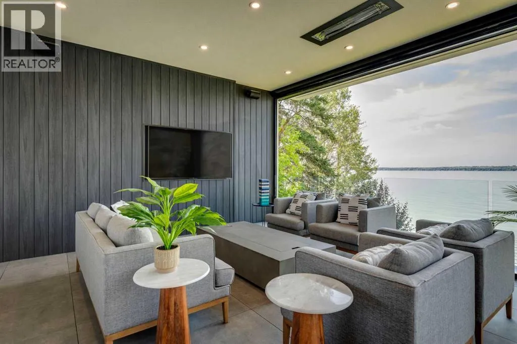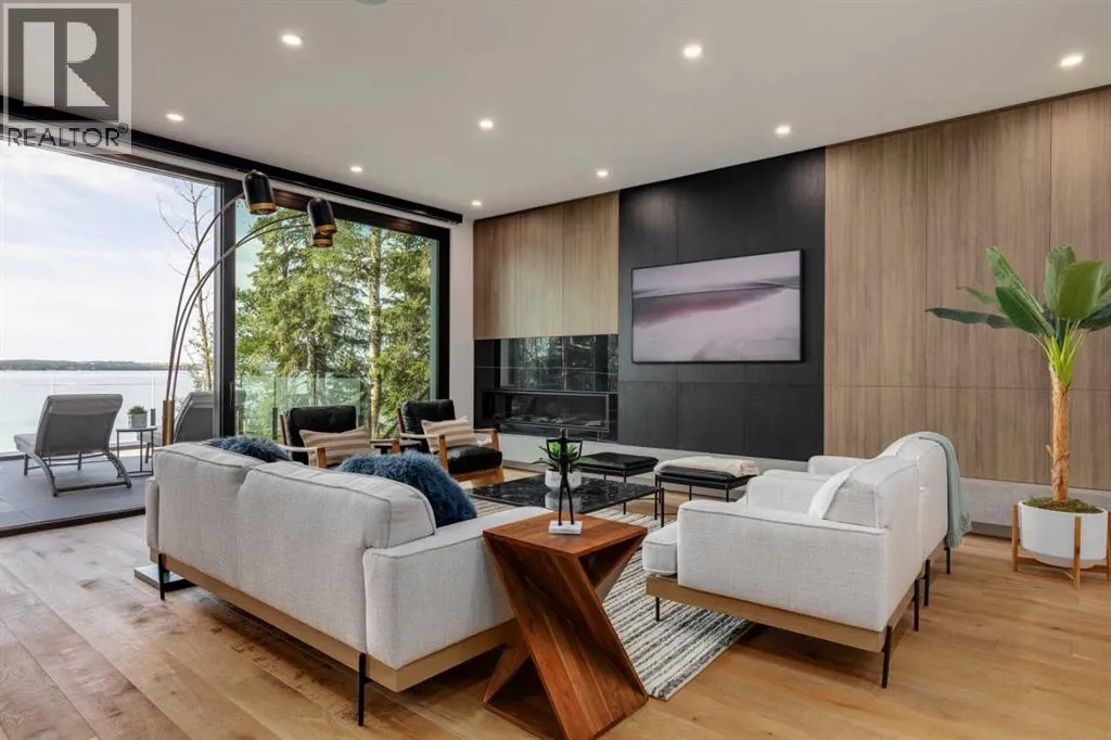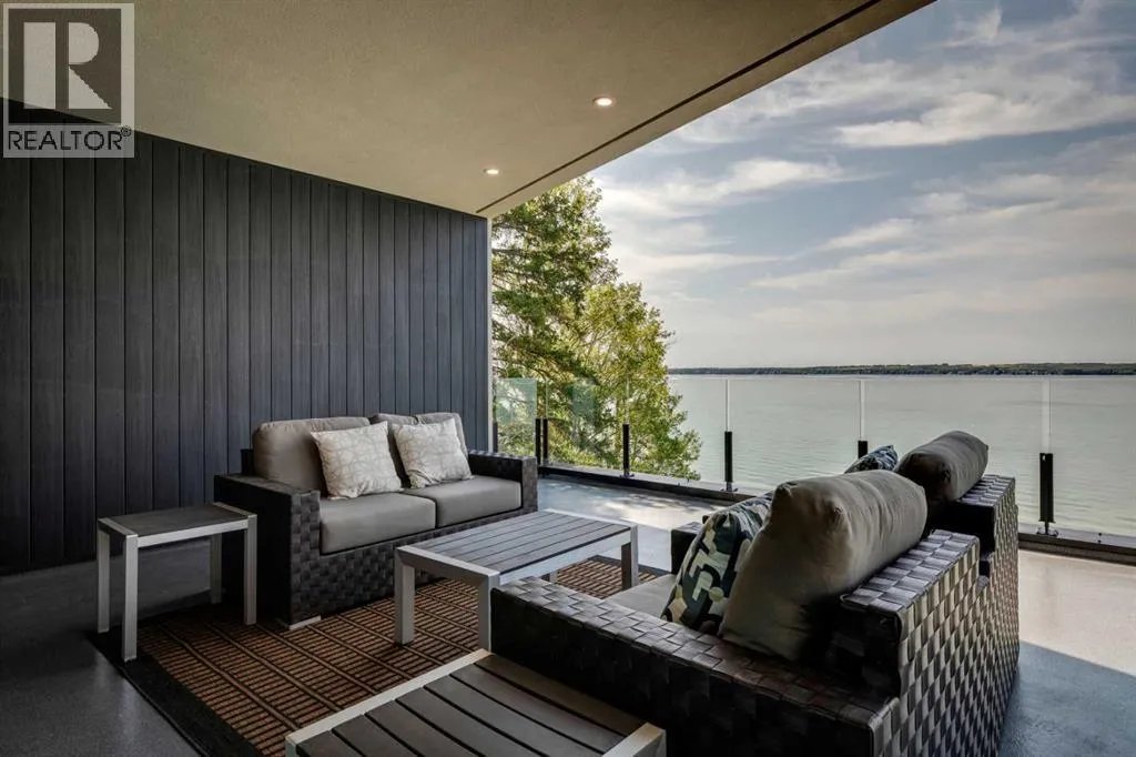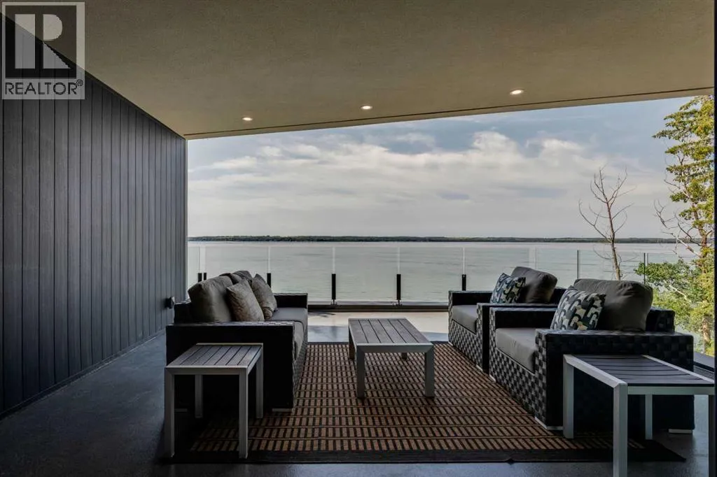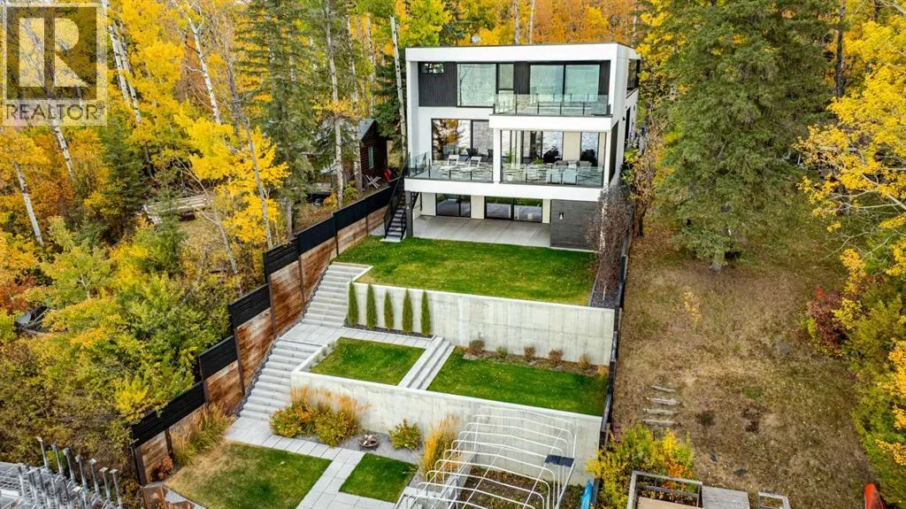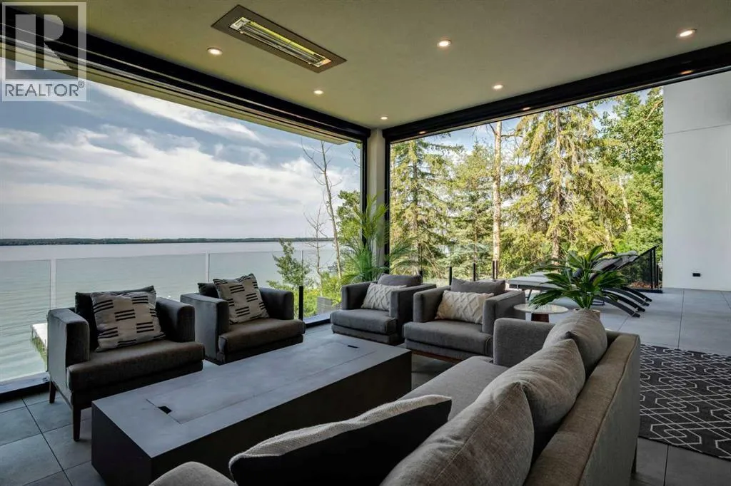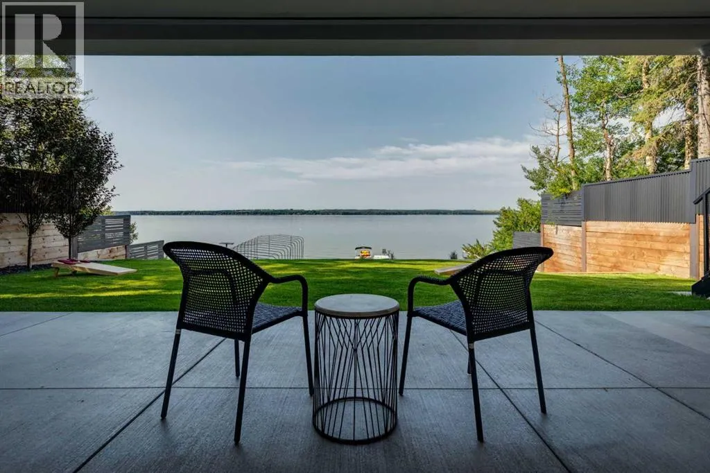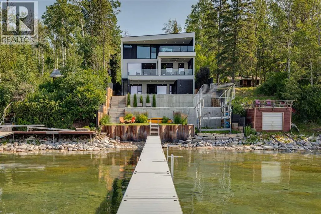 Welcome to The Cliffs â a breathtaking custom lakefront residence built by Square Structures, recipient of the Central Alberta Building Associationâs Award of Excellence. This architectural masterpiece offers a seamless blend of luxury, function, and connection to nature, with panoramic south-facing lake views from every level. Designed with wall-to-wall, floor-to-ceiling triple-pane windows, the home is flooded with natural light and offers uninterrupted views of the water throughout. Step outside to enjoy 1,750 sq ft of outdoor decking, including a screened-in living space with gas fireplace, ceiling heaters and TV â the perfect extension of your indoor living. The striking exterior is finished with a premium combination of EIFS stucco, King Klinker brick, Cham Clad, and Lux Architectural panels, setting the tone for the elevated design found within. Enter through a 4âx8â custom front door into an open-concept main floor featuring 8â wide-plank engineered white oak flooring, a spacious living area, and a fully custom kitchen complete with porcelain countertops, high-end appliances, a built-in ice maker, built-in coffee machine, induction cooktop, and a walk-through pantry housing a full-size fridge and freezer.The main floor also includes a 200 sq ft home office and seamless access to the outdoor living areas. The primary suite is a true retreat, featuring private lake-facing balcony access, a gas fireplace, and a spa-inspired ensuite with dual vanities, walk-through shower, and custom-tiled walls. Additional features include: personal GYM with wraparound balcony, WALK-OUT basement with lake views, family room, THEATRE room (100â screen & 5.1 surround sound) In-floor heating, ELECTRIC power blinds on every level, PROFESSIONALLY landscaped yard with tiered access to the water, underground irrigation, privacy fencing, and landscape lightingThis is a rare opportunity to own a meticulously crafted luxury home with direct lake access and premium finishes throughou t. The Cliffs is more than a home â itâs a lifestyle. (id:27476)