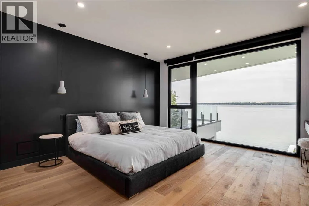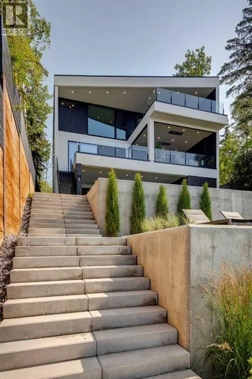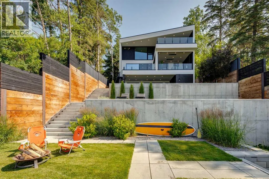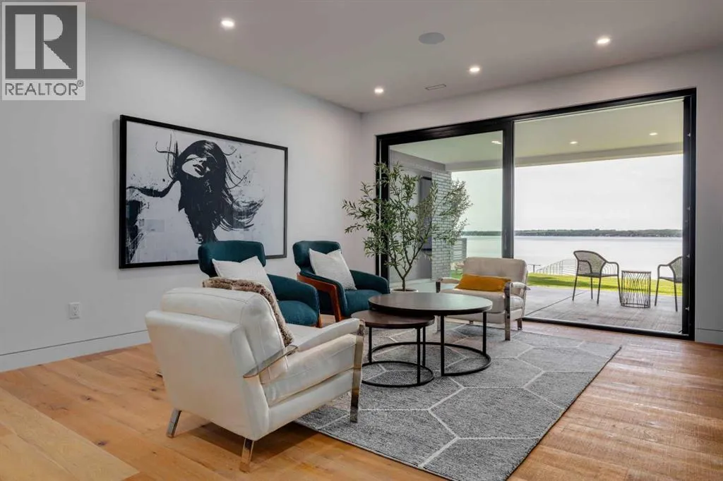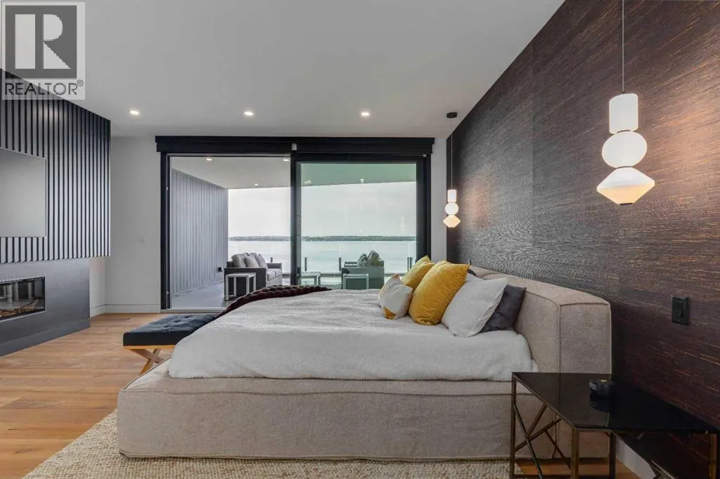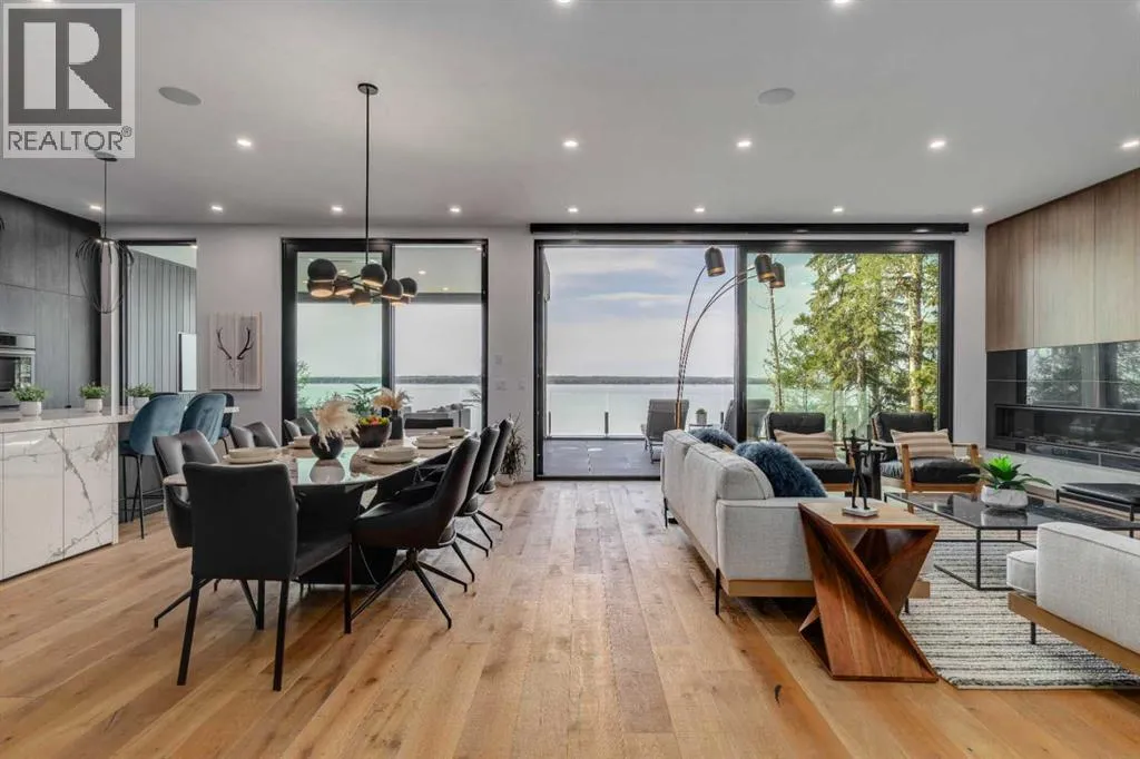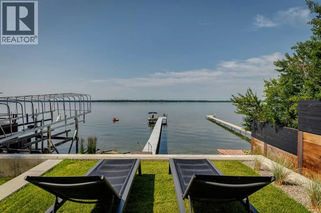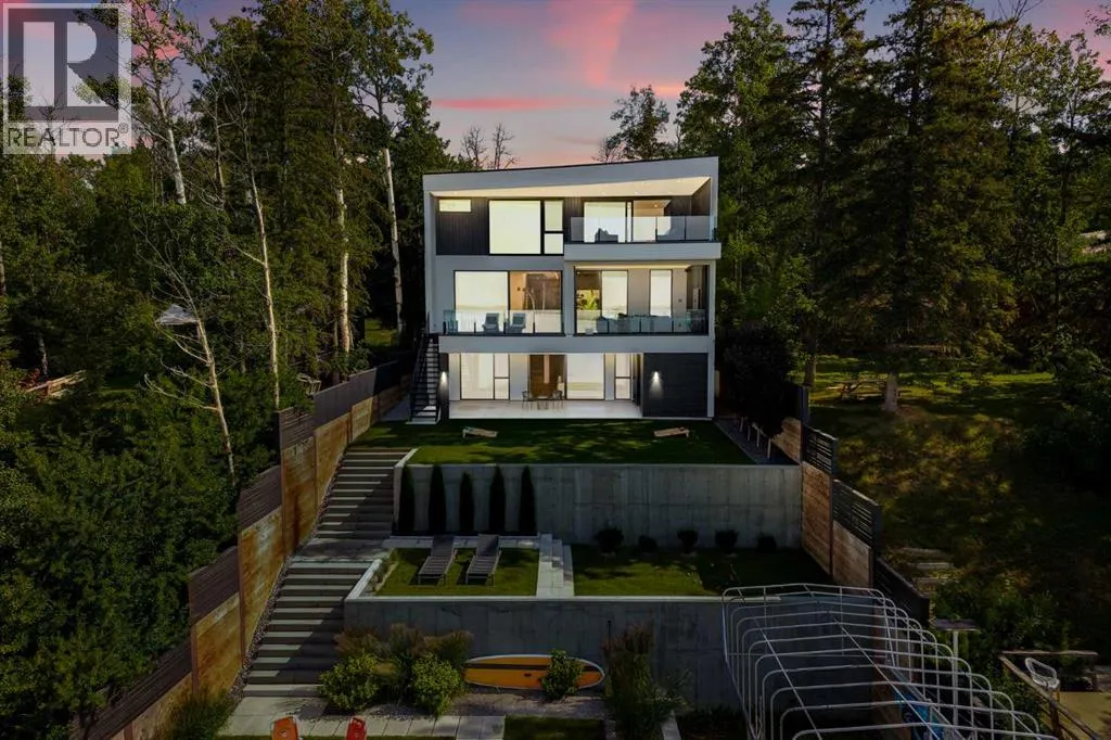 Welcome to The Cliffs â a breathtaking custom lakefront residence built by Square Structures, recipient of the Central Alberta Building Associationâs Award of Excellence. This architectural masterpiece offers a seamless blend of luxury, function, and connection to nature, with panoramic south-facing lake views from every level. Designed with wall-to-wall, floor-to-ceiling triple-pane windows, the home is flooded with natural light and offers uninterrupted views of the water throughout. Step outside to enjoy 1,750 sq ft of outdoor decking, including a screened-in living space with gas fireplace, ceiling heaters and TV â the perfect extension of your indoor living. The striking exterior is finished with a premium combination of EIFS stucco, King Klinker brick, Cham Clad, and Lux Architectural panels, setting the tone for the elevated design found within. Enter through a 4âx8â custom front door into an open-concept main floor featuring 8â wide-plank engineered white oak flooring, a spacious living area, and a fully custom kitchen complete with porcelain countertops, high-end appliances, a built-in ice maker, built-in coffee machine, induction cooktop, and a walk-through pantry housing a full-size fridge and freezer.The main floor also includes a 200 sq ft home office and seamless access to the outdoor living areas. The primary suite is a true retreat, featuring private lake-facing balcony access, a gas fireplace, and a spa-inspired ensuite with dual vanities, walk-through shower, and custom-tiled walls. Additional features include: personal GYM with wraparound balcony, WALK-OUT basement with lake views, family room, THEATRE room (100â screen & 5.1 surround sound) In-floor heating, ELECTRIC power blinds on every level, PROFESSIONALLY landscaped yard with tiered access to the water, underground irrigation, privacy fencing, and landscape lightingThis is a rare opportunity to own a meticulously crafted luxury home with direct lake access and premium finishes throughou t. The Cliffs is more than a home â itâs a lifestyle. (id:27476)