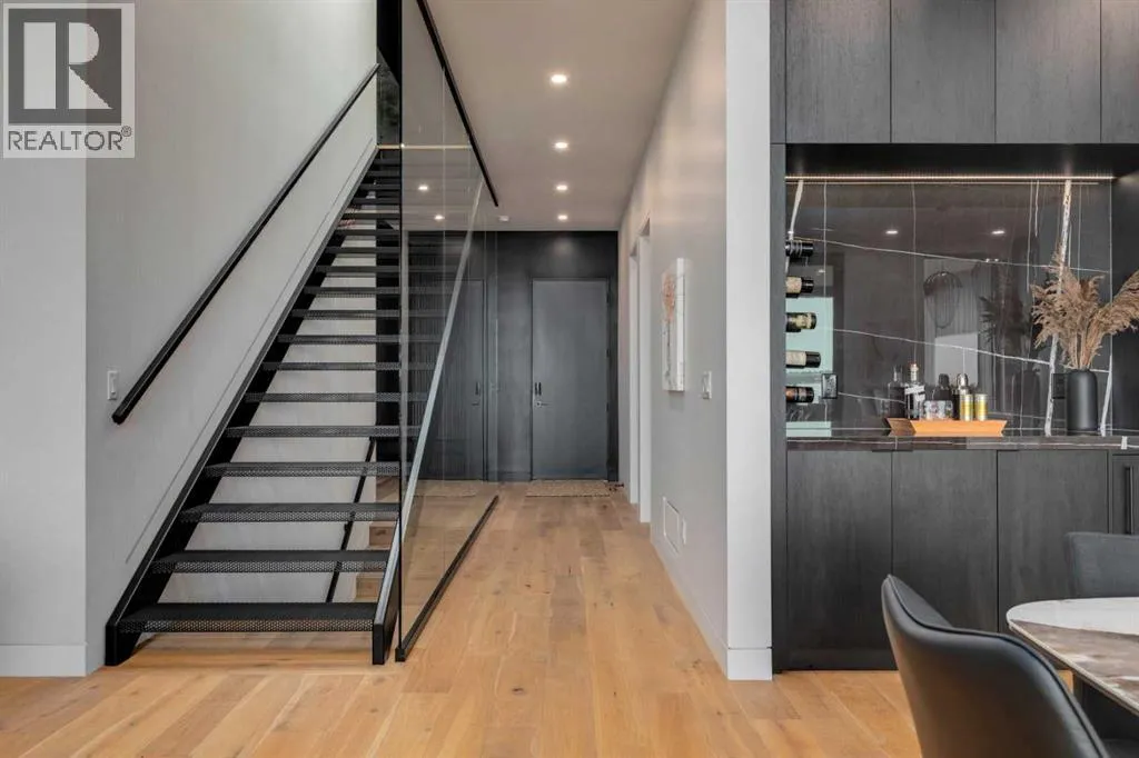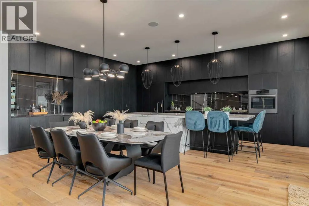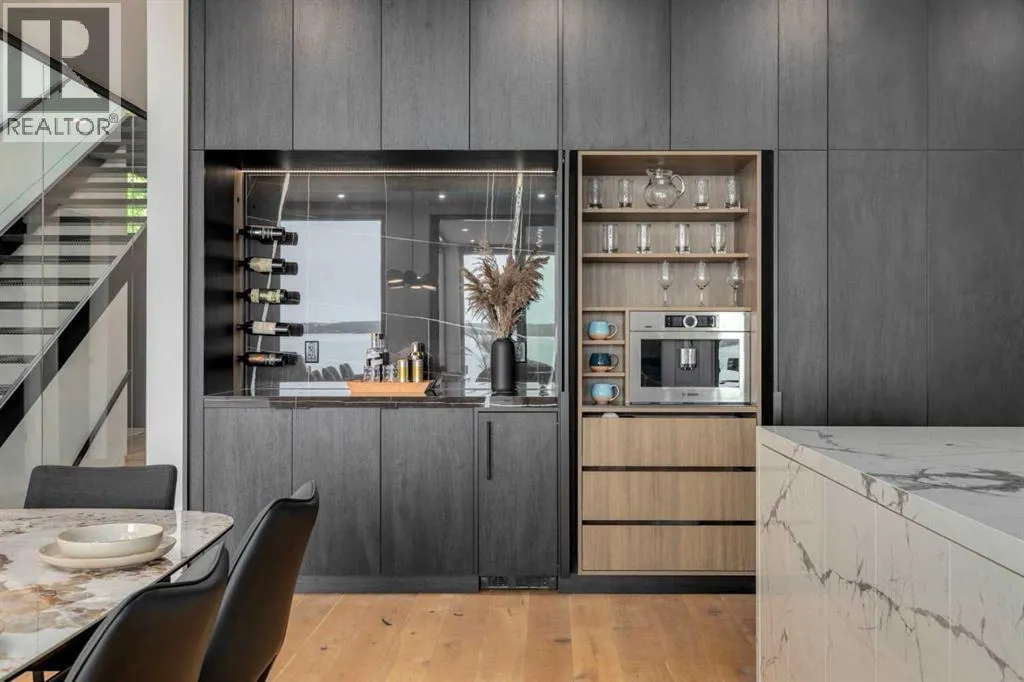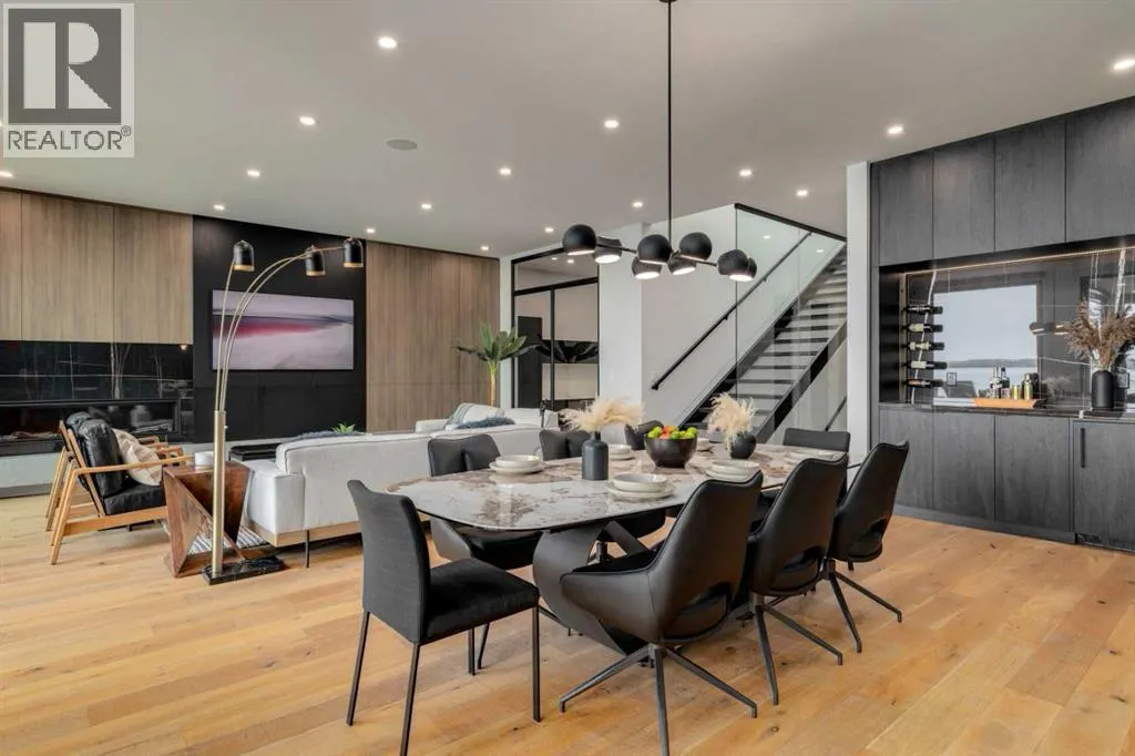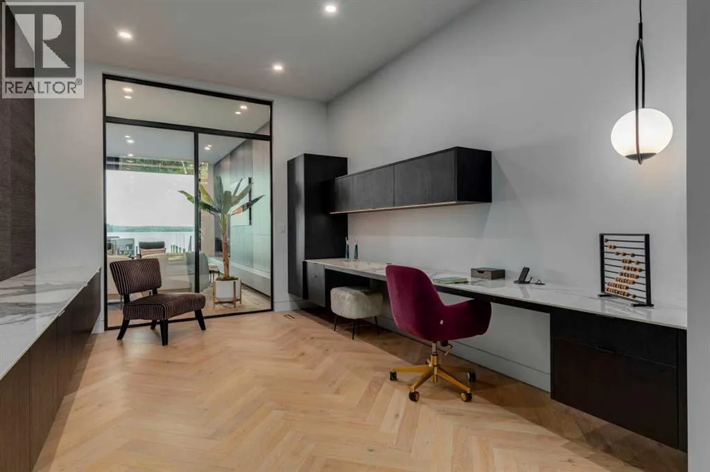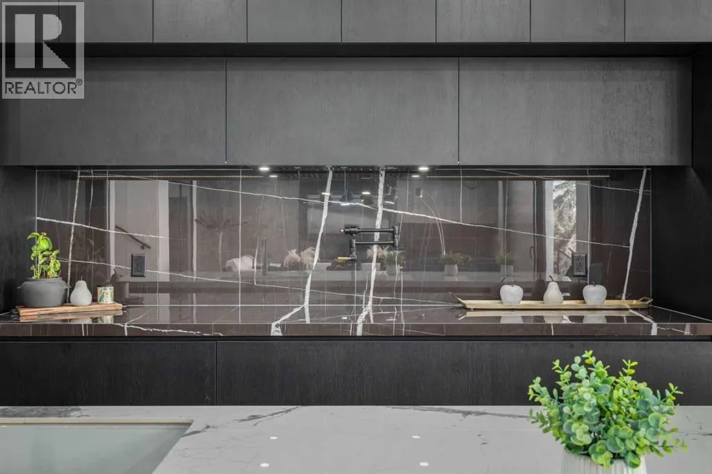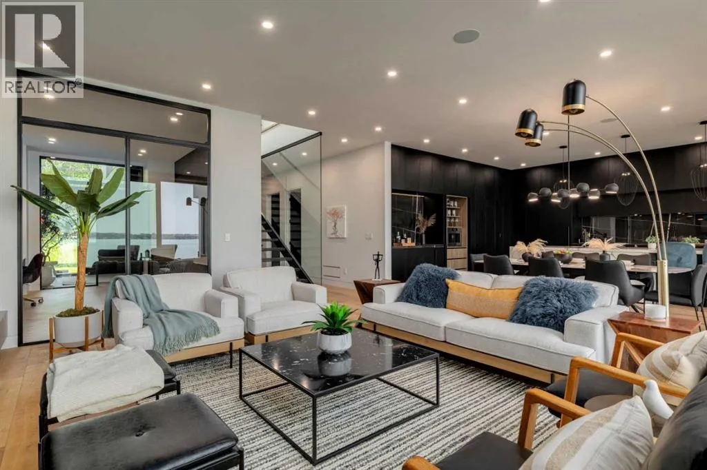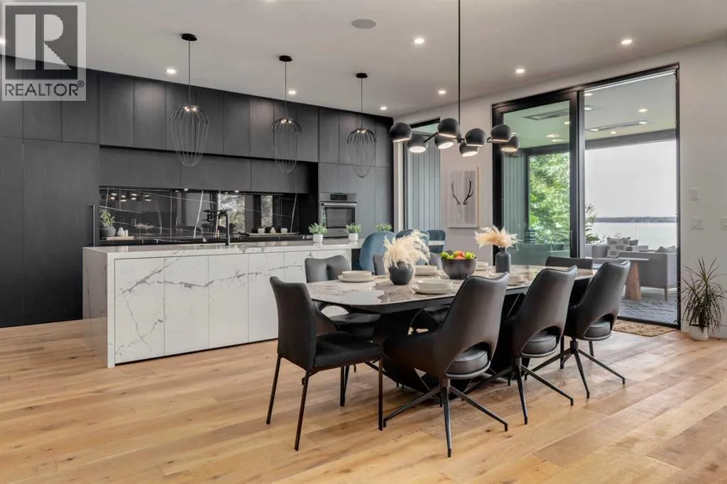 Welcome to The Cliffs â a breathtaking custom lakefront residence built by Square Structures, recipient of the Central Alberta Building Associationâs Award of Excellence. This architectural masterpiece offers a seamless blend of luxury, function, and connection to nature, with panoramic south-facing lake views from every level. Designed with wall-to-wall, floor-to-ceiling triple-pane windows, the home is flooded with natural light and offers uninterrupted views of the water throughout. Step outside to enjoy 1,750 sq ft of outdoor decking, including a screened-in living space with gas fireplace, ceiling heaters and TV â the perfect extension of your indoor living. The striking exterior is finished with a premium combination of EIFS stucco, King Klinker brick, Cham Clad, and Lux Architectural panels, setting the tone for the elevated design found within. Enter through a 4âx8â custom front door into an open-concept main floor featuring 8â wide-plank engineered white oak flooring, a spacious living area, and a fully custom kitchen complete with porcelain countertops, high-end appliances, a built-in ice maker, built-in coffee machine, induction cooktop, and a walk-through pantry housing a full-size fridge and freezer.The main floor also includes a 200 sq ft home office and seamless access to the outdoor living areas. The primary suite is a true retreat, featuring private lake-facing balcony access, a gas fireplace, and a spa-inspired ensuite with dual vanities, walk-through shower, and custom-tiled walls. Additional features include: personal GYM with wraparound balcony, WALK-OUT basement with lake views, family room, THEATRE room (100â screen & 5.1 surround sound) In-floor heating, ELECTRIC power blinds on every level, PROFESSIONALLY landscaped yard with tiered access to the water, underground irrigation, privacy fencing, and landscape lightingThis is a rare opportunity to own a meticulously crafted luxury home with direct lake access and premium finishes throughou t. The Cliffs is more than a home â itâs a lifestyle. (id:27476)