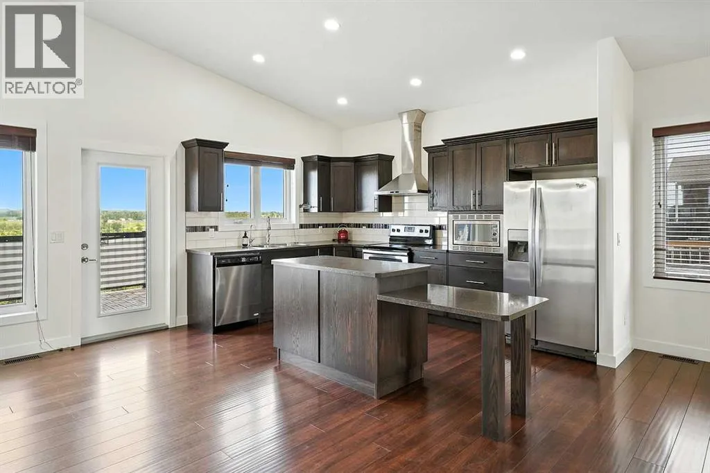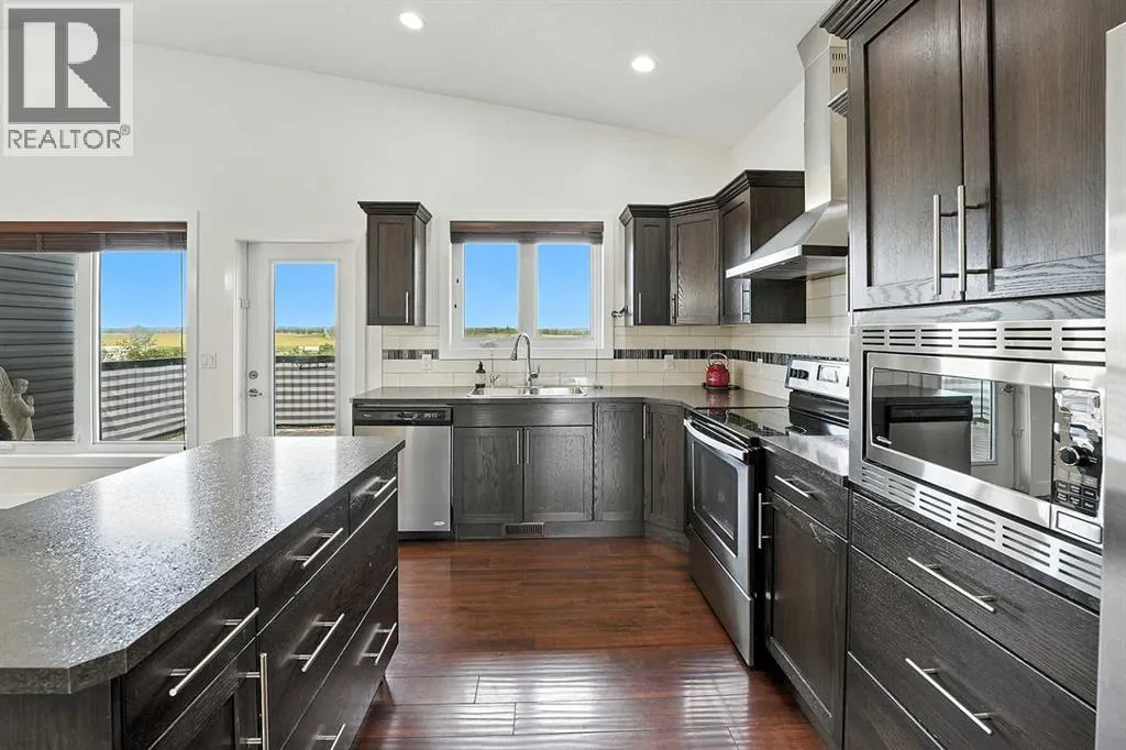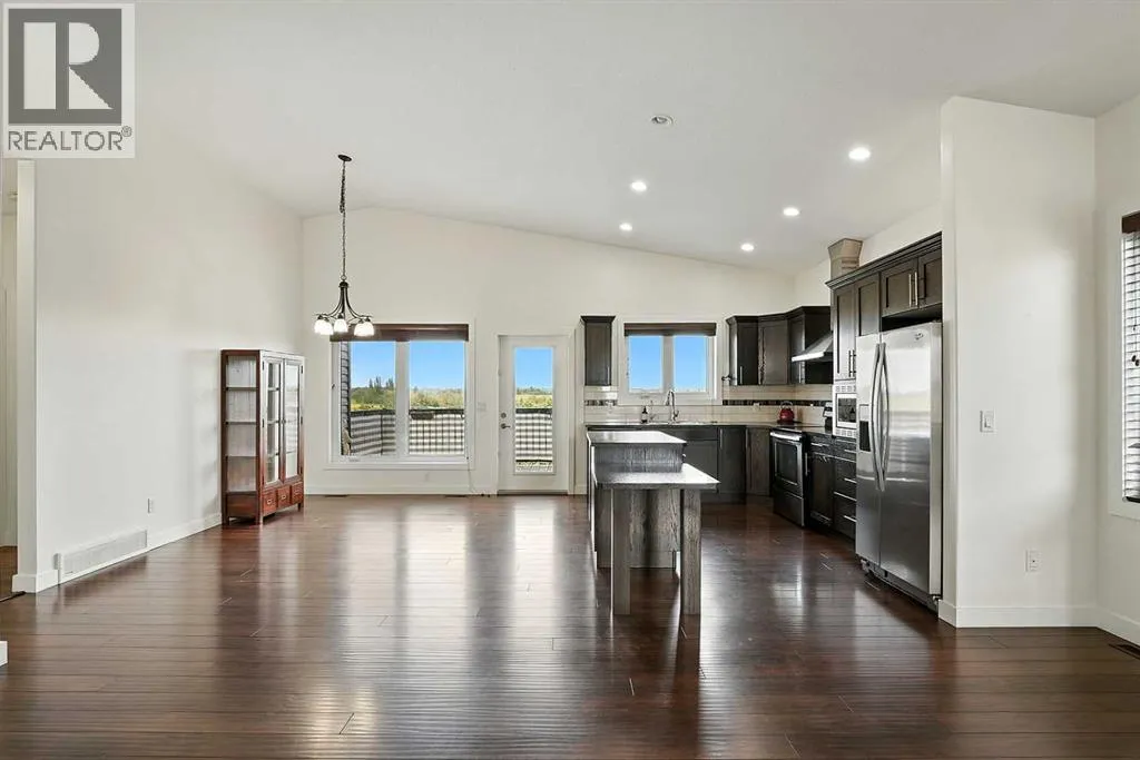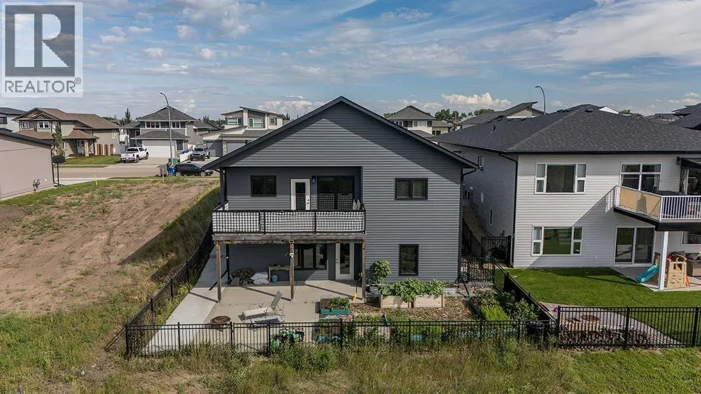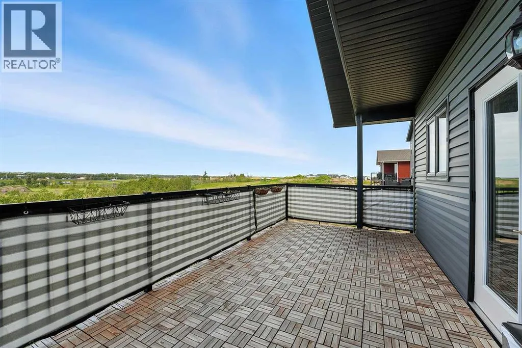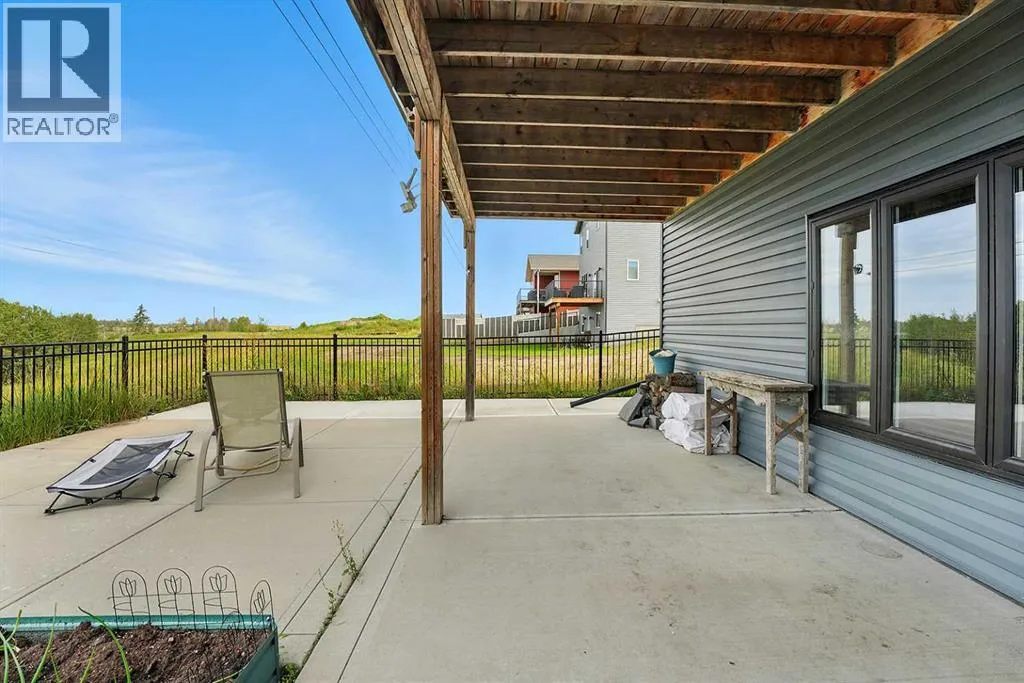 Step into this stunning 3-bedroom, 2-bathroom bungalow in the heart of Blackfaldsâ desirable Vista Trail neighbourhood. Built in 2015, this home offers a bright open concept living space, wheelchair accessibility, and a fully finished walkout basement perfect for entertaining or family living. Enjoy stunning sunsets and peaceful views in this thoughtfully designed home, complete with an elevator for seamless access between both levels. From the moment you arrive, the bright, open concept main floor welcomes you with vaulted ceilings, dark laminate flooring, and a perfect blend of spaciousness and cozy warmth.A large west facing window fills the living area with natural light and frames beautiful marshland views, where an abundance of birds and wildlife create a tranquil backdrop. The modern kitchen features stainless steel appliances, a generous island, abundant cabinetry for seamless storage and plenty of counter space for effortless meal prep. From the dining room, step through patio doors to an expansive deck overlooking the backyard, an ideal spot for morning coffee, evening sunsets, or entertaining friends.The main level also offers two large bedrooms and a full bathroom. Head downstairs via the expansive stairway or custom installed elevator to discover a beautifully designed lower level with in-floor heating, a spacious entertainment area, a secondary kitchen with mini fridge and microwave, a large bedroom, and an oversized custom built bathroom with a walk-in shower. The walkout leads to a fenced backyard featuring raised garden beds, rhubarb, raspberry, and strawberry bushes, a gardenerâs delight. Stay warm and protected year-round with the convenience of a spacious double car garage.This home has been thoughtfully crafted for comfort and convenience. Wide doorways, step free entry, and barrier free transitions ensure smooth flow throughout, while accessible counters, lever style handles, and well placed switches add everyday ease. Whether needed today or appreciated in the future, these features provide rare peace of mind. Quiet, family friendly neighbourhood with easy access to all amenities including schools, shopping, parks, and a community bus. Perfectly located between Calgary and Edmonton also just minutes from Red Deer. (id:27476)