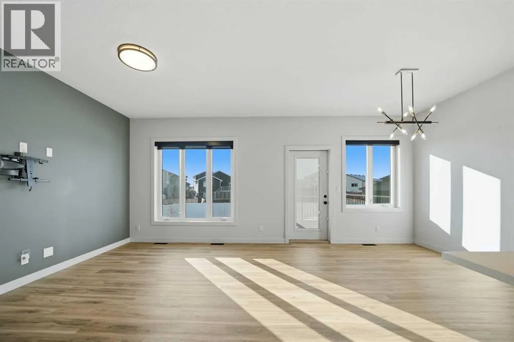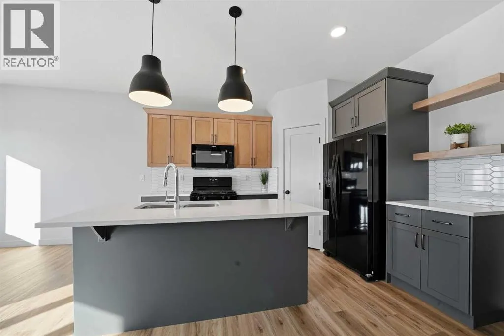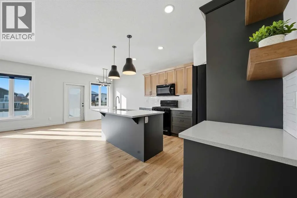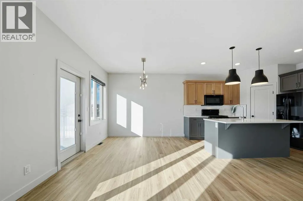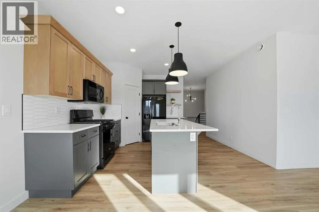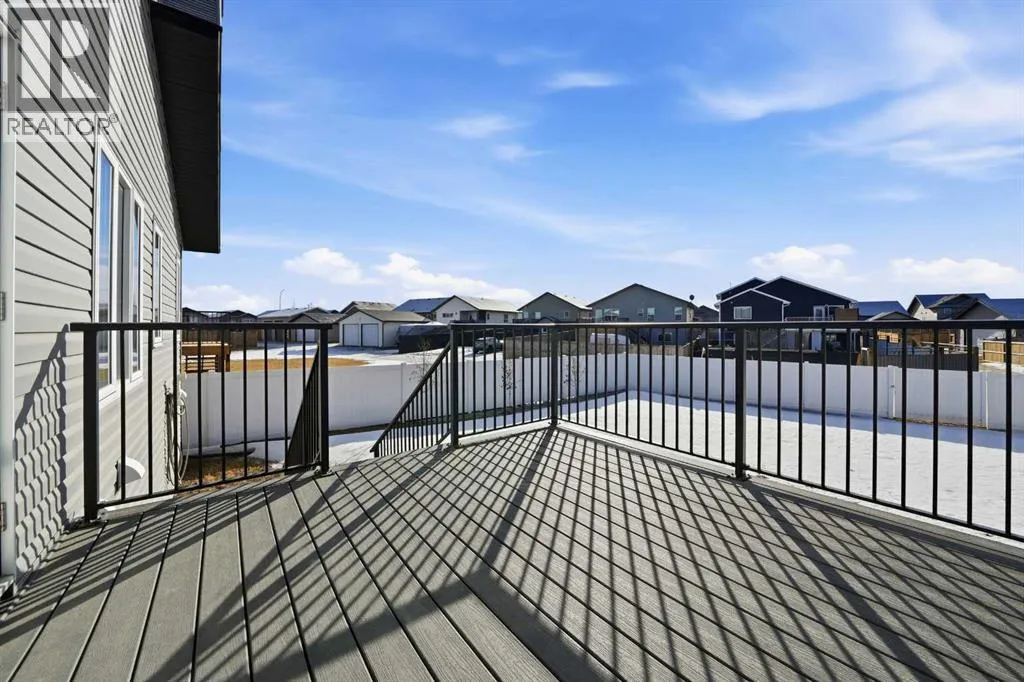 Welcome to 9 Aztec Street in the desirable community of Aurora in Blackfalds. A beautifully upgraded bi-level built by True-Line Developments offering quality craftsmanship and exceptional design throughout. From the moment you arrive, the stunning curb appeal stands out with its attractive blend of stonework, wood accents, and modern vertical siding. A welcoming front entry opens to a wide staircase accented by sleek black metal railing, setting the tone for the stylish finishes found throughout the home. The main floor showcases an impressive kitchen designed to be both functional and beautiful, featuring upgraded two-tone cabinetry, full quartz countertops, deep corner pantry, floating shelves, modern light fixtures, and matching black appliances including an upgraded gas stove. The open concept layout flows seamlessly into the spacious dining and living areas, highlighted by large windows fitted with custom blinds that flood the space with natural light. Garden doors lead to the rear deck with gas line for BBQ, overlooking the massive fully fenced yard. perfect for relaxing or entertaining. Both the covered front veranda and rear deck feature durable Moisture Shield composite decking for long lasting, low maintenance enjoyment. The main floor offers three bedrooms, including a generous primary retreat complete with walk in closet and private ensuite featuring dual vanities and a standup shower. Convenient main floor laundry adds everyday ease. The professionally developed basement is thoughtfully designed for family living and entertaining, offering a large media area, an expansive family room behind stylish barn doors, an additional bedroom, and a beautifully finished three piece bathroom with full tile surround and walk in shower. A substantial storage area provides excellent space for seasonal items and organization. Located within walking distance to neighborhood shopping and close to schools, parks, and amenities, this home offers the perfect blend of styl e, function, and location in one of Blackfaldsâ newer communities. A move in ready home that shows pride of ownership with thoughtful upgrades throughout. (id:27476)