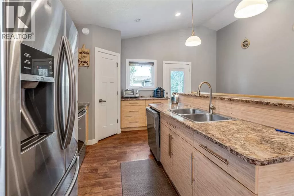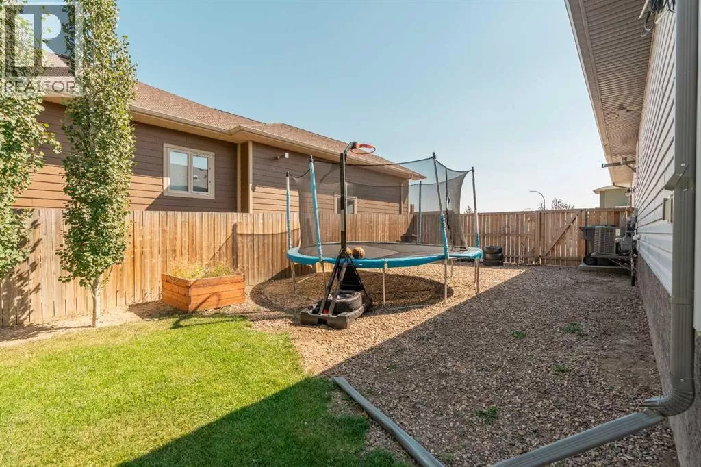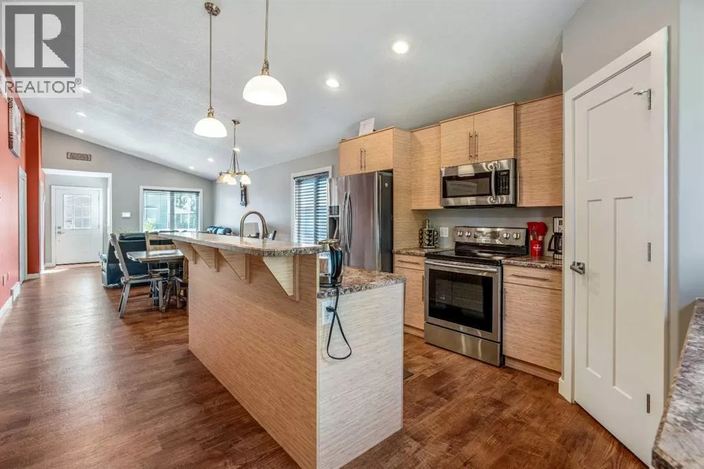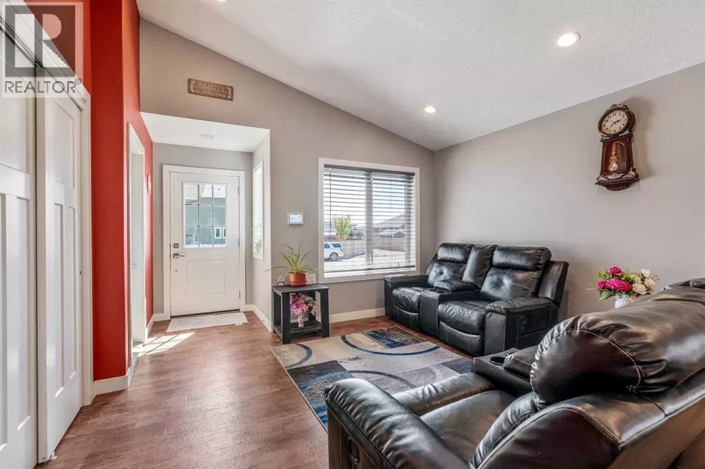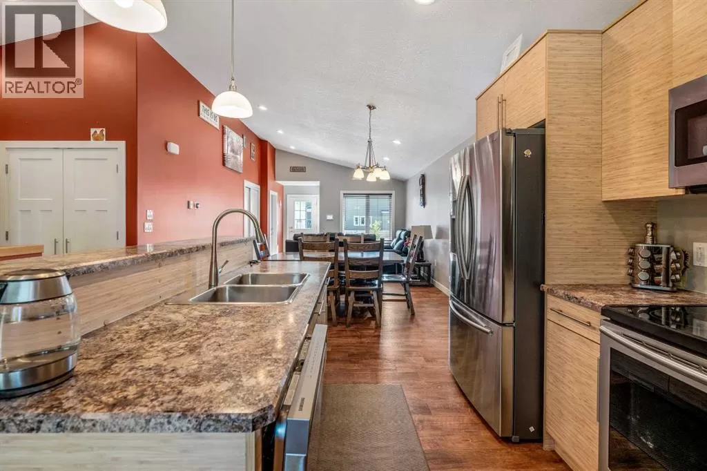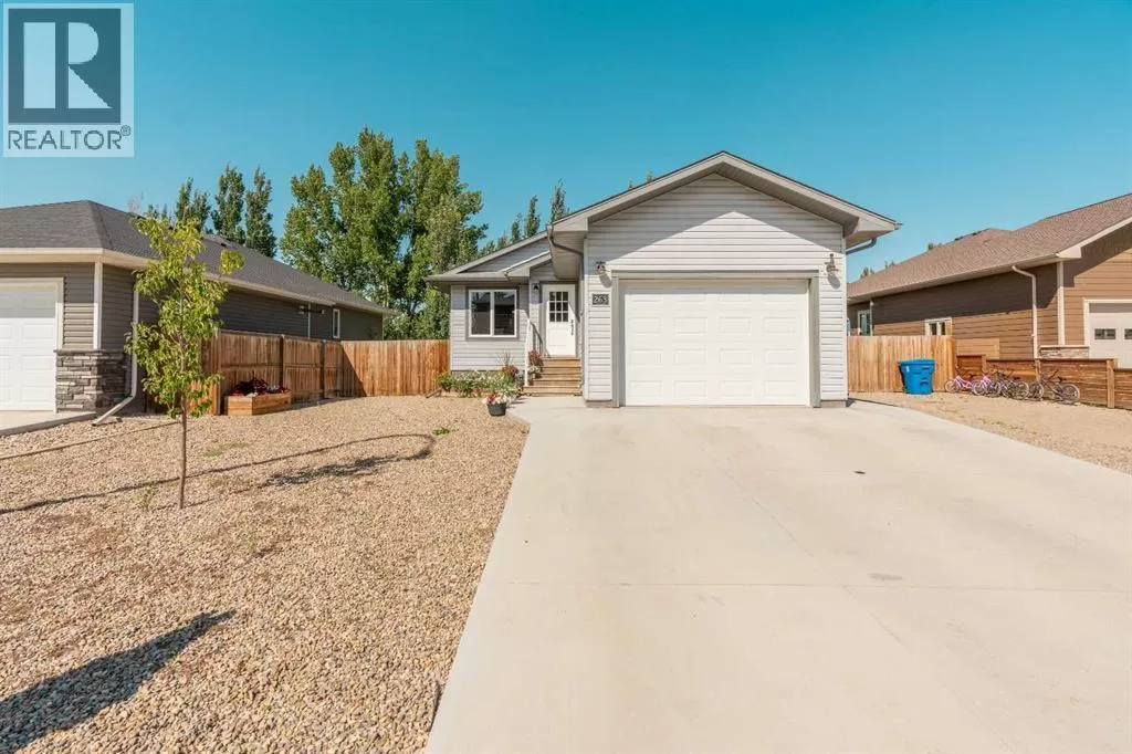 Welcome to this well-maintained home located in a newer neighborhood in Bow Island! Situated on a landscaped and fully fenced lot, this property features a super single attached garage and a gravel pad for convenient RV parking. Inside, the main floor boasts vaulted ceilings, pot lights, and stylish vinyl plank flooring throughout. The spacious kitchen offers, ample cabinetry, a pantry, and modern appliancesâperfect for both everyday living and entertaining. The finished basement includes a large bedroom, a dedicated office space, and a 3 piece bathroom. Additional highlights include a high-efficiency furnace with A/C and hot water on demand system, ensuring year-round comfort and energy savings. A fantastic opportunity to own a quality home in a growing communityâdonât miss out! (id:27476)