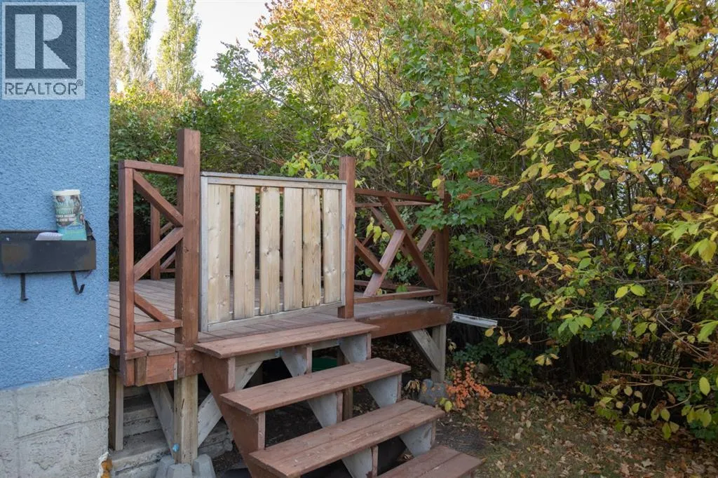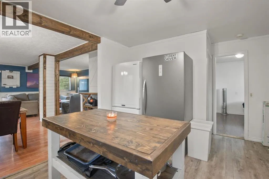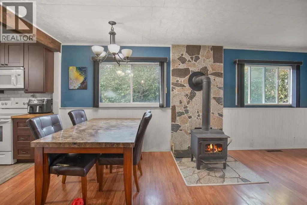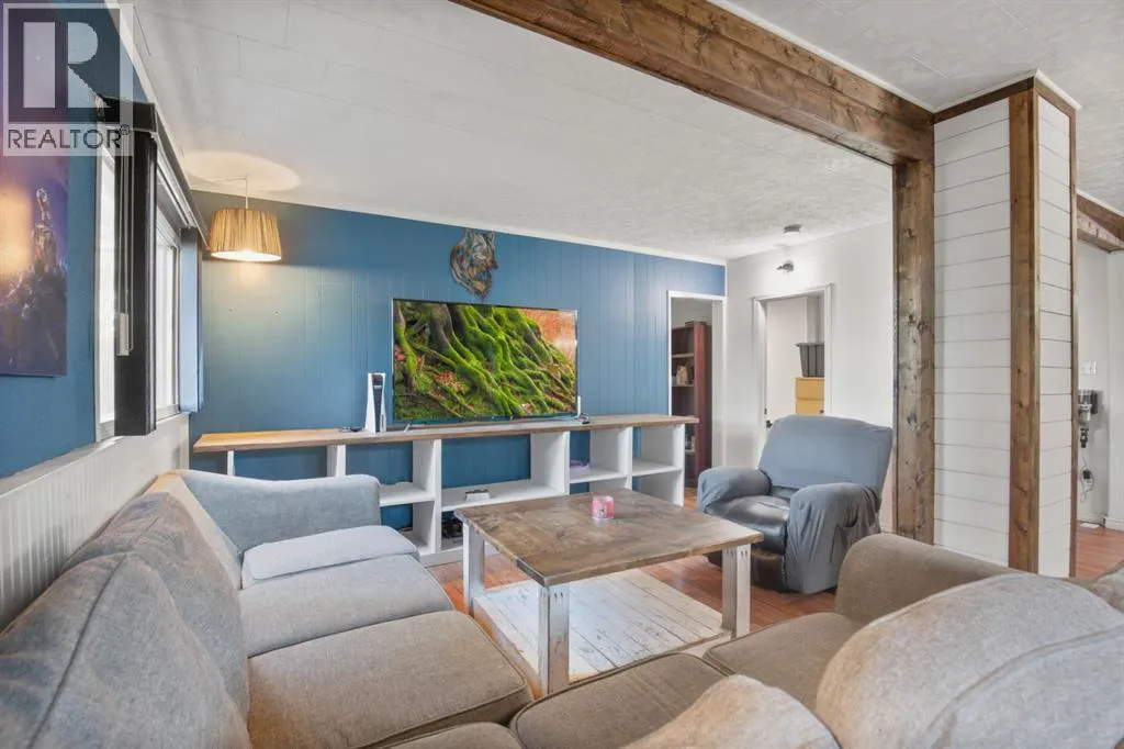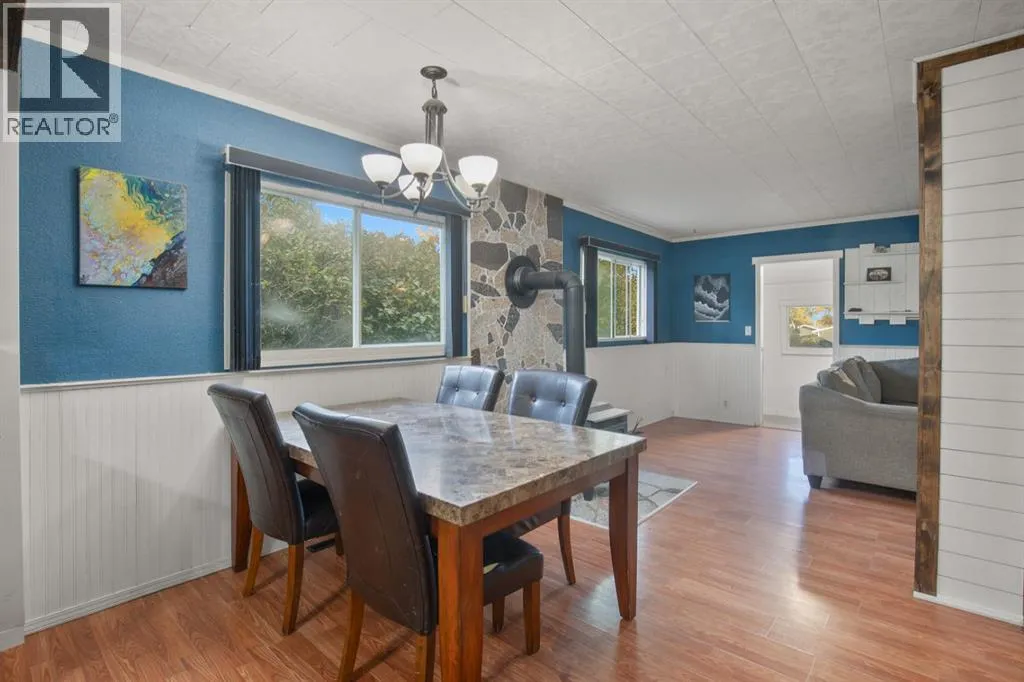 This charming 1946 bungalow blends timeless character with thoughtful modern updates, set on a spacious 6,000 sq ft lot in the heart of Bowden. Framed by mature hedges for privacy, the home welcomes you with a west-facing front deck and a generous entry foyer. Inside, the open-concept dining area flows into both the updated kitchen and cozy living room. Rustic wood beams and a wood-burning stove with a striking stone mosaic surround create a warm, inviting atmosphere.The kitchen features dark cabinetry, a modern white pantry, butcher-block countertops, a farmhouse sink, tile backsplash, a centre island, and an almost-new dishwasher. Three bedrooms, including a spacious primary, and a fully updated 4-piece bathroom complete the main floor. Recent updates include a new washer and dryer, new central vacuum system, re-shingled front porch, furnace servicing, and a new hot water tank. An upgraded electrical panel and service are also planned.Out back, a fully enclosed breezeway connects to a single detached garage and a large storage room. The south-facing backyard is fully fencedâideal for pets, gardening, or simply relaxing in the sun. A rear parking pad provides extra room for vehicles, a trailer, or RV. The durable metal roof on the main house adds long-term peace of mind, and the Bowden Golf Course is just a short walk away. A great opportunity for first-time buyers, investors, or anyone looking for a move-in-ready home with character, comfort, and lasting value. (id:27476)