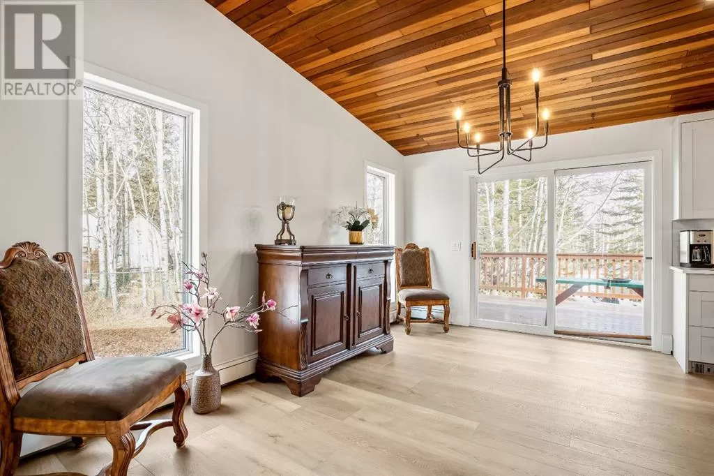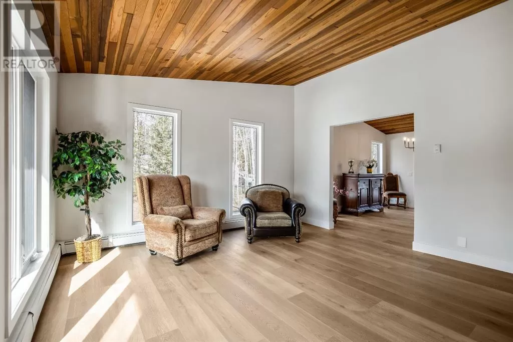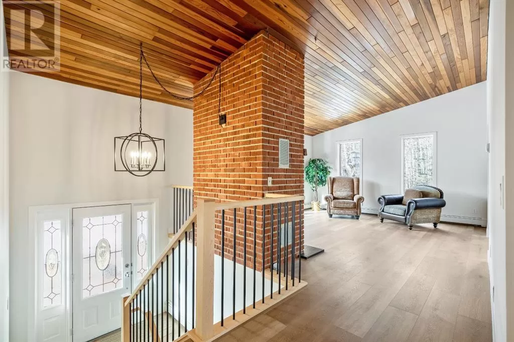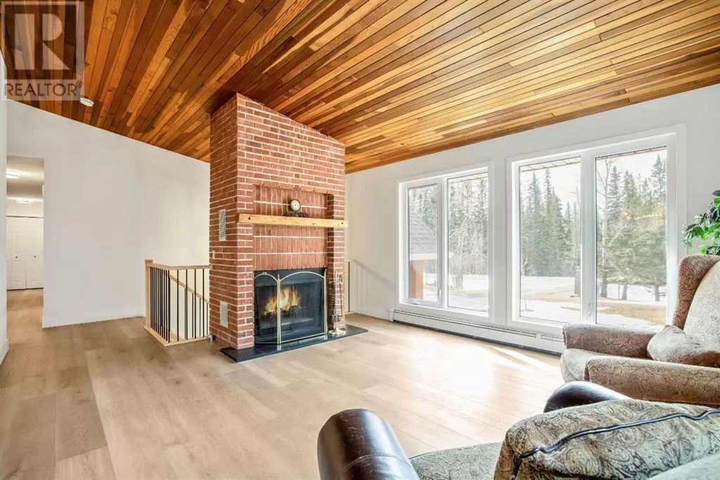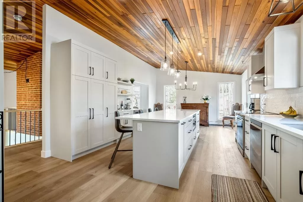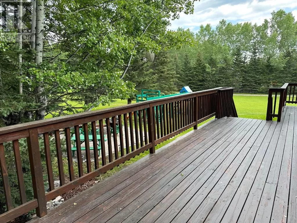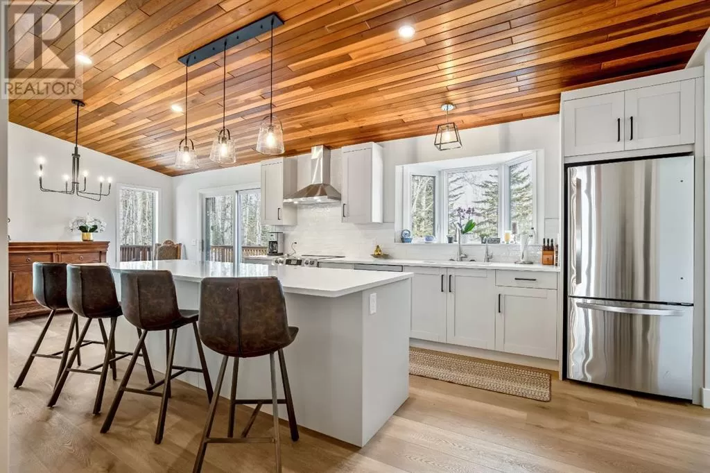 Bright and sunny home on 1.91 acres in West Bragg Creek. Only 3 kms from the hamlet of Bragg Creek and half way to the West Bragg Creek trail system. Three bedrooms upstairs with main floor laundry room. Fully finished basement with large windows. This house has a brand new face with major recent renovations including a new kitchen by Legacy Kitchens, shiny quartz counters, new hood fan, electrical slide in range, new dishwasher and beverage centre fridge, new upstairs bathrooms, new flooring upstairs and downstairs, all upstairs windows , except patio doors, replaced with new triple glazed windows and house repainted. Check out supplements for more details. Underdrive garage is heated. Country living is made easy with a community water and sewer system so no concerns here about wells and septic systems. One time membership fee of $500 and then $250 per month covers water and sewer costs. Ideal yard for kids and dogs. Children's slide and swings , BBQ patio with seating and a large dog run off back deck. All the things you need are included - all yard furniture, Gas BBQ on back deck and the ride on lawn tractor with it's 54" deck - ( "as is" condition ) to help maintain your park like yard. All you have to do is pack your bags and move in your furniture. (id:27476)