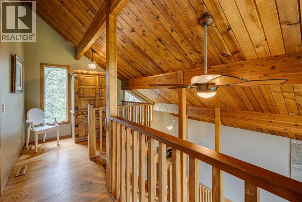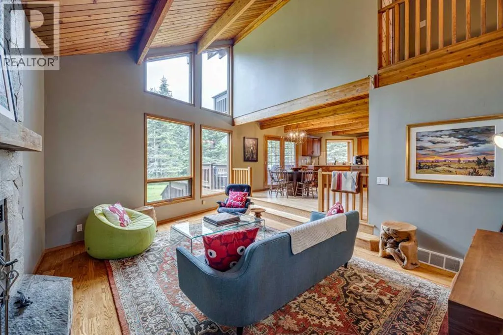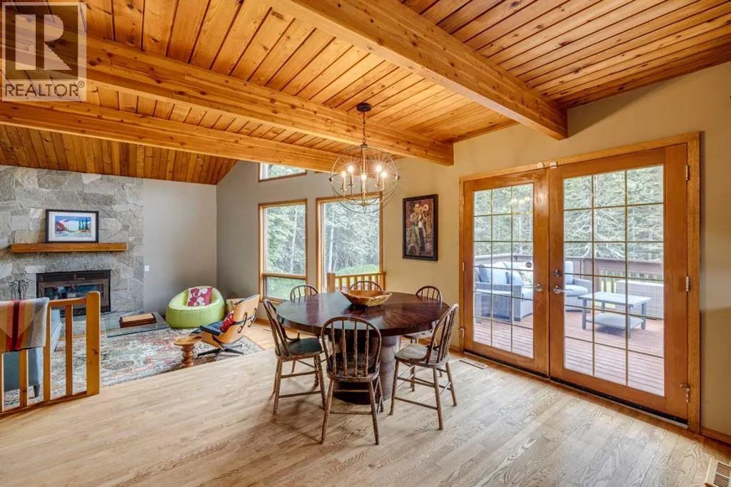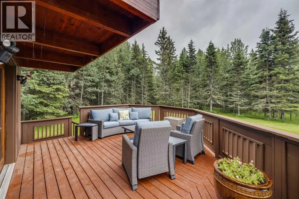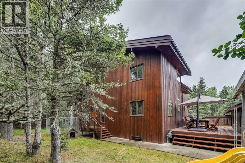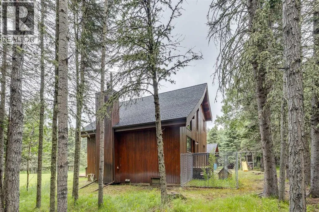 Tucked among the trees on a serene, S-shaped drive, this charming chalet-style home offers privacy, warmth, and an easy connection to nature, just minutes from the shops and cafes of Bragg Creek and an easy 25-minute drive to Calgary. With over 2,500 sq. ft. of living space, this home blends rustic character with thoughtful updates, designed for relaxed living and quiet inspiration. Step inside to a bright, reverse floor plan that makes the most of natural light and views. The open-concept main living area features vaulted, open-beam cedar ceilings and expansive windows framing the forest beyond. A stone-faced wood-burning fireplace anchors the space, perfect for cozy evenings after a day of exploring nearby trails. The kitchen offers both function and style with newer cabinetry, flooring, and a contemporary backsplash. French doors open to a large, sunny south-facing deck, an ideal outdoor living space for morning coffee, dining with friends, or simply breathing in the crisp mountain air. The main level includes a versatile bedroom or home office, a beautifully renovated full bathroom, and a convenient laundry room. Upstairs, the primary suite feels like a private retreat with its updated ensuite, walk-in closet, and a balcony overlooking treetops toward the Wintergreen ridge. A second bedroom with a half bath and an open loft area provide flexible space for guests, hobbies, or relaxation. The fully developed lower level offers a cozy family room with a gas fireplace, a spacious fourth bedroom currently set up as a craft room, another full bathroom, and ample storage. The oversized garage includes a third bay addition with a full subpanel and 220/50 amp wiring, ready for an EV, workshop, or hot tub, with an additional pad behind. Here, you can live close to nature while staying connected to everything you need. Enjoy golf at Wintergreen, endless recreation on the West Bragg Creek trail network, or adventures in Kananaskis, all just beyond your doorstep. (id:27476)