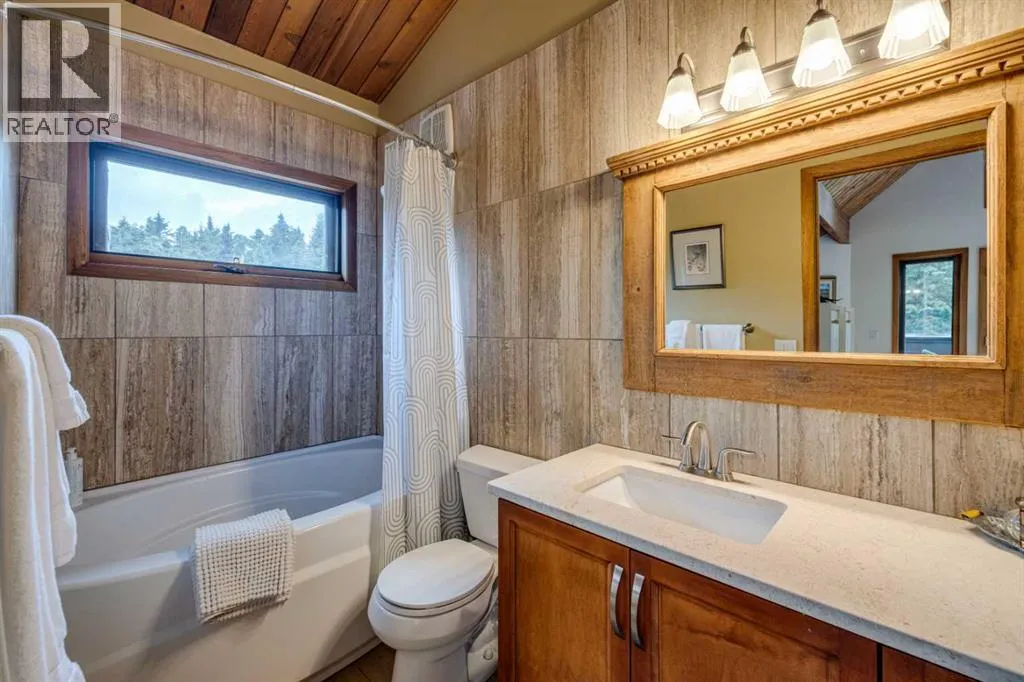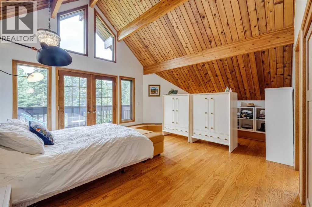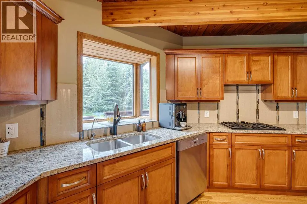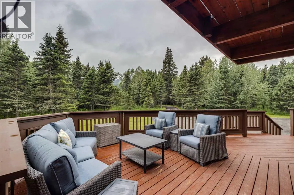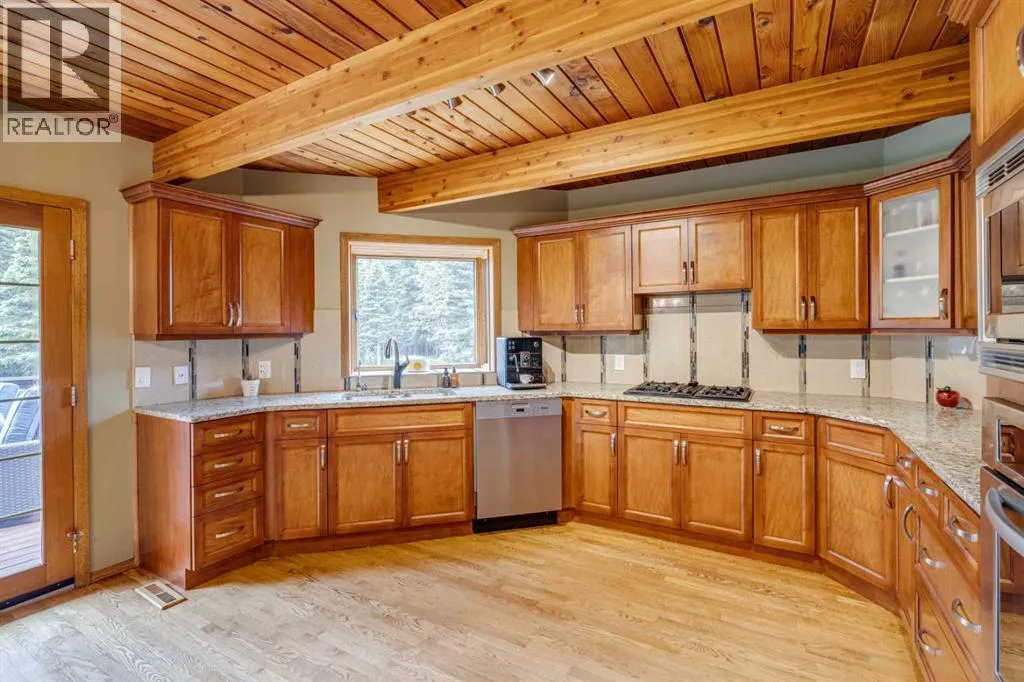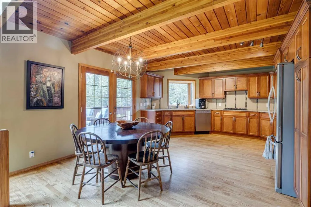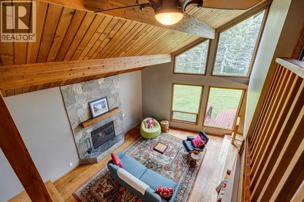 Tucked among the trees on a serene, S-shaped drive, this charming chalet-style home offers privacy, warmth, and an easy connection to nature, just minutes from the shops and cafes of Bragg Creek and an easy 25-minute drive to Calgary. With over 2,500 sq. ft. of living space, this home blends rustic character with thoughtful updates, designed for relaxed living and quiet inspiration. Step inside to a bright, reverse floor plan that makes the most of natural light and views. The open-concept main living area features vaulted, open-beam cedar ceilings and expansive windows framing the forest beyond. A stone-faced wood-burning fireplace anchors the space, perfect for cozy evenings after a day of exploring nearby trails. The kitchen offers both function and style with newer cabinetry, flooring, and a contemporary backsplash. French doors open to a large, sunny south-facing deck, an ideal outdoor living space for morning coffee, dining with friends, or simply breathing in the crisp mountain air. The main level includes a versatile bedroom or home office, a beautifully renovated full bathroom, and a convenient laundry room. Upstairs, the primary suite feels like a private retreat with its updated ensuite, walk-in closet, and a balcony overlooking treetops toward the Wintergreen ridge. A second bedroom with a half bath and an open loft area provide flexible space for guests, hobbies, or relaxation. The fully developed lower level offers a cozy family room with a gas fireplace, a spacious fourth bedroom currently set up as a craft room, another full bathroom, and ample storage. The oversized garage includes a third bay addition with a full subpanel and 220/50 amp wiring, ready for an EV, workshop, or hot tub, with an additional pad behind. Here, you can live close to nature while staying connected to everything you need. Enjoy golf at Wintergreen, endless recreation on the West Bragg Creek trail network, or adventures in Kananaskis, all just beyond your doorstep. (id:27476)