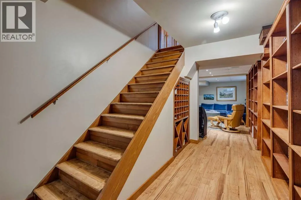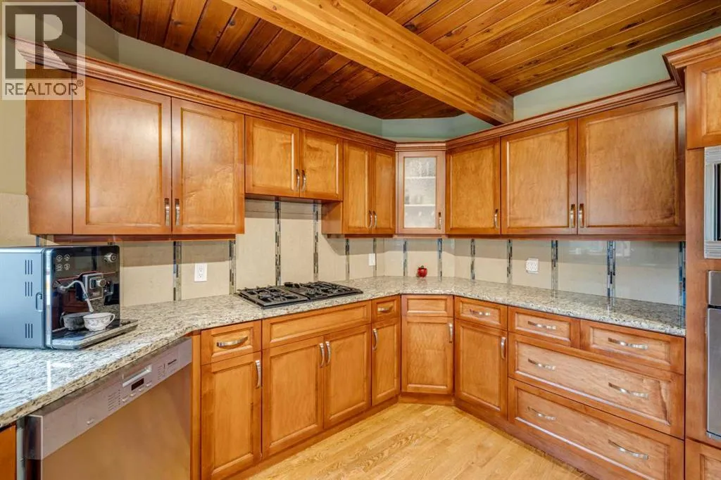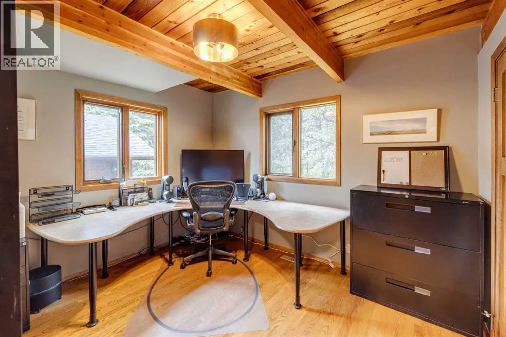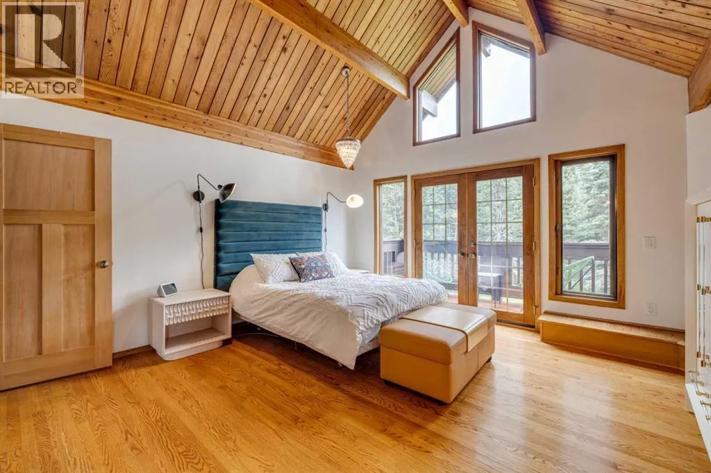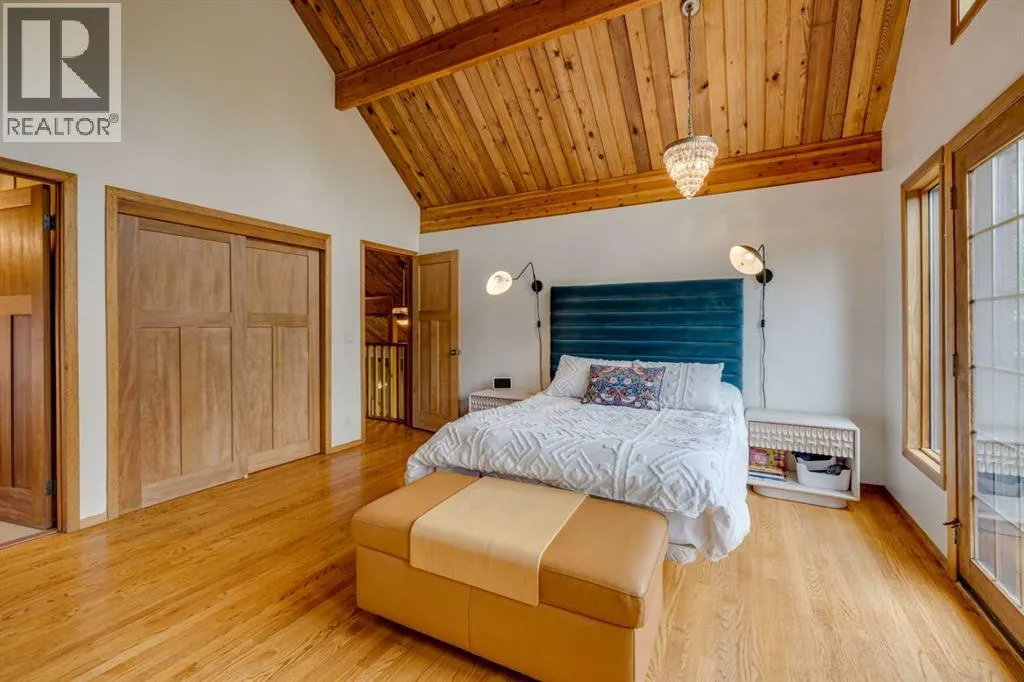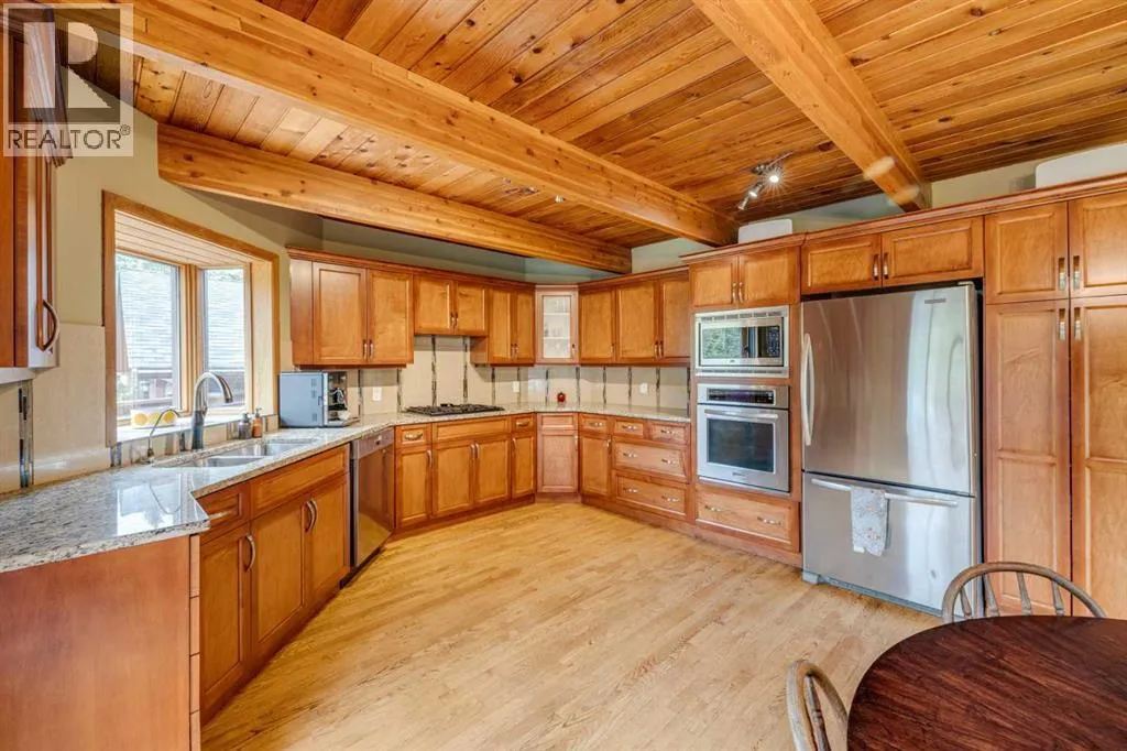 Tucked among the trees on a serene, S-shaped drive, this charming chalet-style home offers privacy, warmth, and an easy connection to nature, just minutes from the shops and cafes of Bragg Creek and an easy 25-minute drive to Calgary. With over 2,500 sq. ft. of living space, this home blends rustic character with thoughtful updates, designed for relaxed living and quiet inspiration. Step inside to a bright, reverse floor plan that makes the most of natural light and views. The open-concept main living area features vaulted, open-beam cedar ceilings and expansive windows framing the forest beyond. A stone-faced wood-burning fireplace anchors the space, perfect for cozy evenings after a day of exploring nearby trails. The kitchen offers both function and style with newer cabinetry, flooring, and a contemporary backsplash. French doors open to a large, sunny south-facing deck, an ideal outdoor living space for morning coffee, dining with friends, or simply breathing in the crisp mountain air. The main level includes a versatile bedroom or home office, a beautifully renovated full bathroom, and a convenient laundry room. Upstairs, the primary suite feels like a private retreat with its updated ensuite, walk-in closet, and a balcony overlooking treetops toward the Wintergreen ridge. A second bedroom with a half bath and an open loft area provide flexible space for guests, hobbies, or relaxation. The fully developed lower level offers a cozy family room with a gas fireplace, a spacious fourth bedroom currently set up as a craft room, another full bathroom, and ample storage. The oversized garage includes a third bay addition with a full subpanel and 220/50 amp wiring, ready for an EV, workshop, or hot tub, with an additional pad behind. Here, you can live close to nature while staying connected to everything you need. Enjoy golf at Wintergreen, endless recreation on the West Bragg Creek trail network, or adventures in Kananaskis, all just beyond your doorstep. (id:27476)