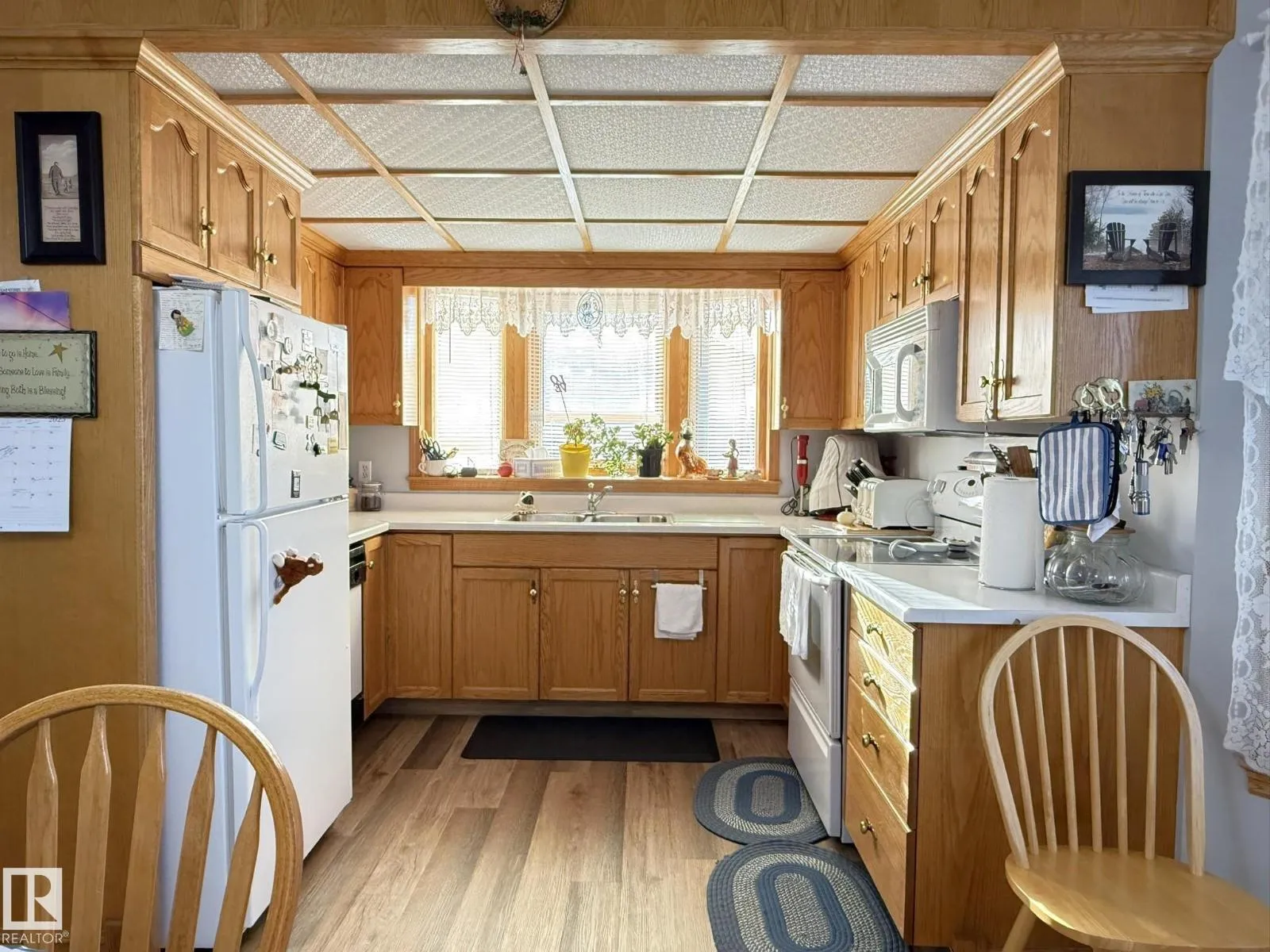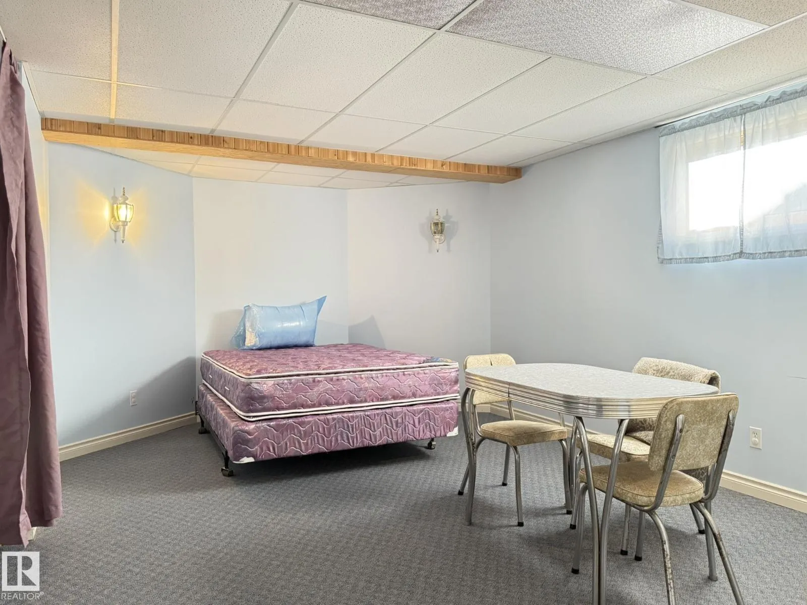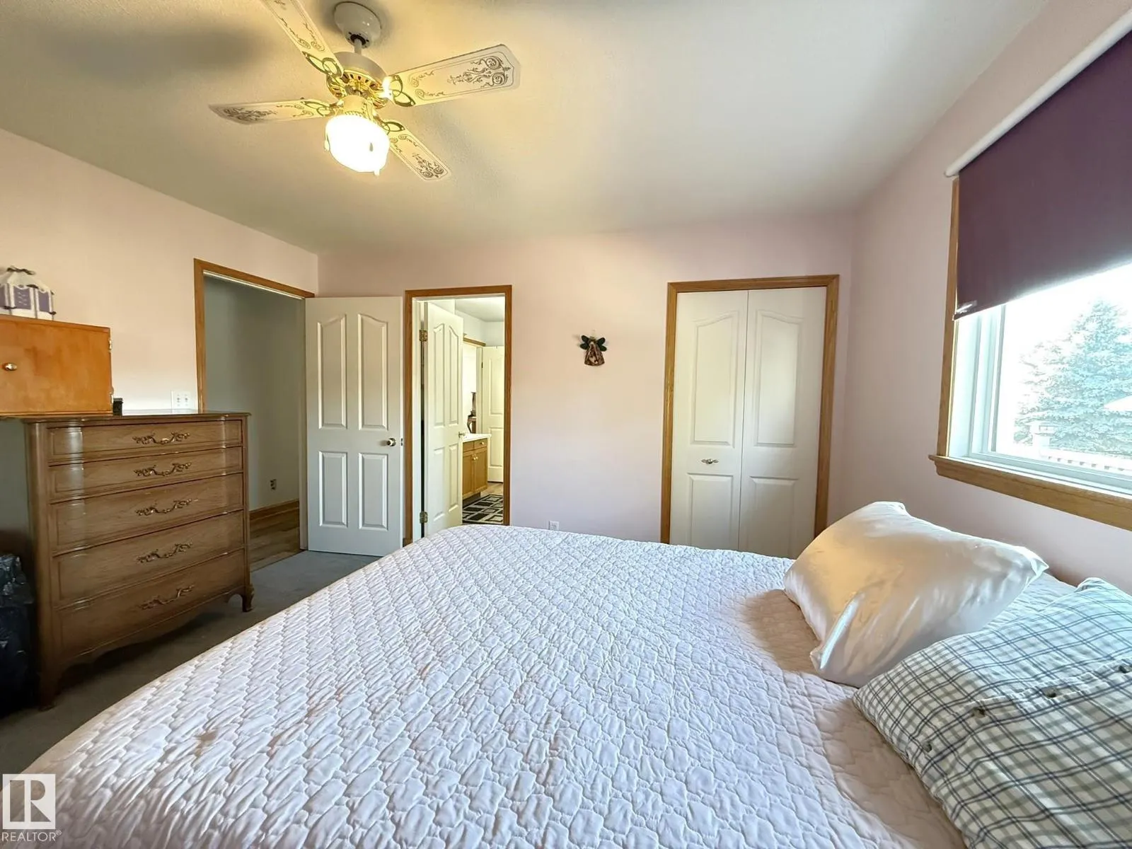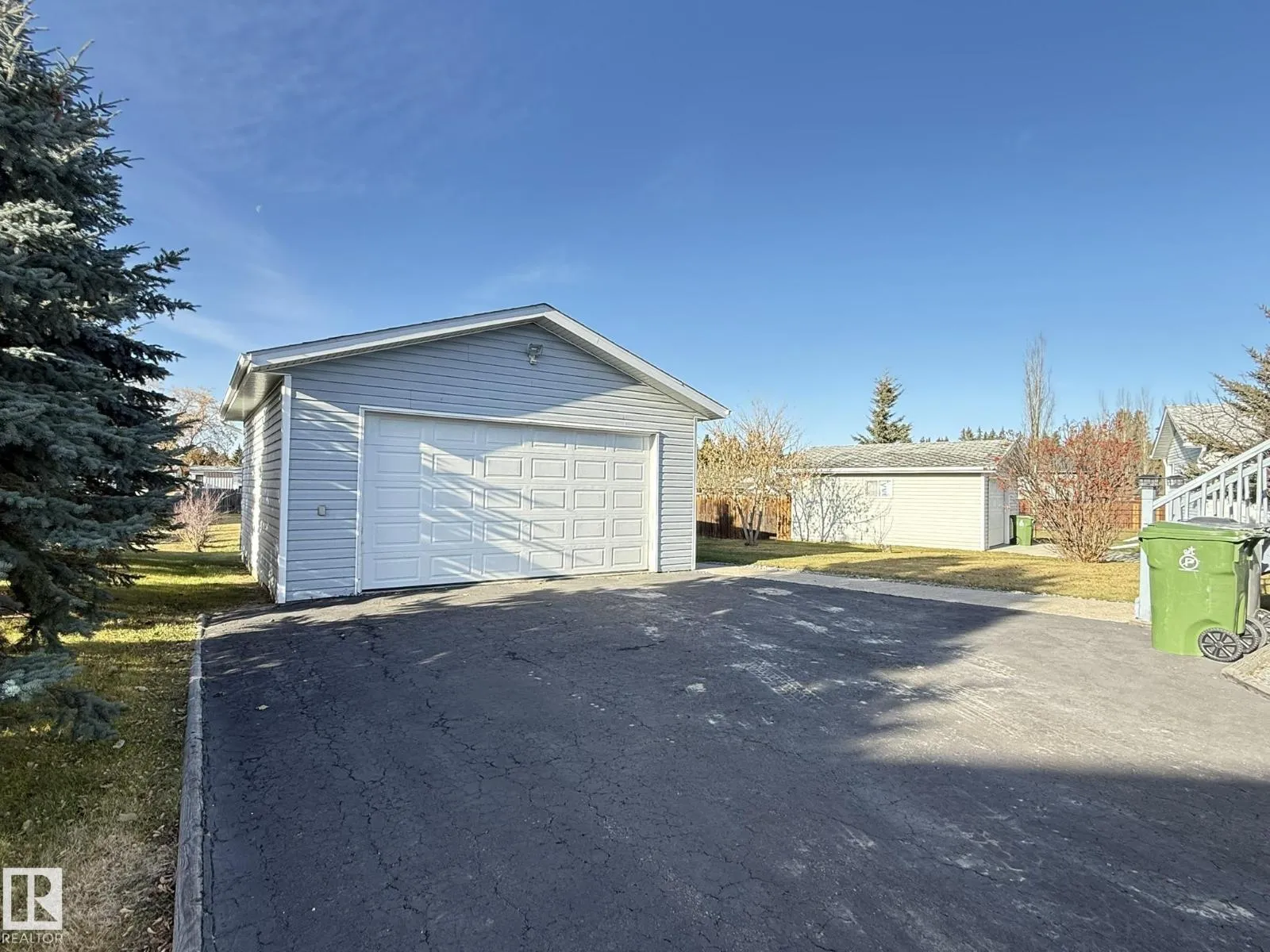 3 + 1 bedroom, 2 bathroom move in ready bungalow in the lovely town of Breton. This home has a large living room with bright East facing bay window perfect for entertaining with newer vinyl plank flooring open to the kitchen/dining with oak cabinets and a bay window over the sink. The main spacous bedroom has double closets and an ajoining bathroom. Two more bedrooms complete the level. Huge rec room in the basement, along with a very large bedroom complete with a jetted tub! Another 3 piece bathroom and separate laundry room with sink. This home has infloor heating, newer shingles, and boiler. 22x24' double garage is heated, wired for 220 and driveway is paved! (id:27476)