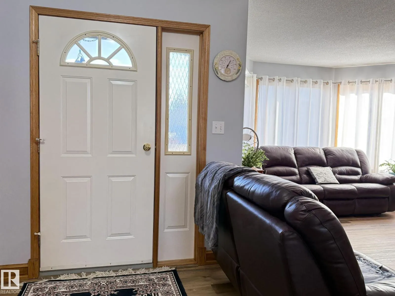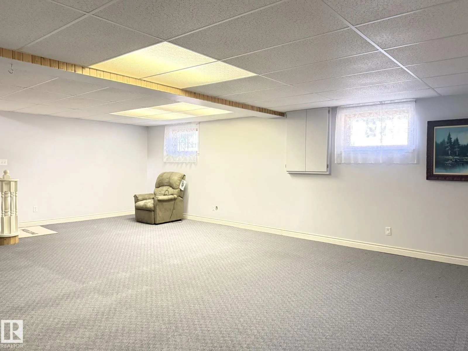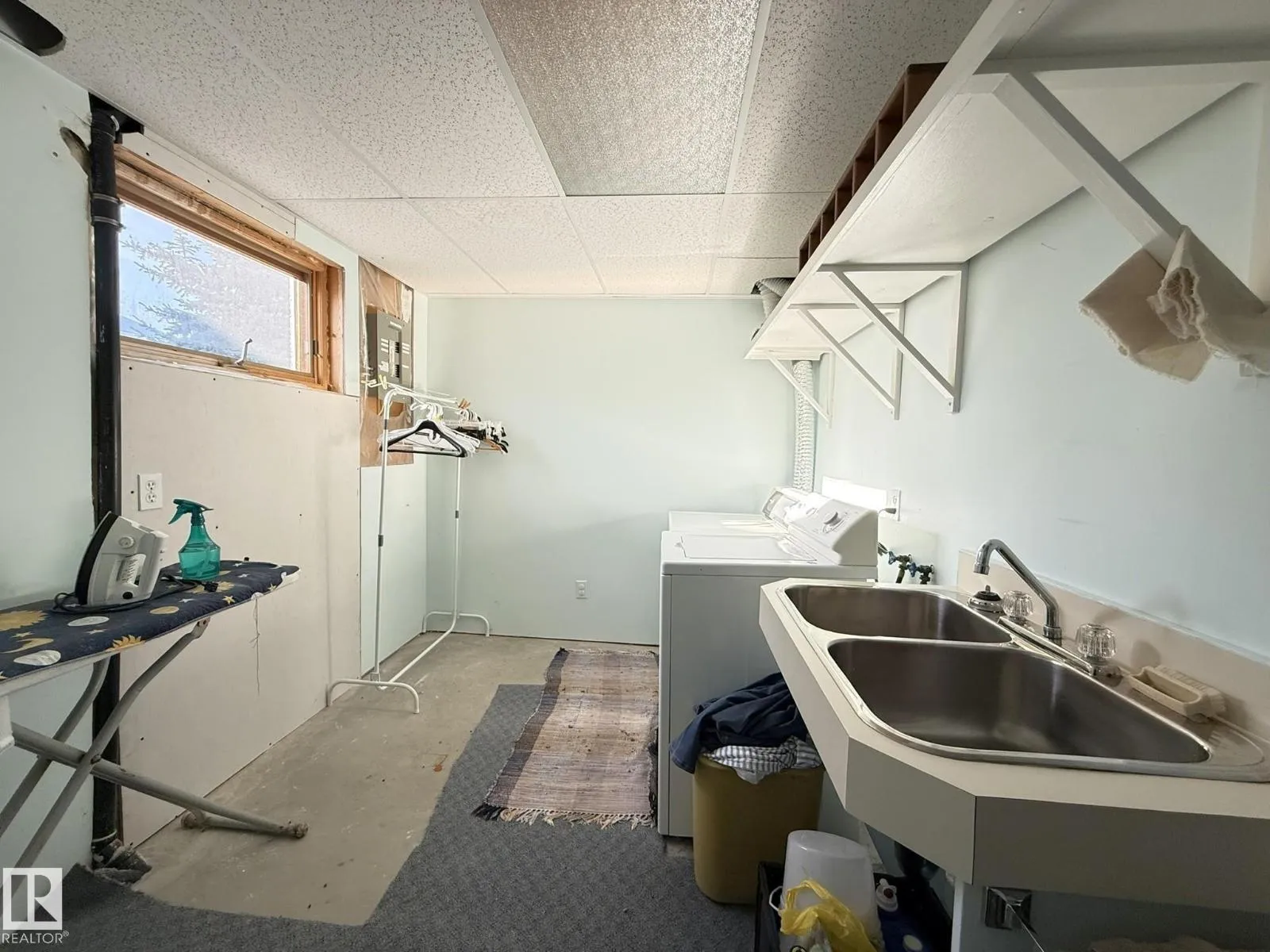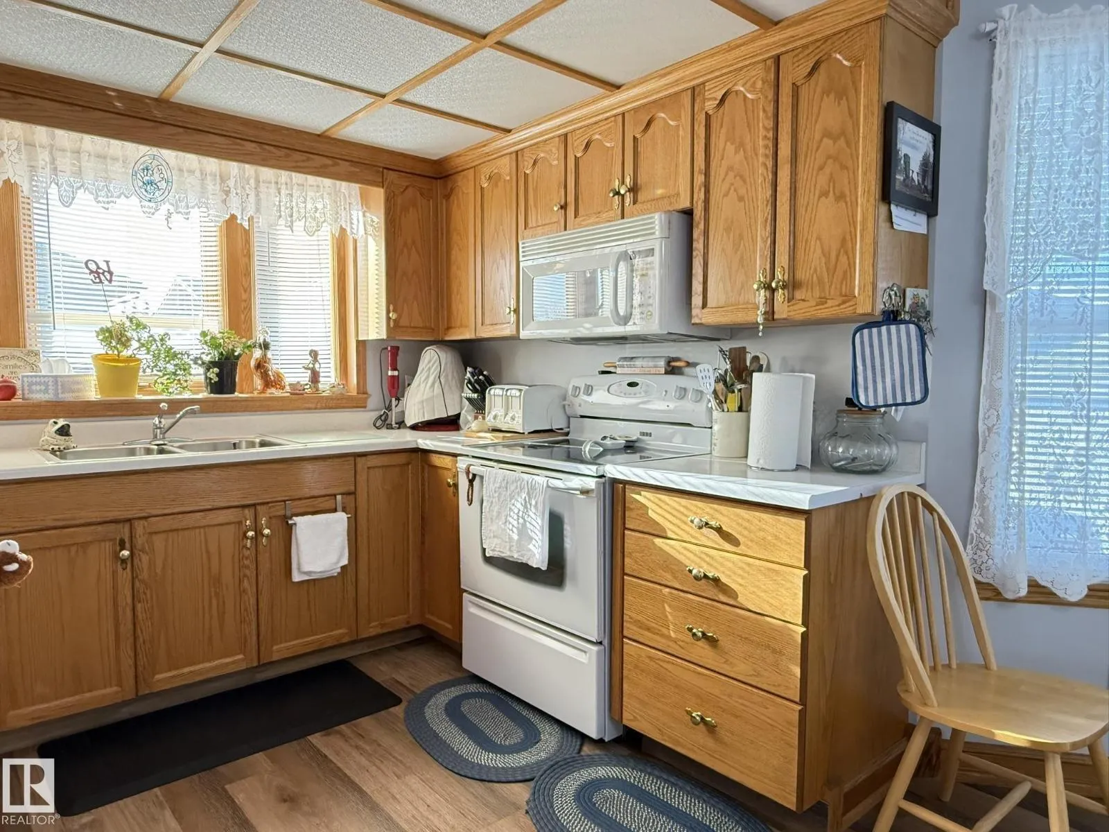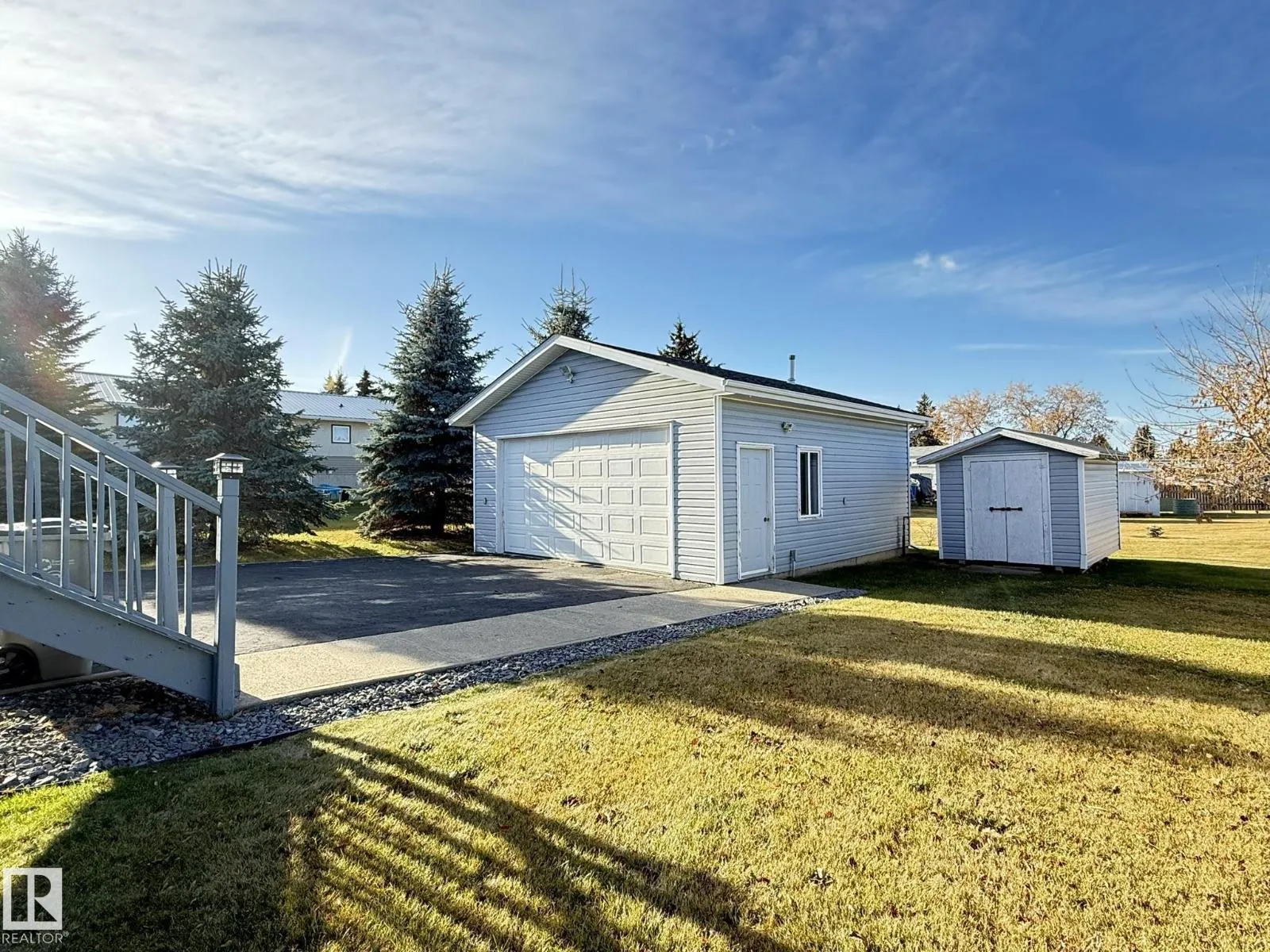 3 + 1 bedroom, 2 bathroom move in ready bungalow in the lovely town of Breton. This home has a large living room with bright East facing bay window perfect for entertaining with newer vinyl plank flooring open to the kitchen/dining with oak cabinets and a bay window over the sink. The main spacous bedroom has double closets and an ajoining bathroom. Two more bedrooms complete the level. Huge rec room in the basement, along with a very large bedroom complete with a jetted tub! Another 3 piece bathroom and separate laundry room with sink. This home has infloor heating, newer shingles, and boiler. 22x24' double garage is heated, wired for 220 and driveway is paved! (id:27476)
