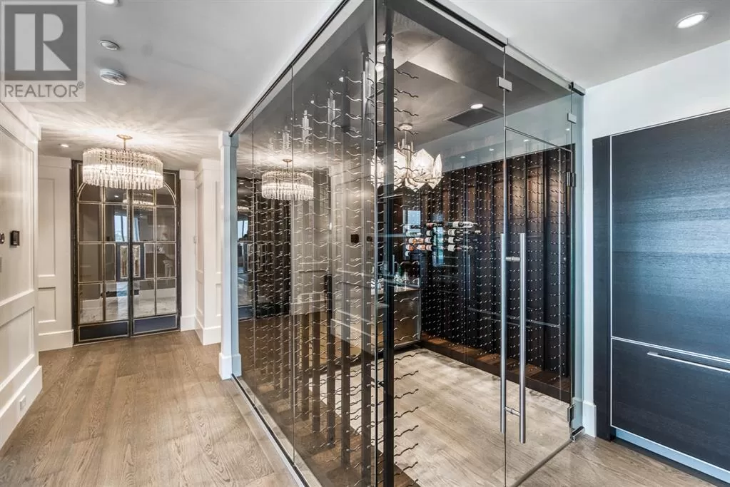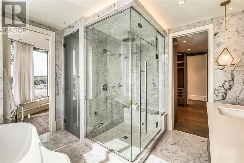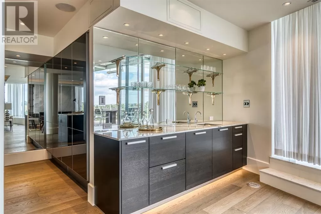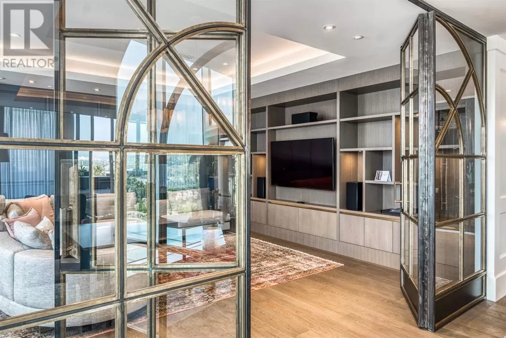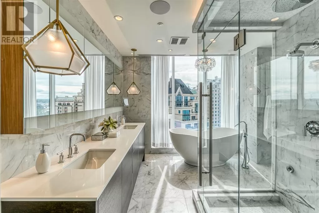 Enjoy spectacular waterfront sub-penthouse living with captivating panoramic views of the Bow River, Princeâs Island Park, downtown core, and vistas of the Rocky Mountains. Showcasing a full multi-million dollar Reno by Empire Custom Homes, this is truly the best and BIGGEST unit in The Concord and is the epitome of luxury. Not often do you find a condo unit with titled parking 4-CAR PRIVATE GARAGE with custom cabinetry and room for lifts. Best garage allocation for size and location. Grand open layout surrounded by floor-to-ceiling windows, marble throughout, and the finest finishings including new interior solid wood doors, custom hand forged iron detailing on doors, quality oak trim and wall treatments, automated blinds, and lavish fixtures. Porsche designed kitchen is sleek offering smooth carbon fibre cabinetry, marble counters, high-end Miele appliance package. Custom temperature controlled glass wine room located off the kitchen will surely impress your guests. Entertaining is a breeze with the open living and dining room allowing guests to mingle without feeling crowded. Marble full length steps up to your oversized outdoor living space featuring an outdoor BBQ kitchen and two gas lines for fire pit table hook-up. The views will leave you in awe as you relax with a glass of wine after a long day. Hand-forged iron french doors provide a chic Parisian feel opening up to your secluded media room with built-in shelving. Sophisticated master features show stopping views, access to the expansive deck, built-in feature wall, and an elegant spa-like bathroom featuring marble walls and floors, warmed by an in-floor heating system. Master closet is a true dream with custom cabinets, and built-in hampers. Second bedroom is light and airy and is equipped with its own walk-in closet and ensuite. A beautiful den showcases rich wood floor to ceiling custom panelled oak and automatic drapes. Amenities are endless and include 24hr concierge and security, summer water garden, winter skating rink, lounge, kitchen, full fitness facility and car washes. Constructed with long-lasting concrete, double glazed windows and a superior infrastructure designed for flood & emergency preparedness. Located mere steps to the Peace Bridge, Prince's Island Park, River Pathway System, and downtown. Urban luxury living at its finest! (id:27476)