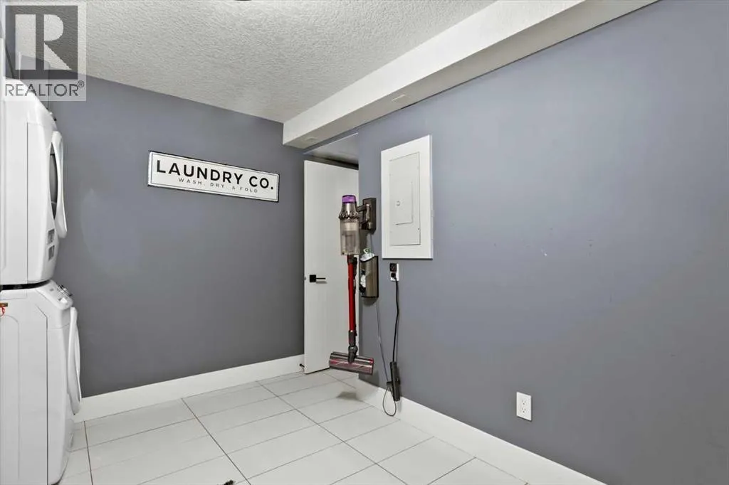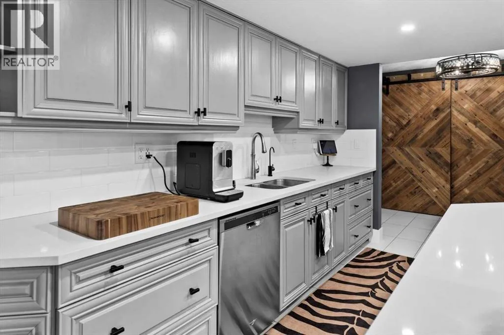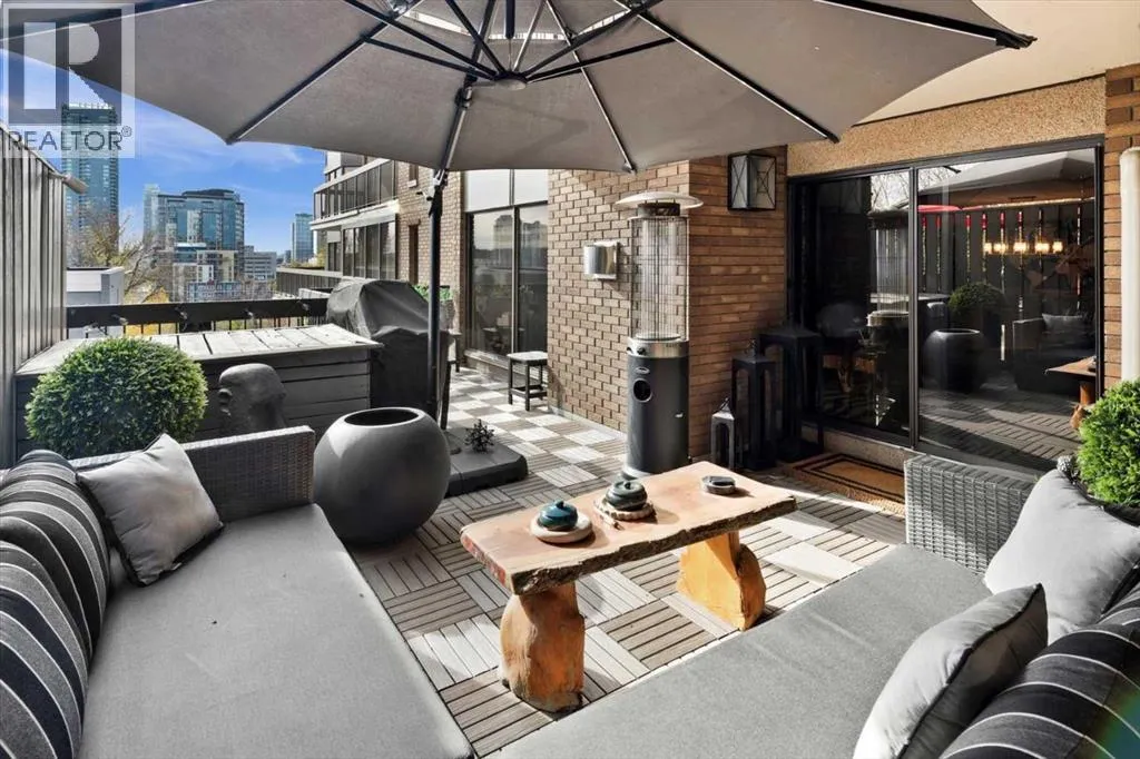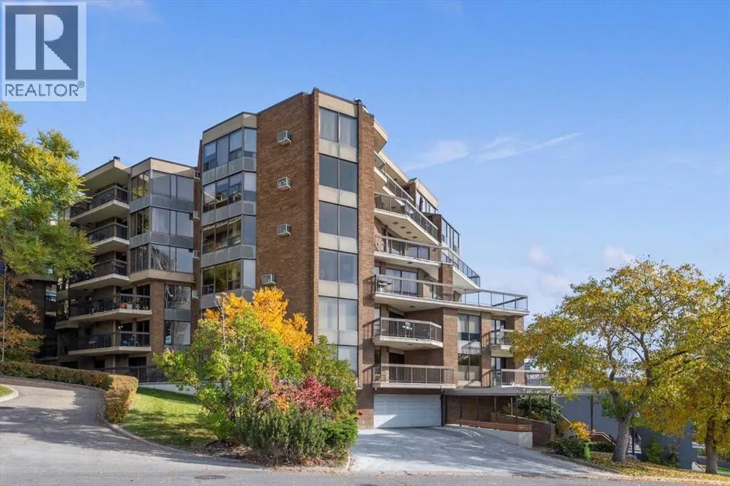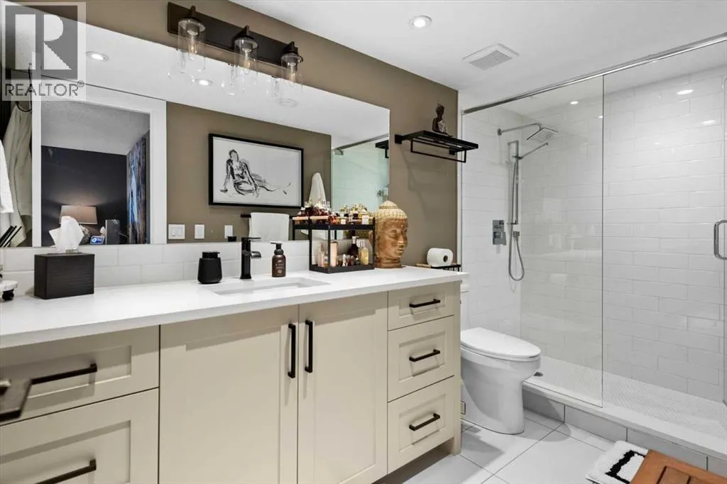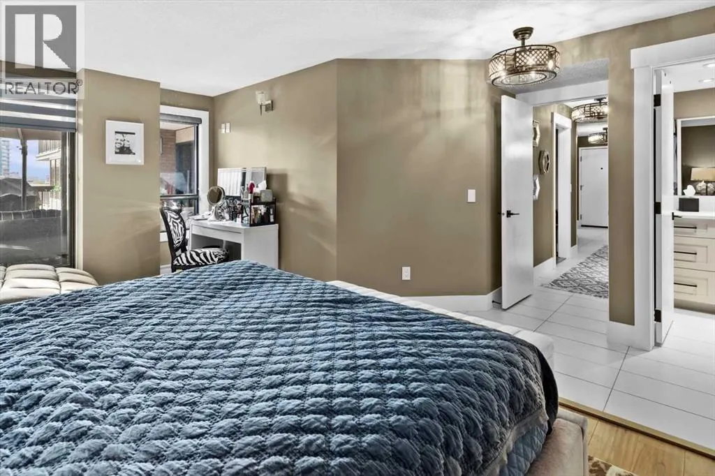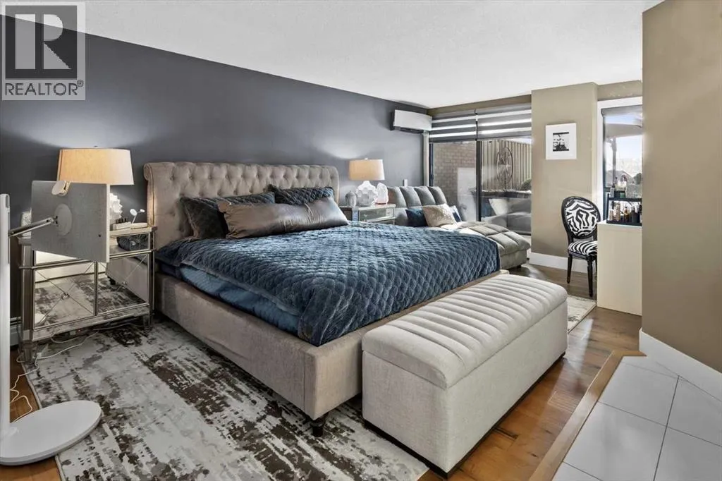 SUBSTANTIALLY REDUCED . WHAT A LOCATION ! Just one block from Calgary's river pathways and walking distance to Downtown. This large exquisite apartment offers a sophisticated retreat with downtown views. Thoughtfully designed for those seeking elegance and comfort in this spacious unit. The attention to detail enhanced with custom finishes are showcased throughout this home. From the open foyer featuring stunning barn doors, through to the expansive kitchen with quartz counters and seamlessly flows to living and dinning area that expansive nature is wonderful for hosting those memorable events at home. The inviting living room has large bright east facing windows with motorized Zebra blinds, a central remote controlled gas fireplace cased in stone with a large mantle perfect for relaxing and has sliding doors to an oversized balcony that has new composite tiles for comfort. The Primary bedroom offers a spa like experience with access to the balcony. The room can be bright or darkened for your relaxation needs. There is a large walk in custom closet, an updated en suite bathroom . The second bedroom/office which is also a generous size, a large laundry room / storage / hobby area. Additional features of this home are new triple head Daiken air conditioning units which come with a life warranty with an annual mtc fee, a secondary storage area, new engineered hardwood floors, updated faucets, updated lighting, motorized blinds. The concrete construction ensures a noise free environment and layout gives a feel of privacy from neighbors. The building has underground parking, a recently updated lobby, exercise room and social room with wet bar and pool table that is available for booking larger groups, an recently update exterior entrance. Please note that dogs are only permitted if either a service animal or companion status. (id:27476)